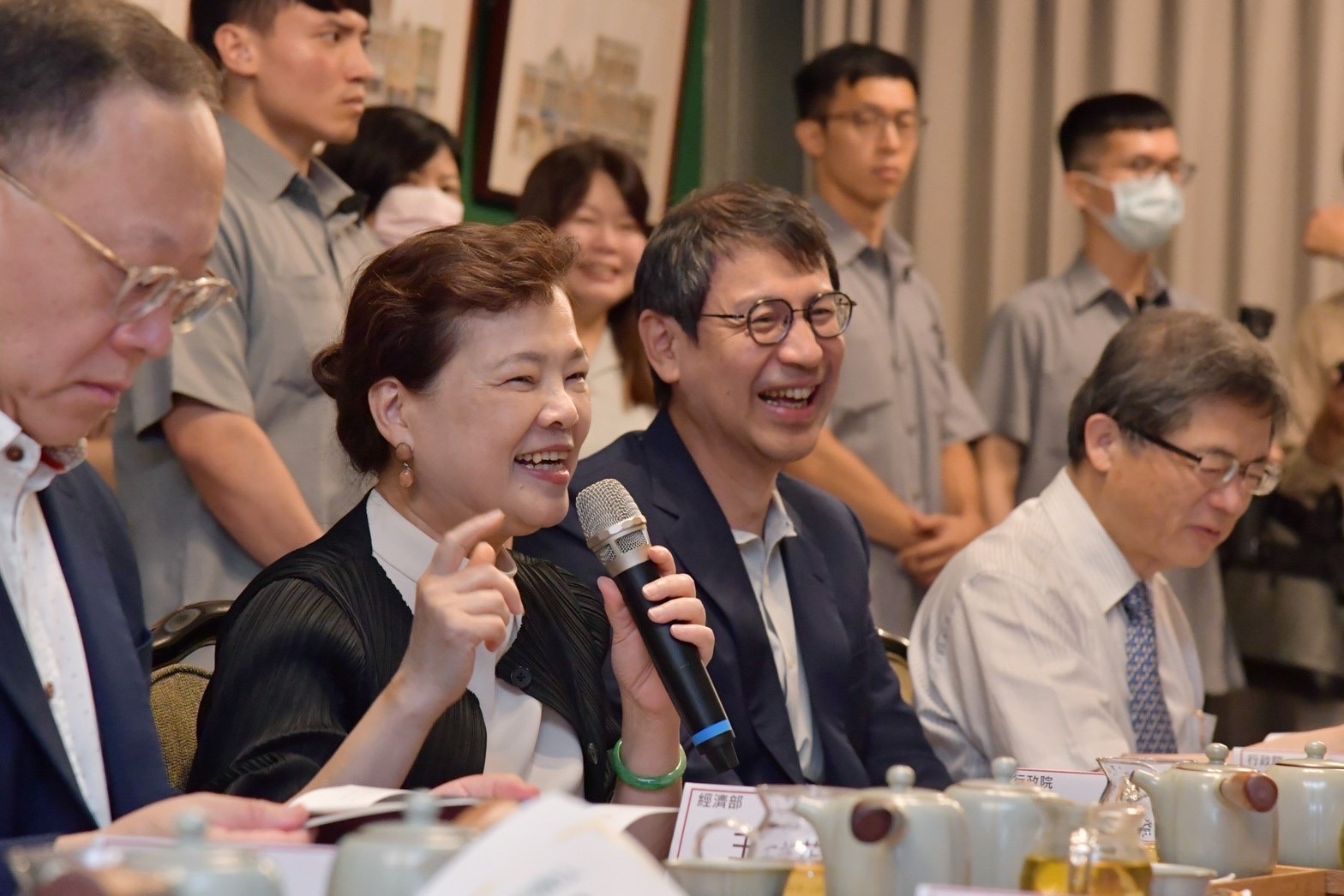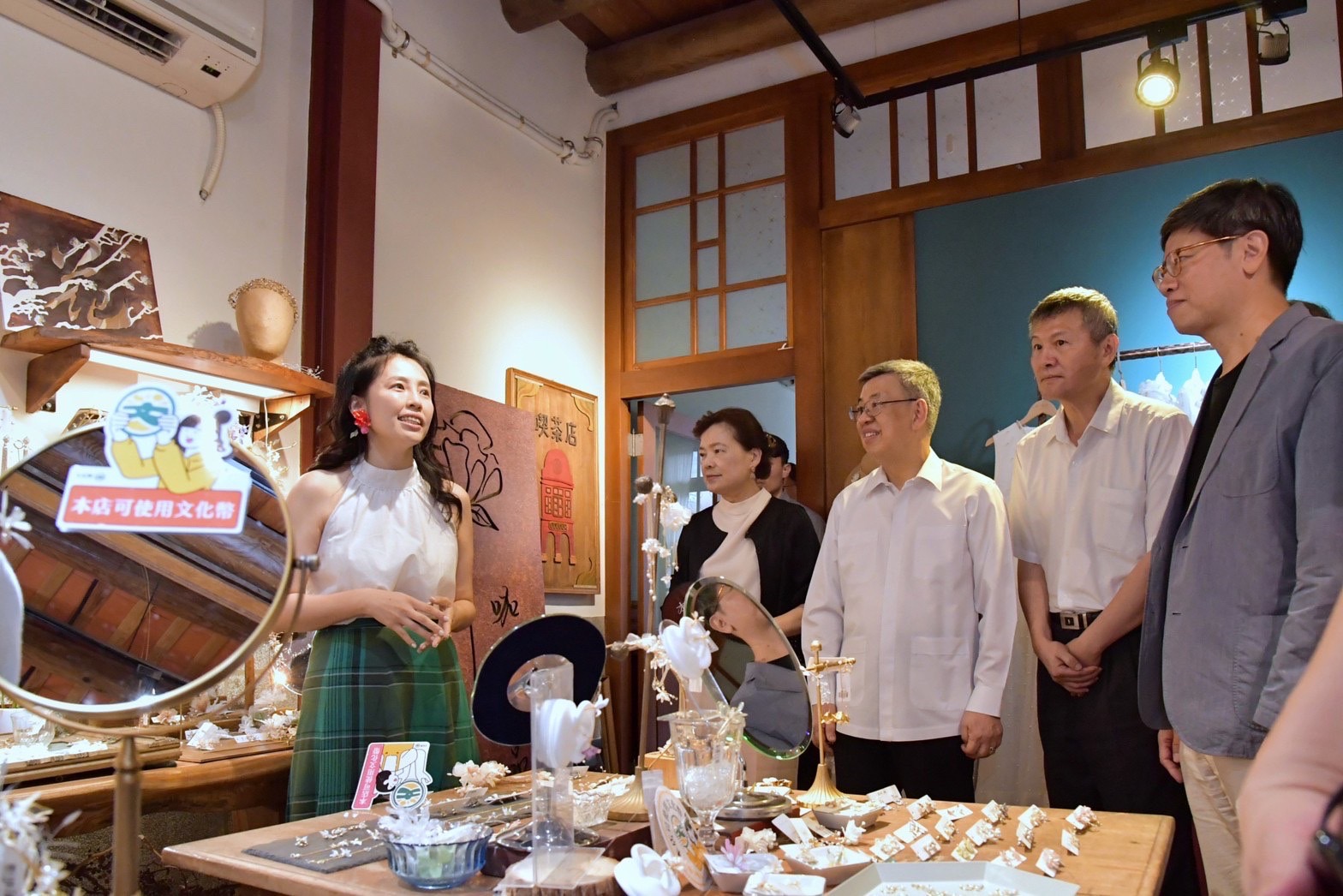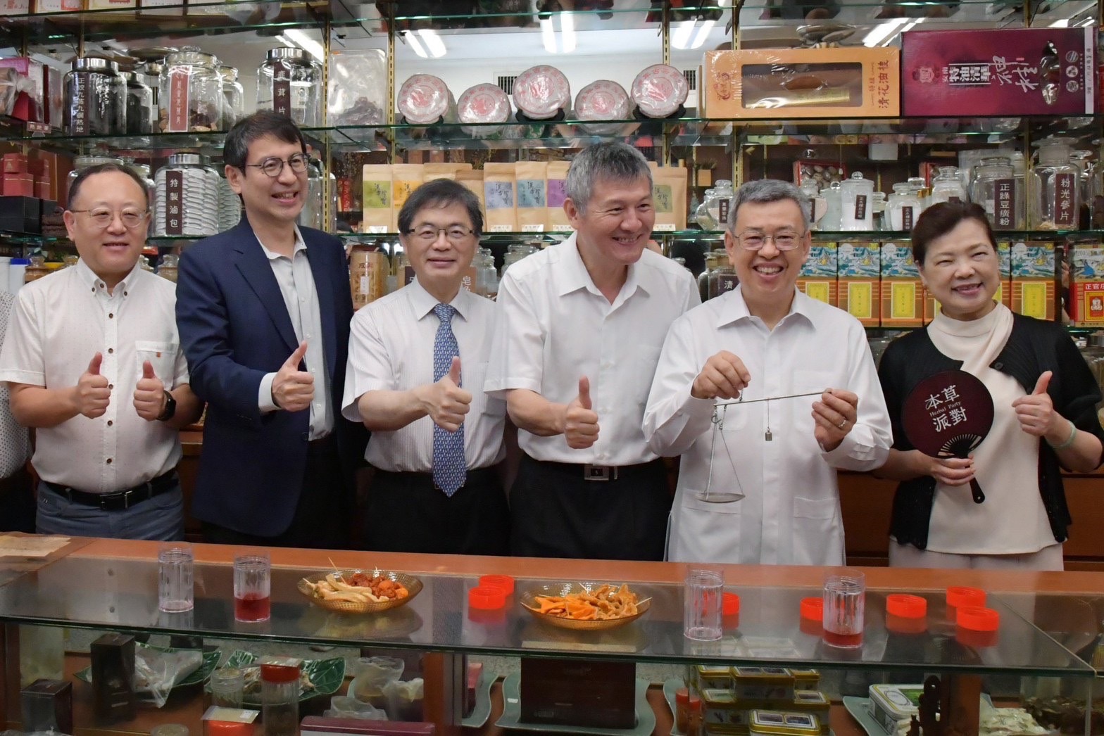 致詞結束後,陳院長與行政院李孟諺秘書長、林子倫發言人、經濟部王美花部長、文化部史哲部長、臺北市政府李泰興秘書長、「臺北迪化商圈發展促進會」徐慶棋理事長等人,分別手持「本草派對」紙扇及「青年席位回饋100點」手板比讚合影留念;隨後,一行人在徐慶棋理事長的引導下參訪「聯通漢芳」,品嚐店家自製的綜合玫瑰風味水果茶,以及參訪文化幣藝文消費點「豊泊荷•春花」,店內並擺設許多年輕人喜愛的手工飾品。