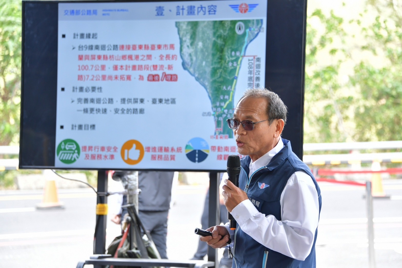 陳院長抵達後,首先聽取交通部公路局林聰利副局長工程簡報,了解本次拓寬工程概況。台9線南迴公路全長約100.7公里,連接臺東縣臺東市馬蘭與屏東縣枋山鄉楓港之間,目前僅雙流至新路之間7.2公里路段尚無拓寬計畫,將透過「雙流-新路拓寬工程」布設雙向四車道,車道各3.25公尺寬,同時建置1.5公尺慢車道及0.5公尺路肩,提供屏東、臺東地區一條更快速的中長程旅次運輸廊帶,也可降低交通肇事率,給民眾一條安全回家的路。致詞結束後,院長與行政院林子倫發言人、南部聯合服務中心陳文亮副執行長、屏東縣周春米縣長、伍麗華立法委員等人進行現地視察,由公路局南區養護工程分局陳貴芳分局長進行解說,了解本工程施工進度及效益。