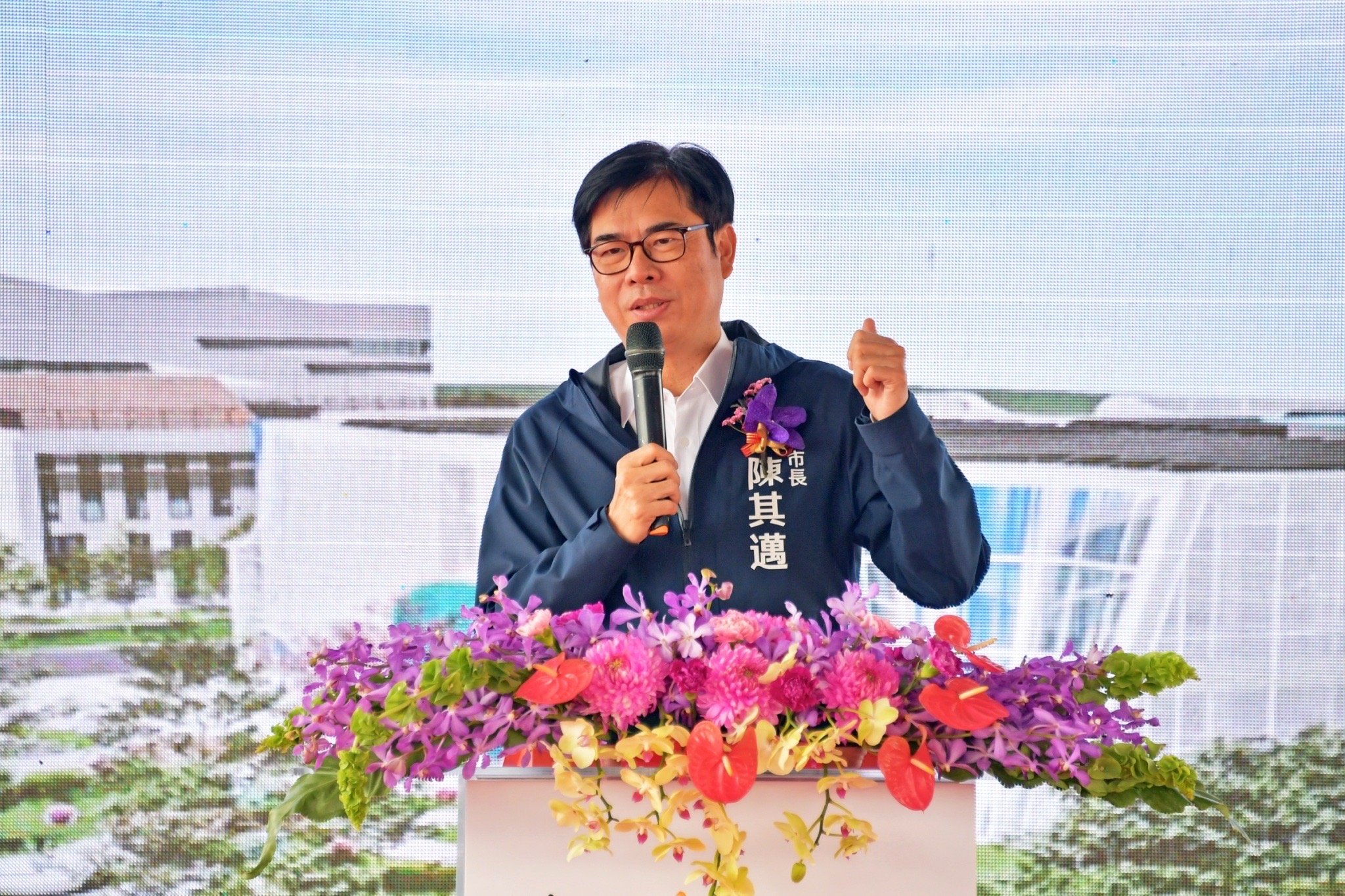 陳院長表示,陳其邁市長不僅認真打拚,更有高瞻遠矚、前瞻規劃的思維,自上任後,積極招商引資,行政院近年推動投資臺灣三大方案,目前核准的投資金額已超過2兆元,其中高雄即占近3千億元。此外,陳市長亦積極推動高雄產業轉型,持續朝高科技、智慧化、低碳化的方向發展,並努力爭取台積電在高雄設廠,不僅成功促成台積電進駐楠梓產業園區一期園區,台積電半導體材料供應商-美商英特格(Entegris)公司日前也在高雄建置全球最大製造基地。陳院長也宣布「臺灣碳權交易所」將於高雄設立總公司,相信未來將吸引更多公司到高雄投資。