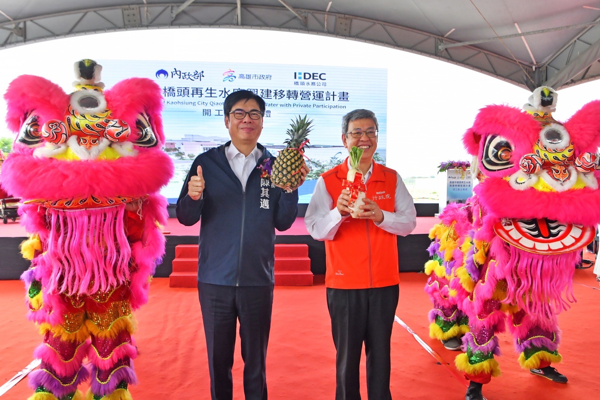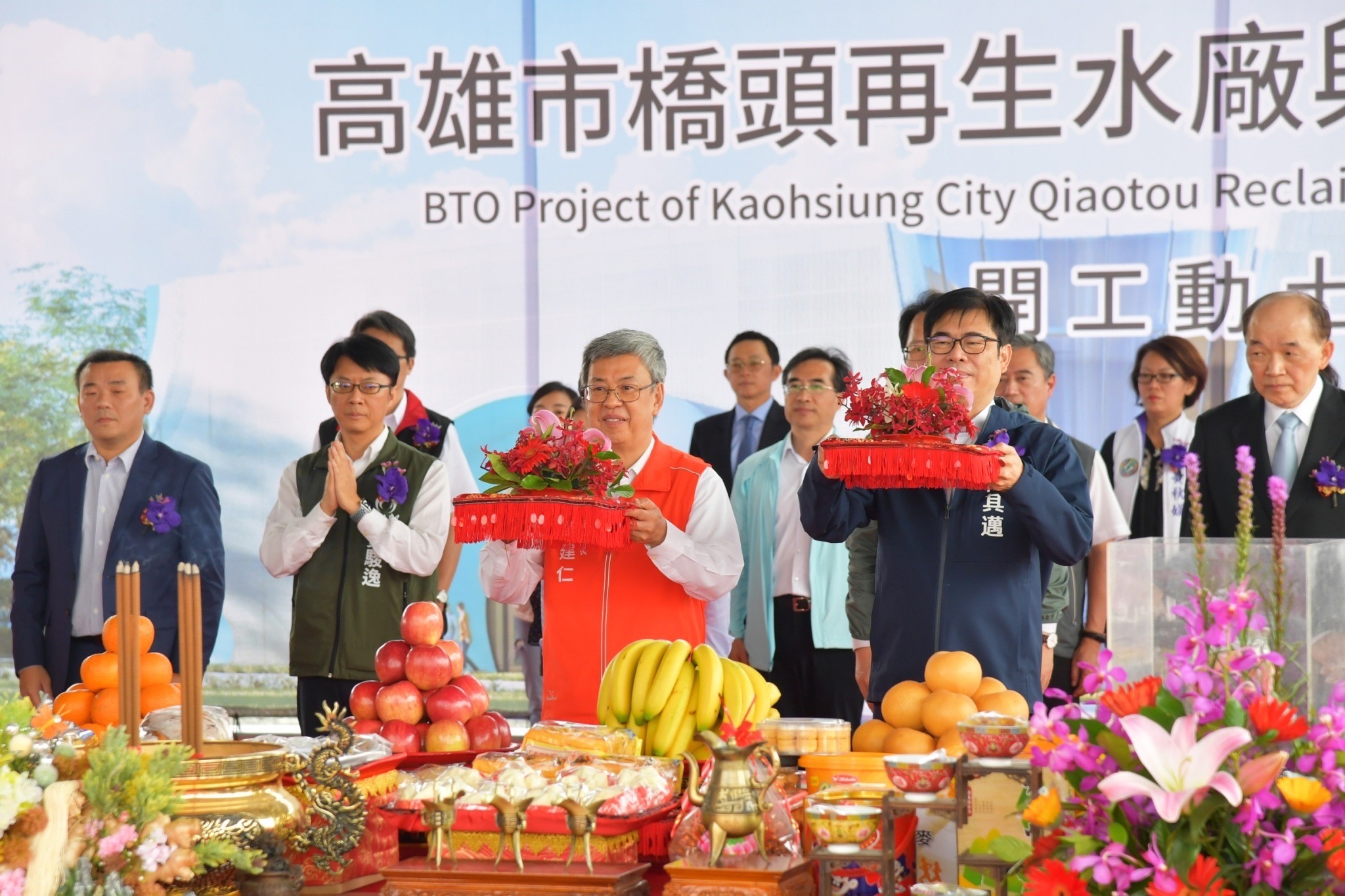 行政院長陳建仁今(12)日前往高雄市出席「橋頭再生水廠興建移轉營運計畫」開工動土典禮時表示,陳其邁市長上任後,積極招商引資及推動高雄產業轉型,持續朝高科技、智慧化、低碳化的方向發展,並成功爭取台積電、美商半導體材料公司英特格(Entegris)在高雄設廠。政府也透過興建再生水廠,積極解決高科技產業用水需求,未來橋頭再生水廠完工後,將全數供應進駐楠梓產業園區的廠商使用,至盼該工程能夠如期如質完工,進一步帶動高雄整體產業發展。