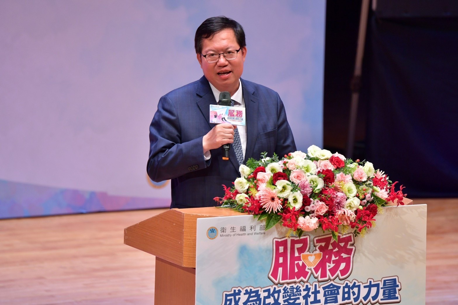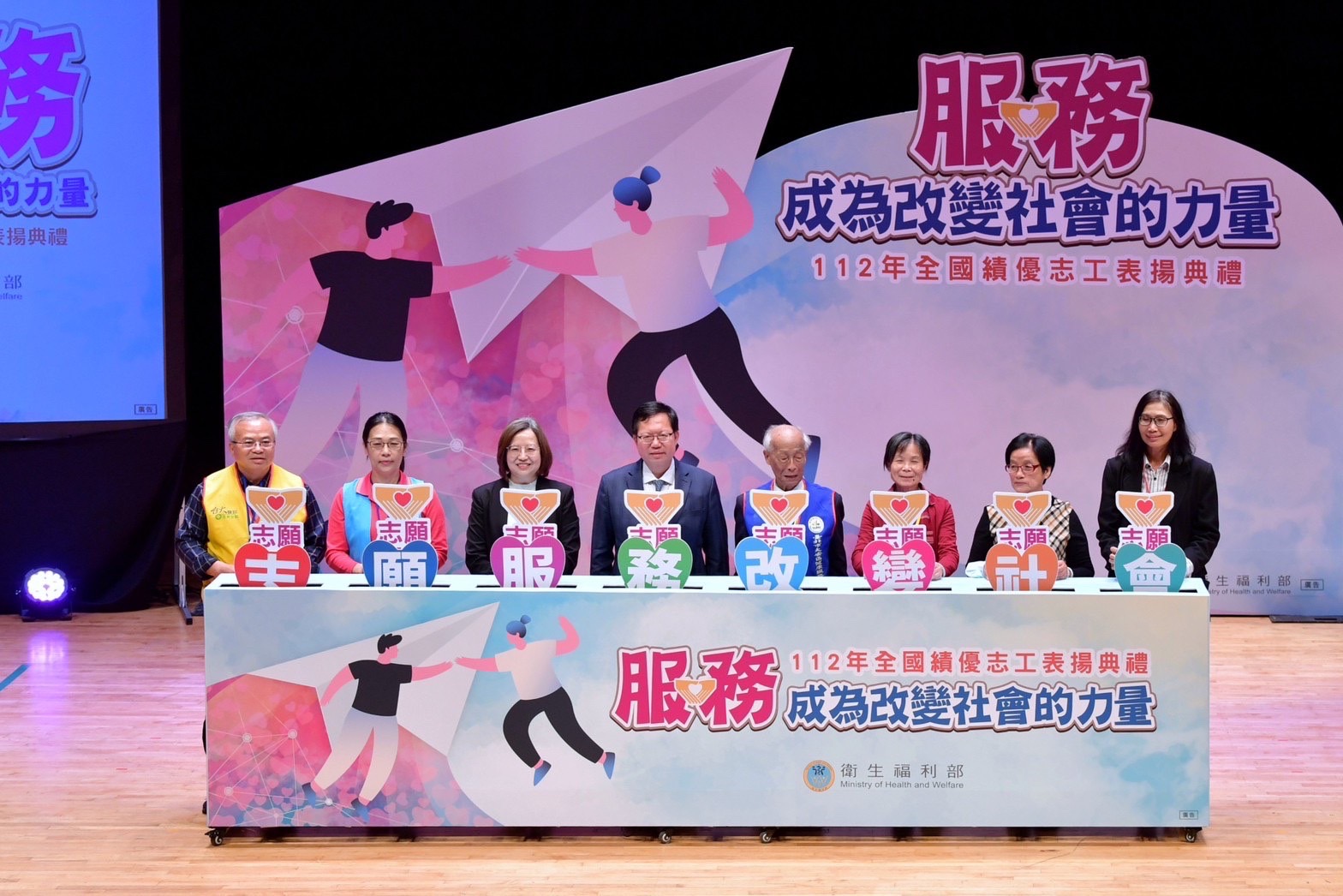 鄭副院長到場後,首先與衛生福利部李麗芬次長、社會救助及社工司蘇昭如司長、國立故宮博物院蕭宗煌院長、國軍官兵退除役輔導委員會服務照顧處劉雅魁副處長、臺灣彰化地方檢察署張曉雯檢察長一同欣賞由身心障礙朋友組成的「黑門樂團」演出;致詞結束後,副院長與李麗芬次長、蘇昭如司長及3位得獎志工代表、2位績優志工團隊代表共同按下「志願服務」啟動鈕,啟動臺隨即升起「志願服務、改變社會」標語,完成啟動儀式。隨後,副院長逐一頒發「績優志工團隊」獎項予25支得獎志工團隊,並合影留念。