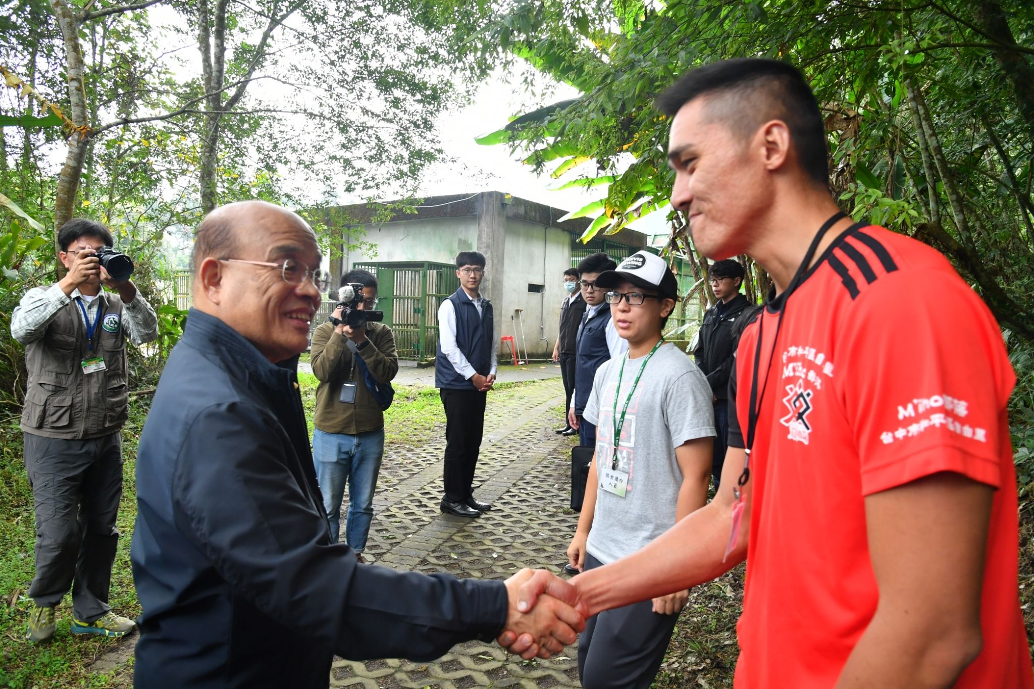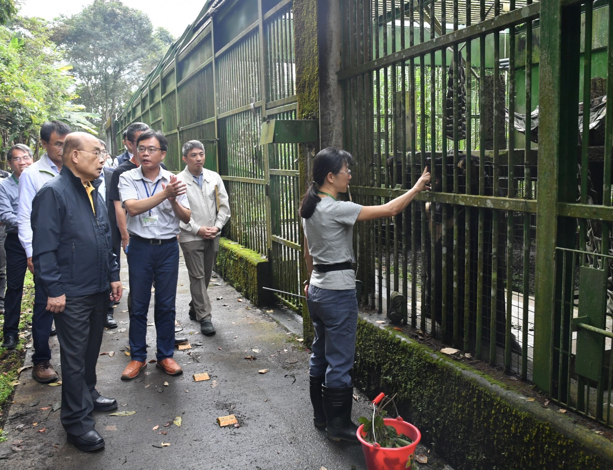 行政院長蘇貞昌今(15)日特別深入山區,前往位於臺中和平的農委會特有生物研究保育中心低海拔試驗站,探望今(109)年10月被山豬吊夾傷的臺灣黑熊小七,並對長期在山區進行研究的工作同仁表示敬意與感謝。院長同時責成農委會等單位落實野生動物相關保育政策,並給予同仁更多照顧及資源。