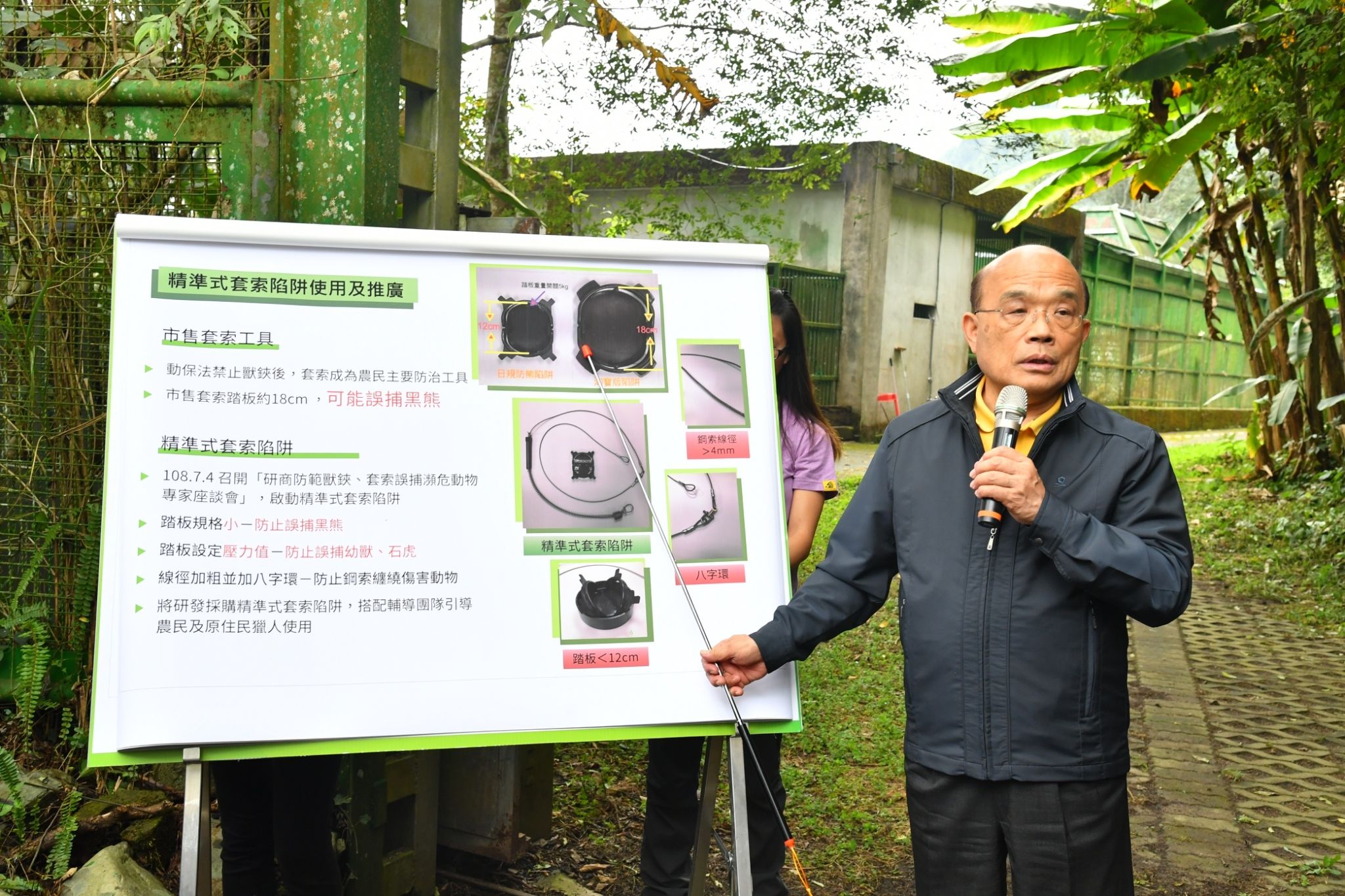 蘇院長強調,除建置電牧器圍網外,也應透過各種系統,推動全面禁用獸鋏,受限於地形無法裝設電牧器圍網之區域,則宣導農民採用精準式陷阱套索。也請內政部警政署保七總隊等單位配合,應是一條鞭方式,從告知、嚴管、重罰等方面,均要嚴格落實執行。