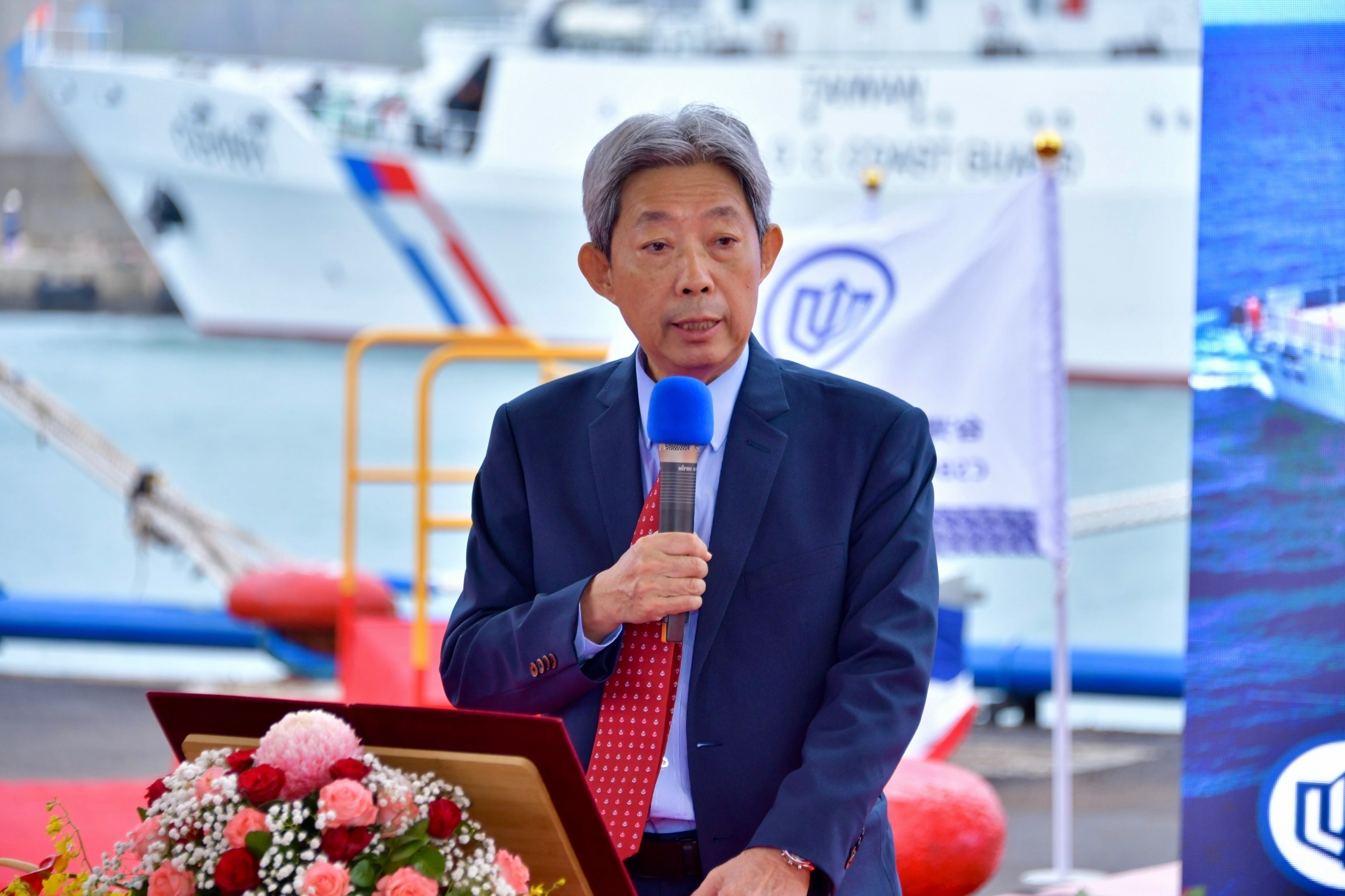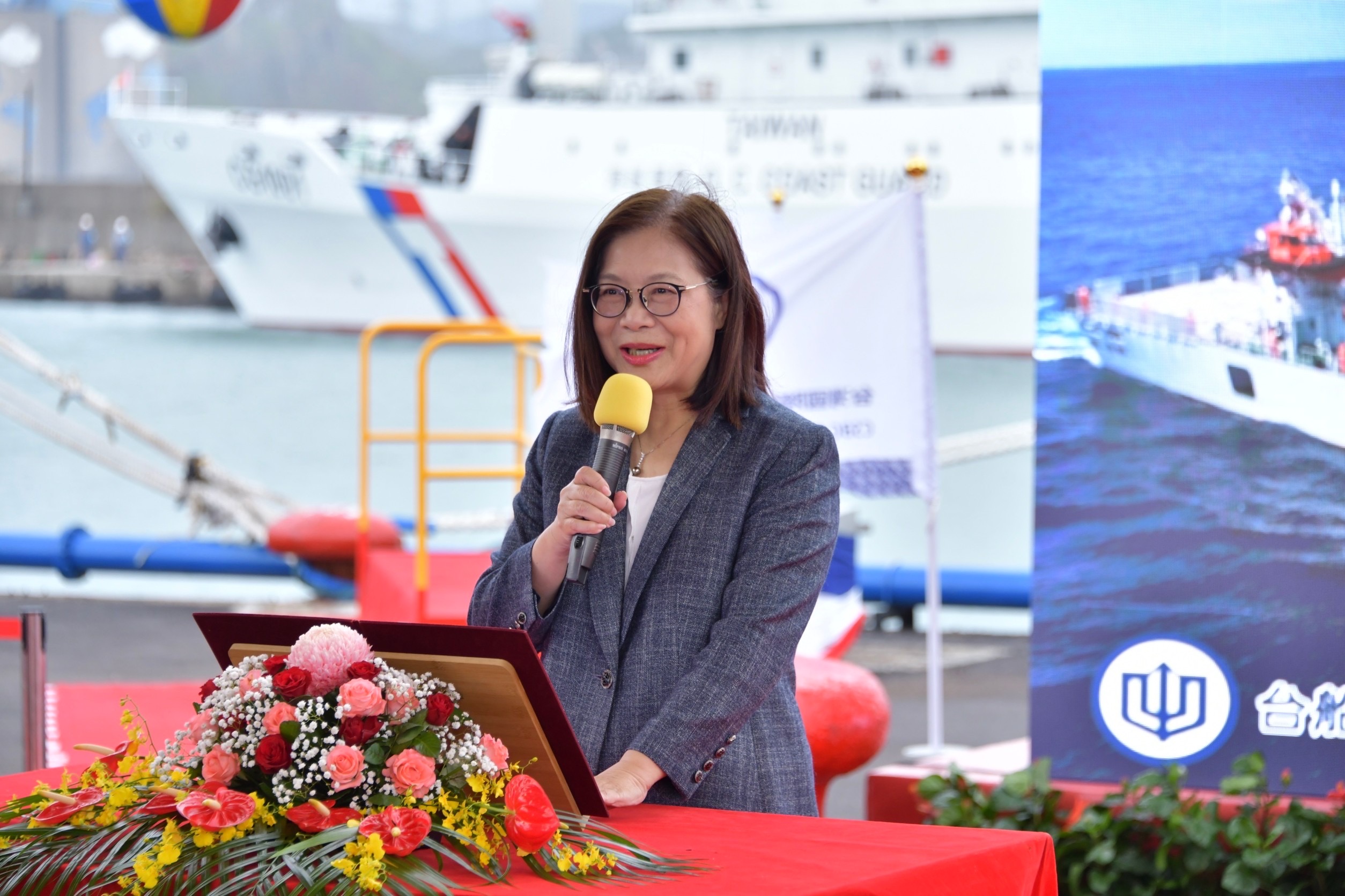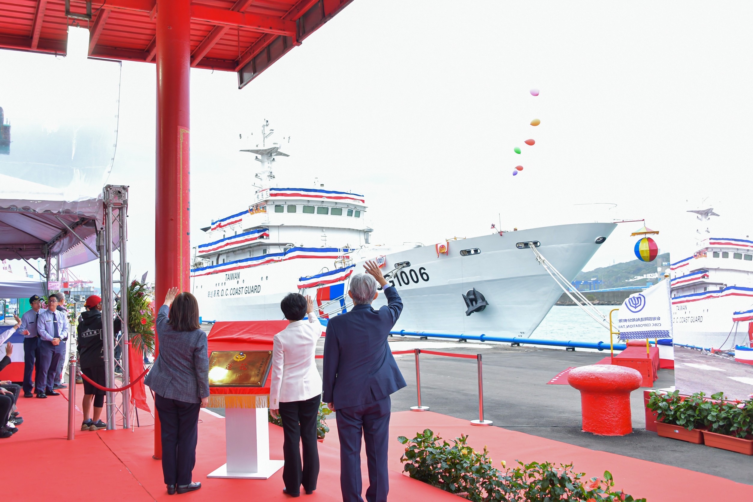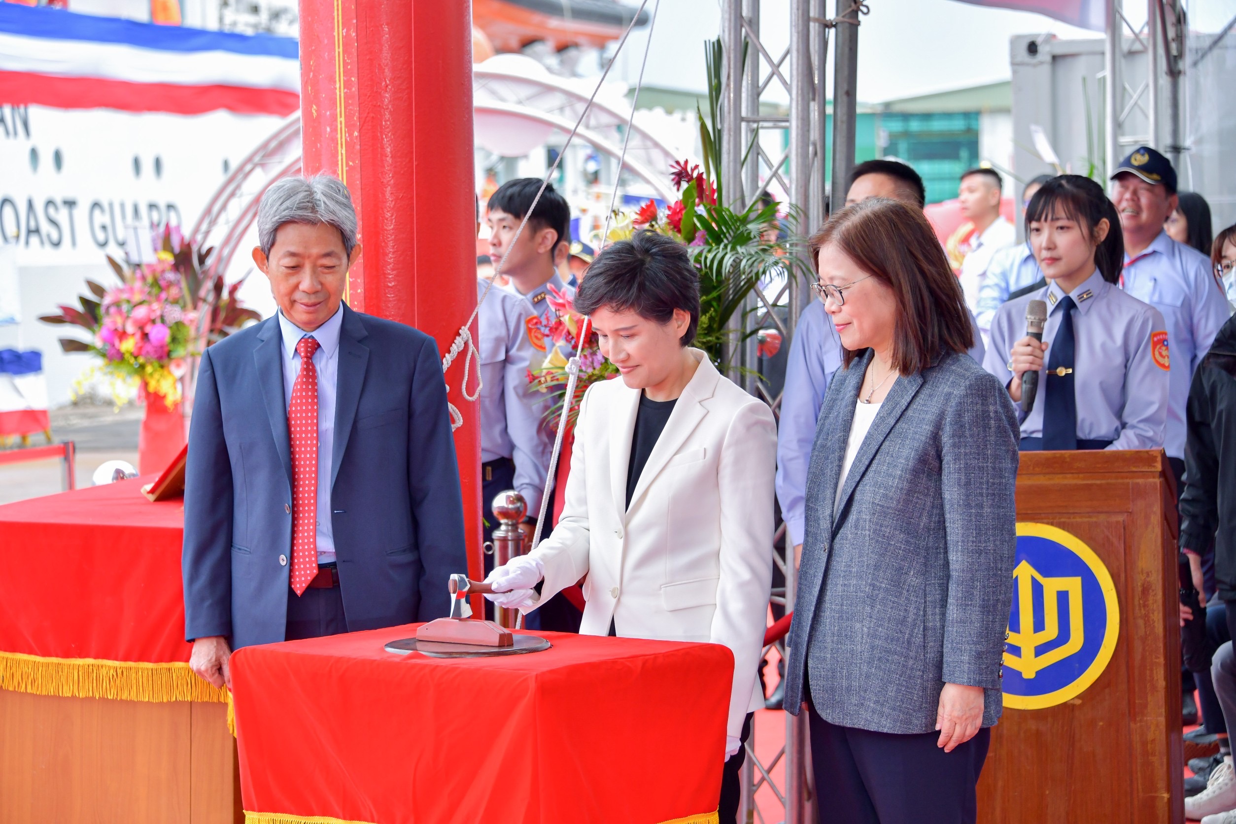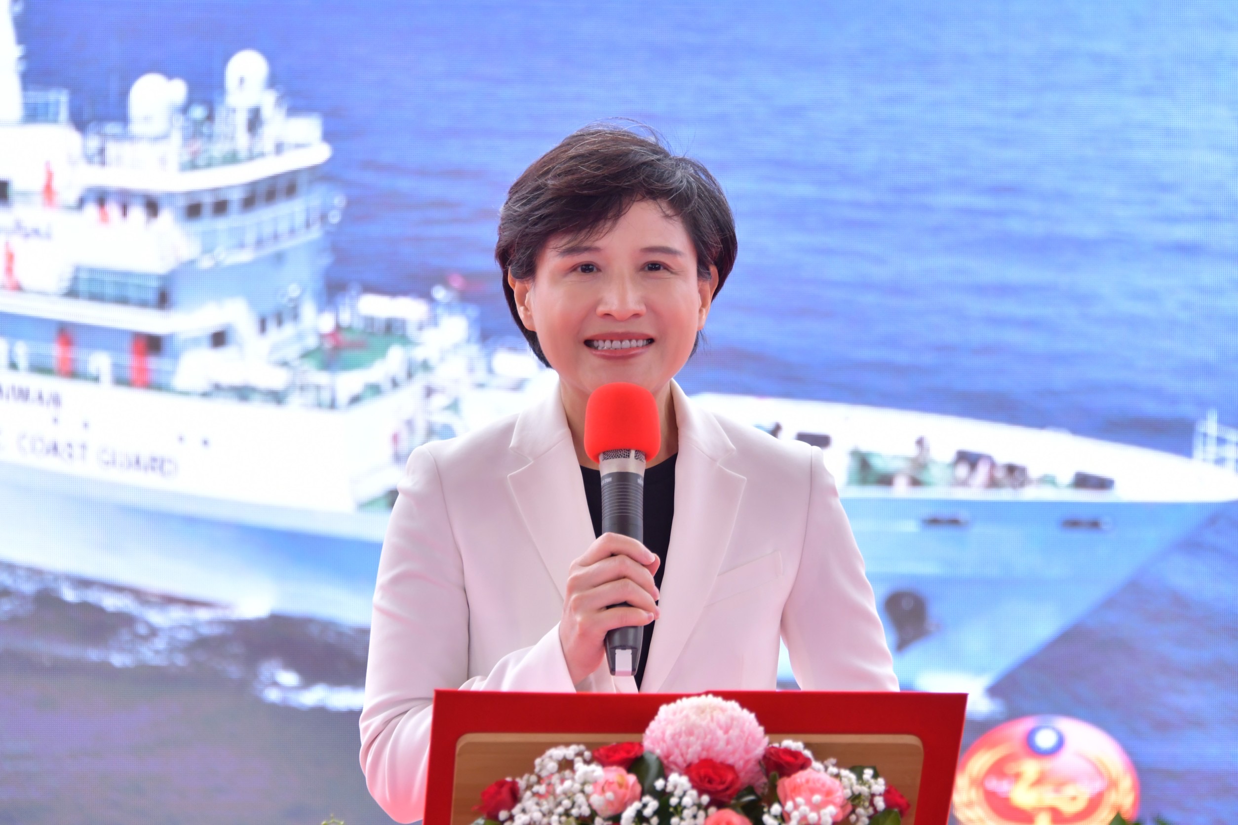 鄭副院長致詞時指出,新船下水的擲瓶儀式歷來皆由女性首長主持,感謝海洋委員會管碧玲主委邀請,並賦予她無比榮耀的任務,讓她能夠前來台灣國際造船股份有限公司基隆廠,見證我國1000噸級巡防艦第3艘連江艦交船及第4艘CG1006命名下水,對她而言,今天特別充滿意義。