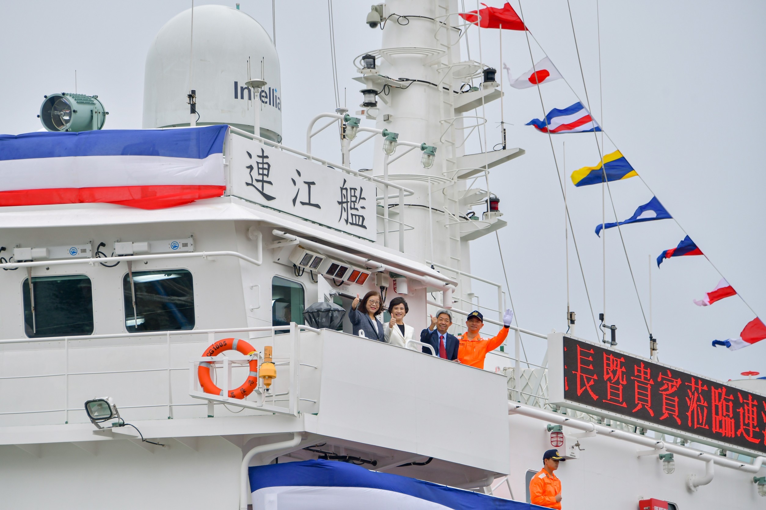 接續,在鄭副院長監交下,黃董事長致贈「連江艦」船模型予海委會海巡署艦隊分署澎湖海巡隊陳永鋒隊長,完成交船儀式。鄭副院長並登上「連江艦」,前往駕駛臺,參觀航儀設備及射控系統,並於駕駛臺外方甲板,向現場貴賓揮手致意。最後,鄭副院長與管主委、海巡署張署長、艦隊分署廖德成分署長、海巡之友總會艦隊分會莊慶達首席榮譽顧問及造艦有功人員、專家學者等人於「連江艦」前合影留念。