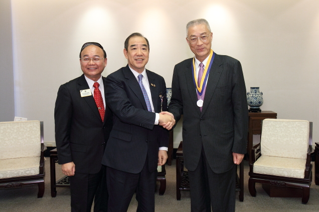 內政部長江宜樺並代表政府頒發譚榮根一等內政專業獎章,以及頒發二等內政專業獎章給國際獅子會國際總會理事江達隆,以表彰他們對國際及我國重大的貢獻。譚總會長也頒贈國際獅子會的「Medal of Distinction」獎牌給吳院長及「Medal of Merit」獎牌給江部長,同時致贈國際獅友錦旗給行政院秘書長林中森。