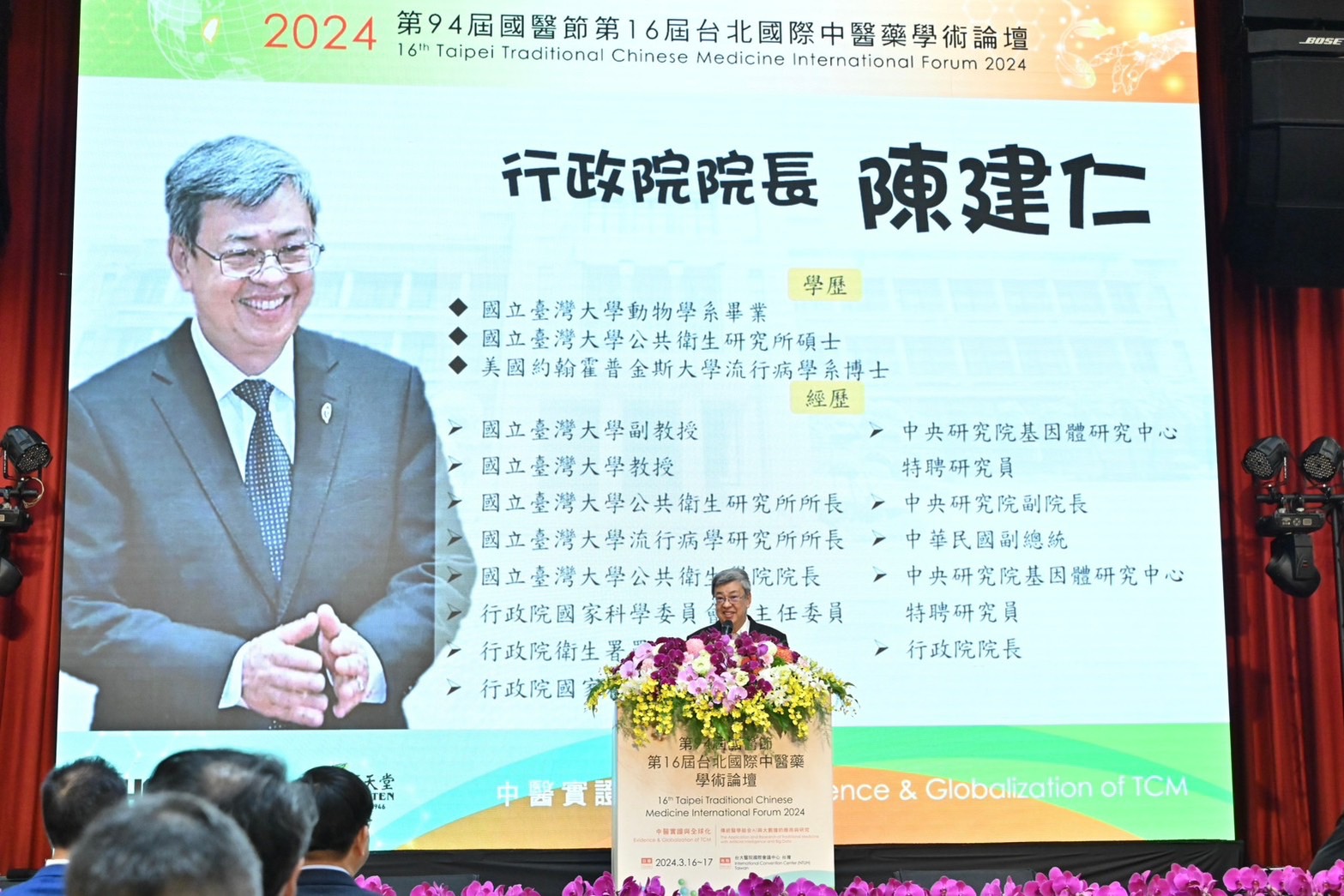 行政院長陳建仁今(17)日出席「第94屆國醫節慶祝大會暨第16屆台北國際中醫藥學術論壇大會開幕式」時表示,感謝在場所有中醫藥先進們運用科學分析方法及技術進行研究,並結合AI(人工智慧)及大數據,讓臺灣中醫藥研究在全世界揚名立萬。院長強調,蔡英文總統上任後,積極支持我國中醫藥整體發展,在法制訂定及計畫推動上,已有許多具體成果,而政府將結合「中醫優質發展計畫」及「中醫藥振興計畫」,宏觀地推動我國中醫藥永續發展藍圖,並請衛生福利部繼續營造我國中醫藥優質服務及產業環境,促進整體中醫藥的永續發展。
