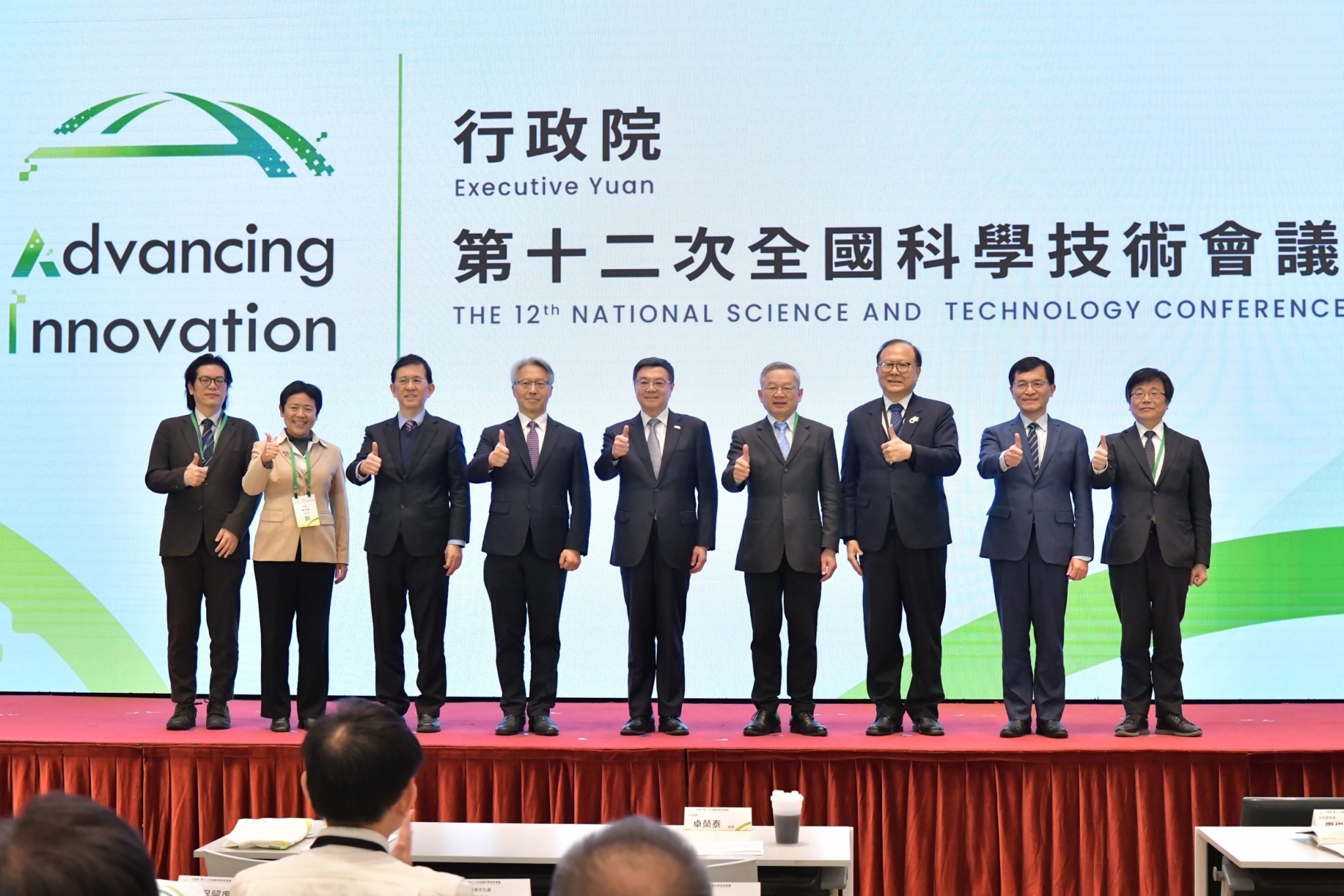 致詞結束後,卓院長偕同行政院吳誠文政務委員兼國科會主委、數位發展部黃彥男部長、行政院人事行政總處蘇俊榮人事長、中央研究院廖俊智院長、經濟部何晉滄次長、環境部施文真次長、衛福部周志浩次長、國科會陳炳宇副主委等人一同合影留念。
