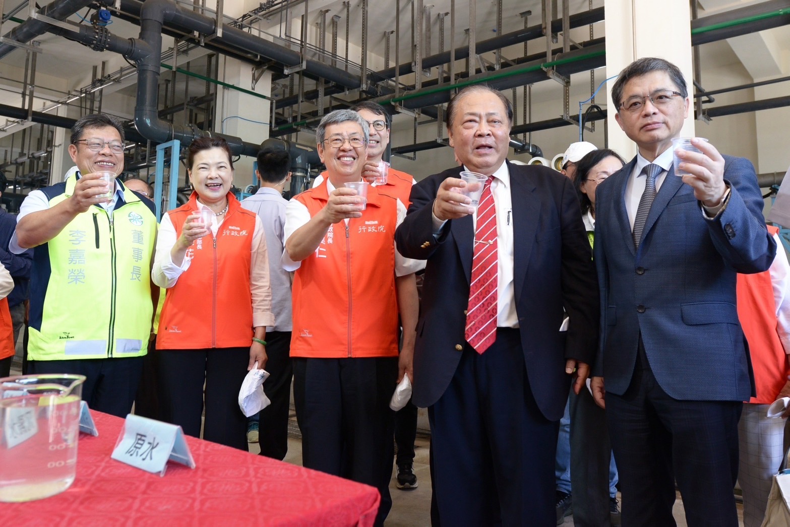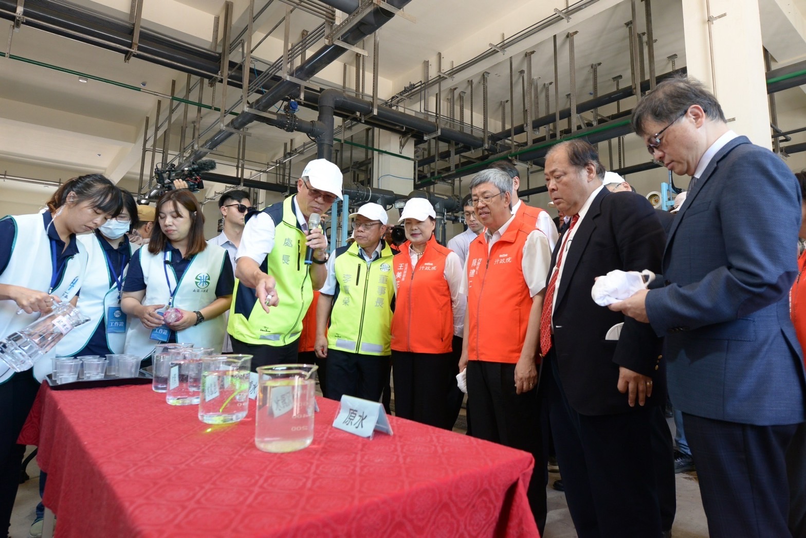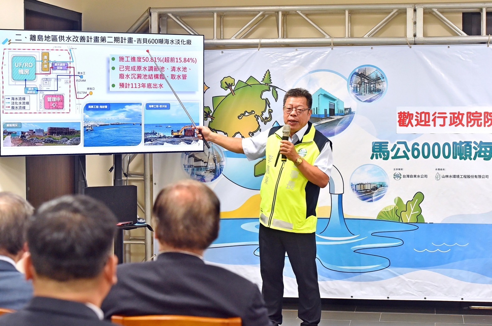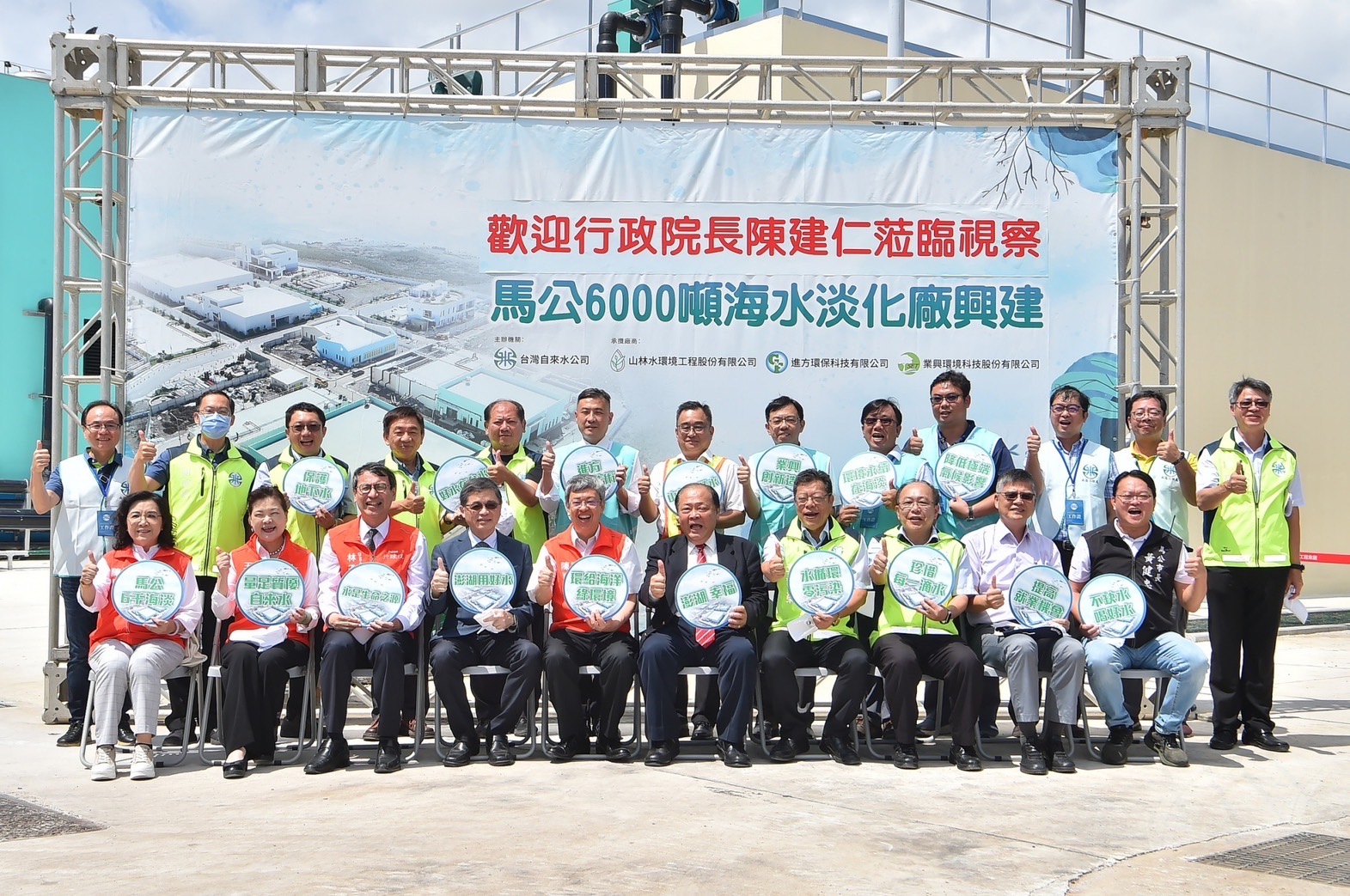 此行,陳院長首先觀看馬公6,000噸海水淡化廠簡介影片,並聽取台灣自來水公司李嘉榮董事長說明「離島地區供水改善計畫第二期計畫馬公6,000噸海水淡化廠」簡報,了解澎湖地區自來水供水概況及該計畫第二期內容及效益。致詞結束後,院長在台水公司南區工程處林家煌處長解說下,視察RO逆滲透薄膜設備機房,實地瞭解海水淡化步驟與環節,並試飲海淡水,對於該水廠生成的海淡水品質給予高度肯定。最後,院長偕同行政院李孟諺秘書長、林子倫發言人、經濟部王美花部長、行政院南部聯合服務中心陳慧玲副執行長、陳光復縣長、李嘉榮董事長、台水公司南區工程處工作人員及承攬廠商山林水環境工程股份有限公司、進方環保科技有限公司與業興環境科技股份有限公司代表合影留念。