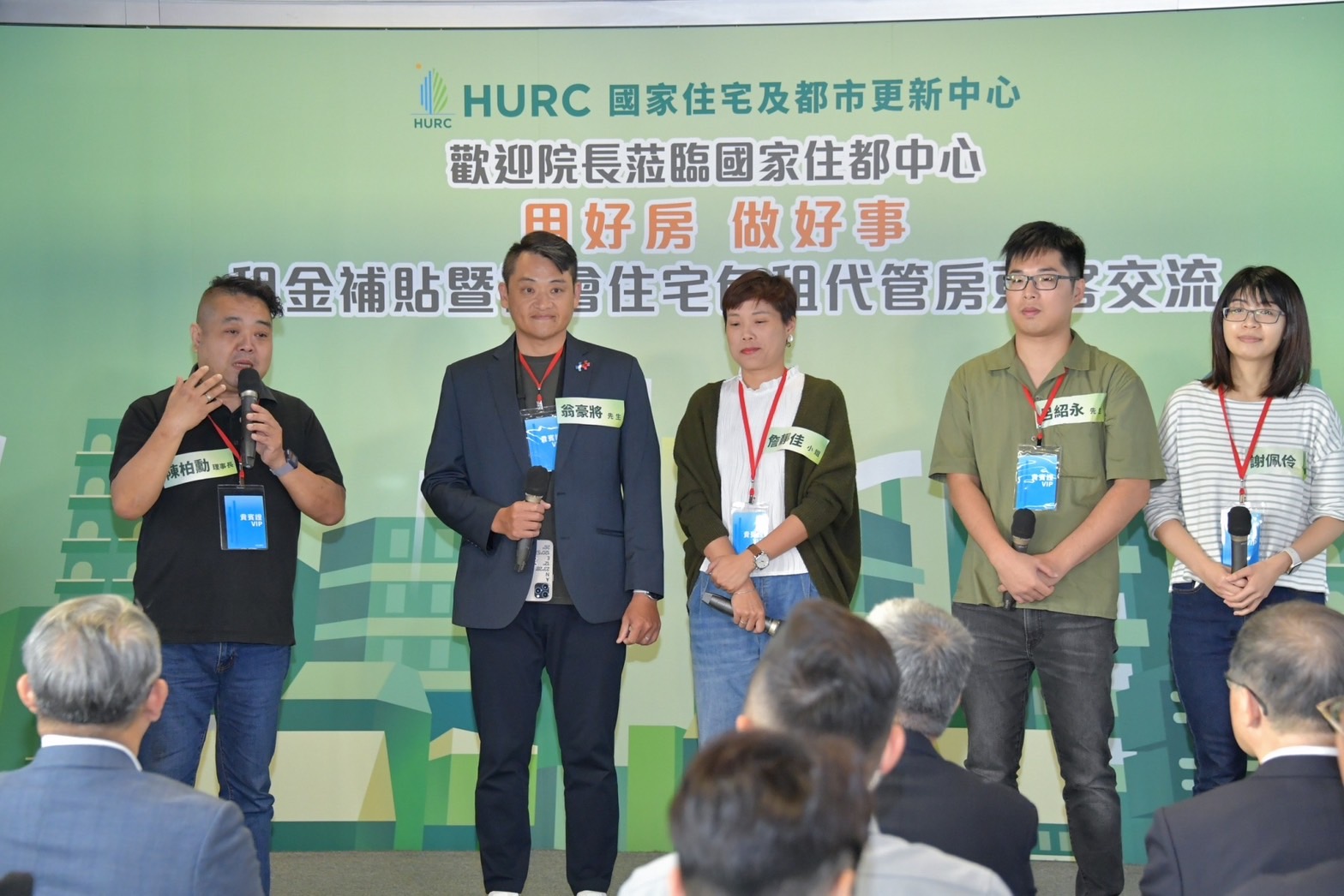 致詞結束後,陳院長與行政院李孟諺秘書長、林子倫發言人、內政部花敬群次長兼國家住都中心代理董事長、內政部國土管理署吳欣修署長,以及房客、房東、包租代管業者代表等合影留念。隨後,院長與房客、房東及業者代表進行交流會談,聆聽業者分享在媒合過程中如何滿足房東及房客的需求;房東參與社會住宅包租代管計畫,盼透過一己之力,實現居住正義的理念;以及房客受惠於政府租金補貼及完善住宅服務的心得。會中,花次長提及,社會在更加瞭解社宅包租代管政策之後,提升了信任感,因此參與計畫的房客及房東數量已快速增加,而院長也以「真正的權力就是服務」來勉勵在座公務機關同仁,並對房東為社會付出的用心表示讚賞,強調唯有大家齊心協力,社會才會更和諧。