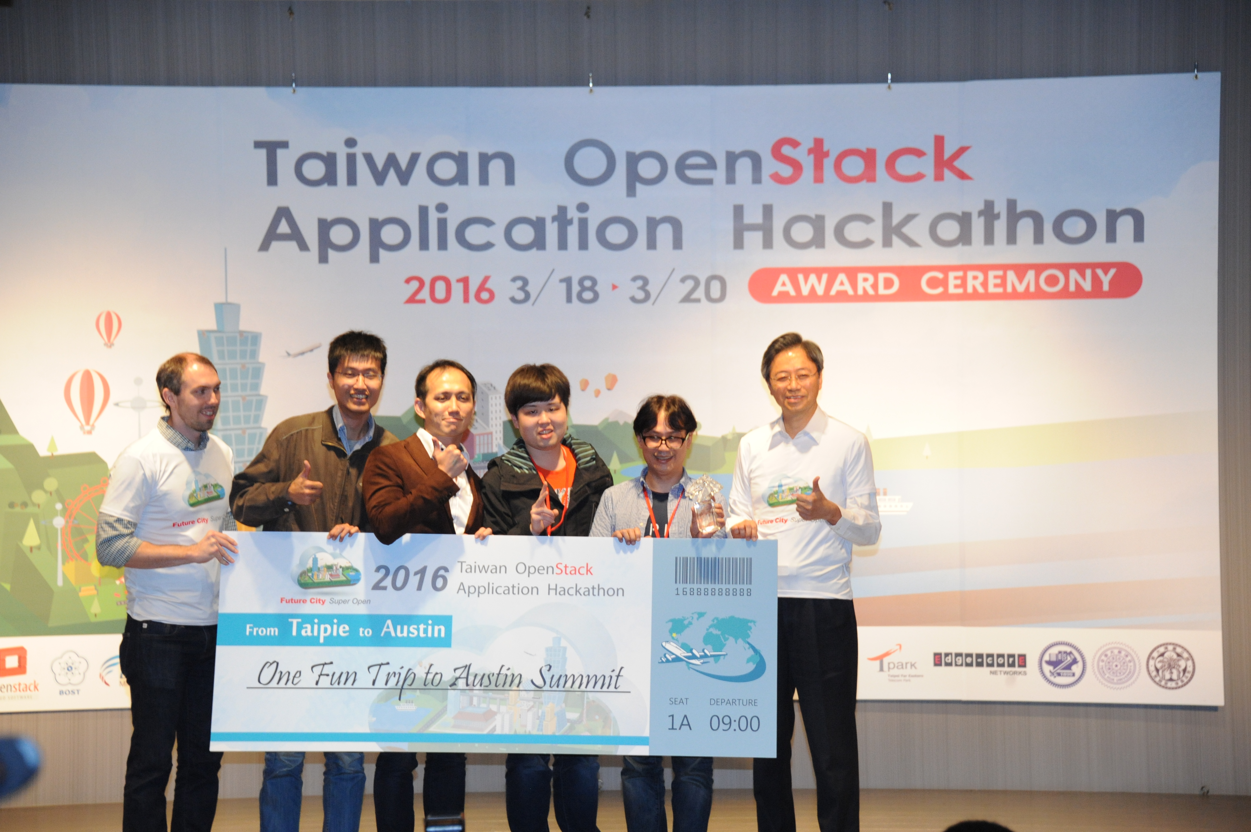 今天張院長頒發「全方位大獎」(Grand Prize),由LIKA隊獲得,4名成員來自工研院服務系統科技中心,由曹思漢先生領隊,他們的專案名稱為「Phantom of the LIKA」,藉由量測樂器演奏者的肌肉訊號,即時反饋給演奏者,有助分享與學習,本次參與競賽,於現場示範小提琴演奏。LIKA隊將參加今年四月在美國德州舉行的OpenStack年度盛會-OpenStack Summit。
