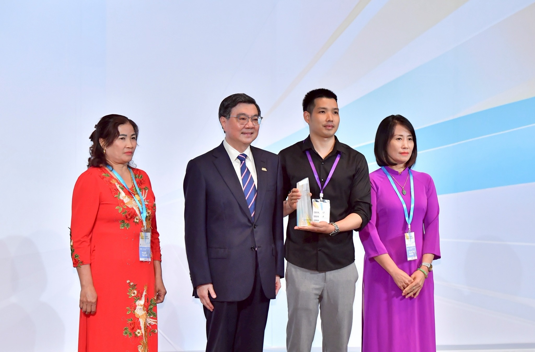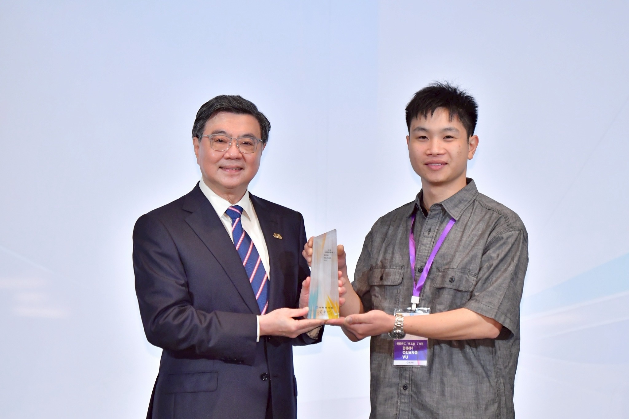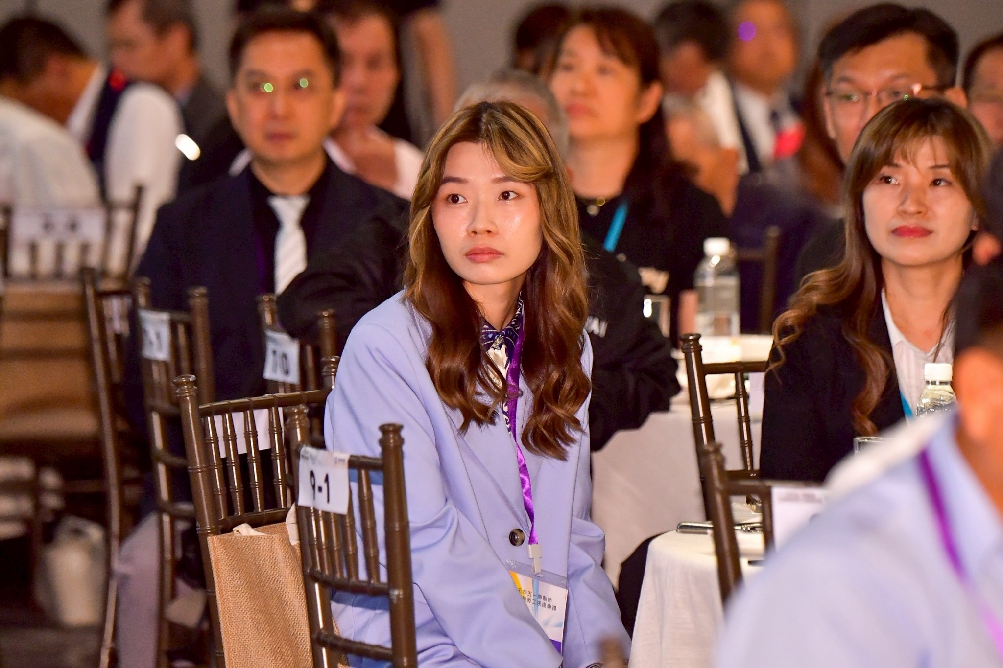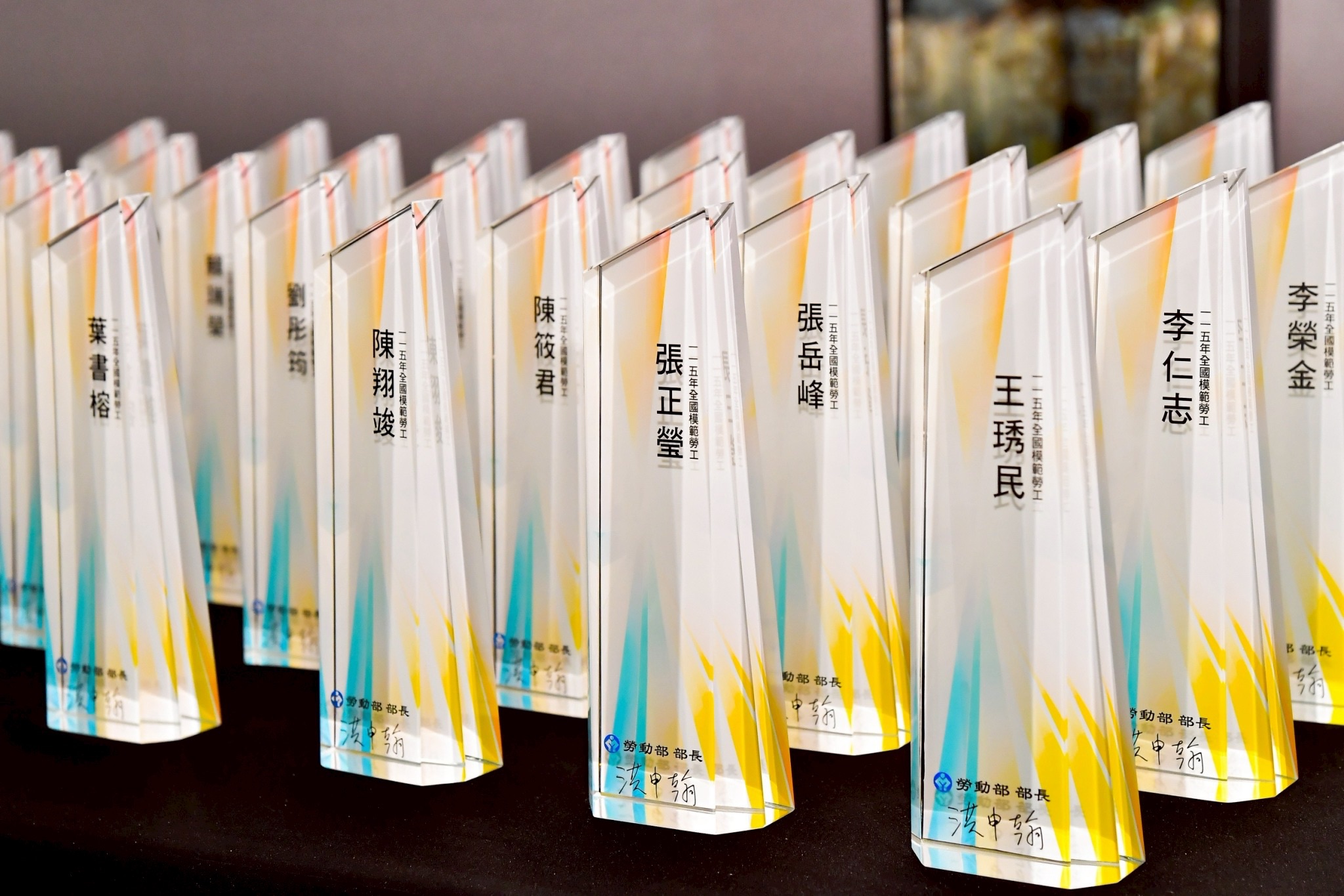 致詞結束後,卓院長逐一頒發獎座予59位全國模範勞工,並偕同行政院李慧芝發言人、勞動部洪申翰部長、駐台北印尼經濟貿易代表處艾吏福(Arif Sulistiyo)代表與全體受獎人合影留念。
