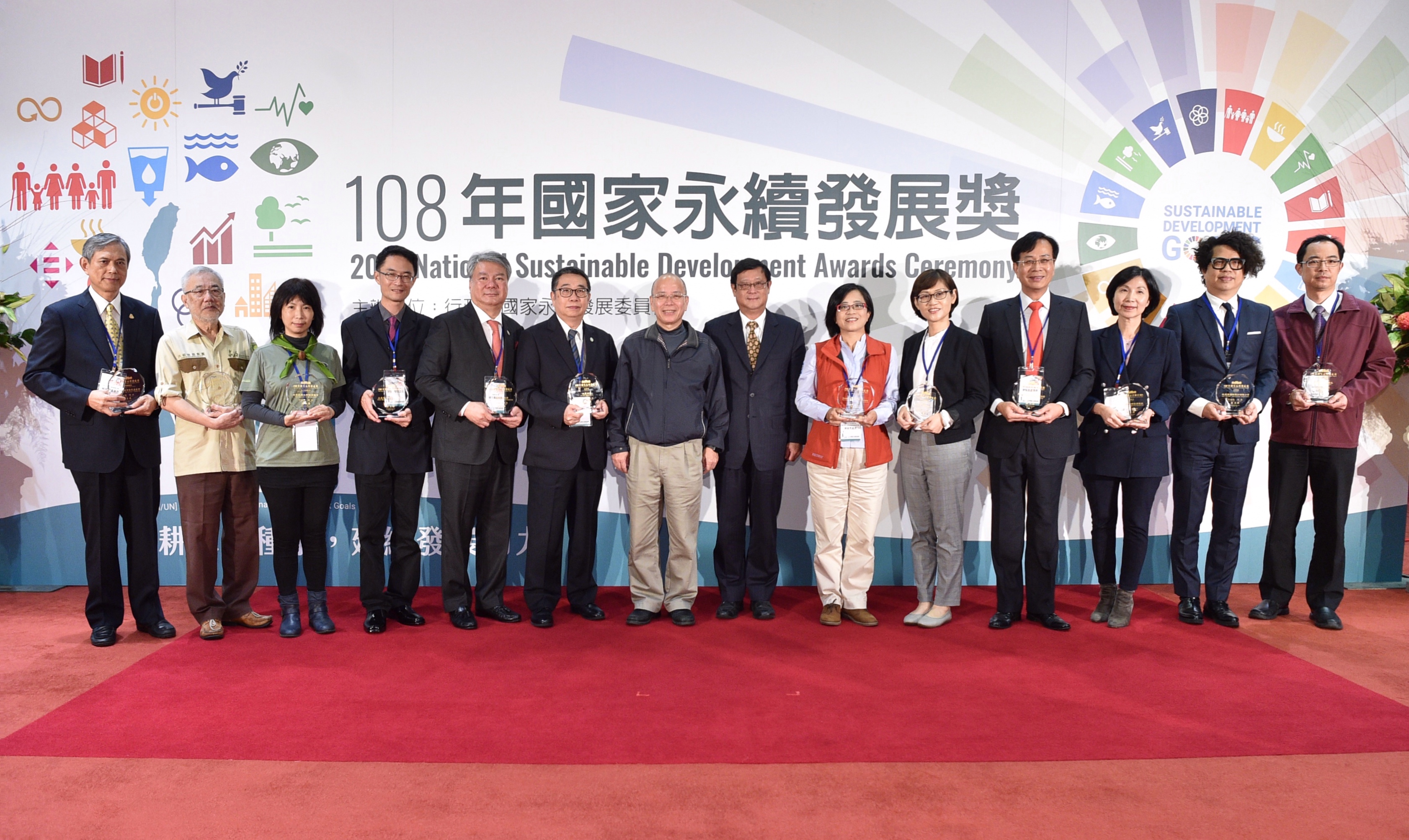 行政院表示,108年「國家永續發展獎」獲獎單位包括:大葉大學、朝陽科技大學及嘉義市立志航國民小學獲得「教育類國家永續發展獎」;第一商業銀行股份有限公司、遠傳電信股份有限公司及歐萊德國際股份有限公司獲得「企業類國家永續發展獎」;社團法人中華民國荒野保護協會、財團法人莊福文化教育基金會及財團法人慈心有機農業發展基金會獲得「民間團體類國家永續發展獎」;以及交通部觀光局東北角暨宜蘭海岸國家風景區管理處、農業委員會林務局花蓮林區管理處及桃園市政府工務局獲得「政府機關類國家永續發展獎」。