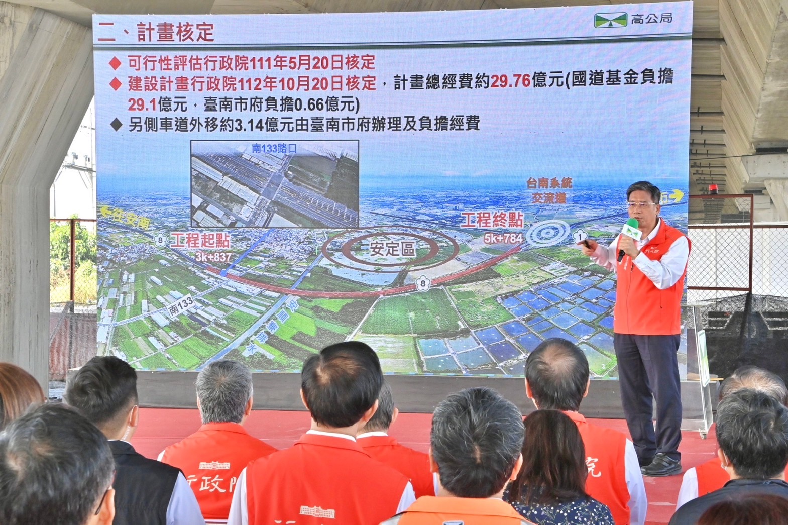 陳院長指出,為滿足地方鄉親需求,改善鹽水溪以北、以府城為核心的國道及鄉道路口延滯問題,促進臺南地區未來發展,賴清德副總統過去擔任臺南市長期間,即與許多在地立委共同爭取本項工程。臺南市政府續於2020年11月提出「國道8號南133線路口改善交流道可行性評估報告」,經審議通過後,於今(2023)年10月由行政院核定該工程建設計畫,總經費為29.76億元,其中由國道基金挹注29.1億元,占比約97.8%,另由臺南市政府負擔0.66億元,目前交通部高速公路局刻正進行環境影響差異分析與設計作業。