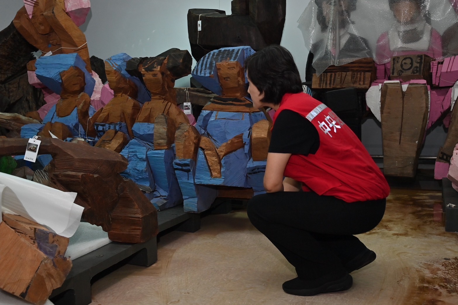 鄭副院長抵達後,在朱銘文教基金會吳素美執行長引導下,依序前往立體停車場及第一展覽室庫房勘查淹水情形,因山陀兒颱風帶來致災性雨量,導致溝溪暴漲,泥水湧入立體停車場及庫房,使停車場淹水達120公分高,多項機電及消防設備受損,庫房內計有50件作品因泥水湧入而受損。此外,戶外展區亦有86件作品受損,所幸戶外生態池及時發揮滯洪效果,保護緊鄰美術館周邊的民宅,未因颱風產生災情。勘災過程中,鄭副院長也向正在清理戶外場地的工作人員說聲:「辛苦了!家裡還好嗎?」,工作人員則回應:「家裡還好,大家要一起努力度過」。