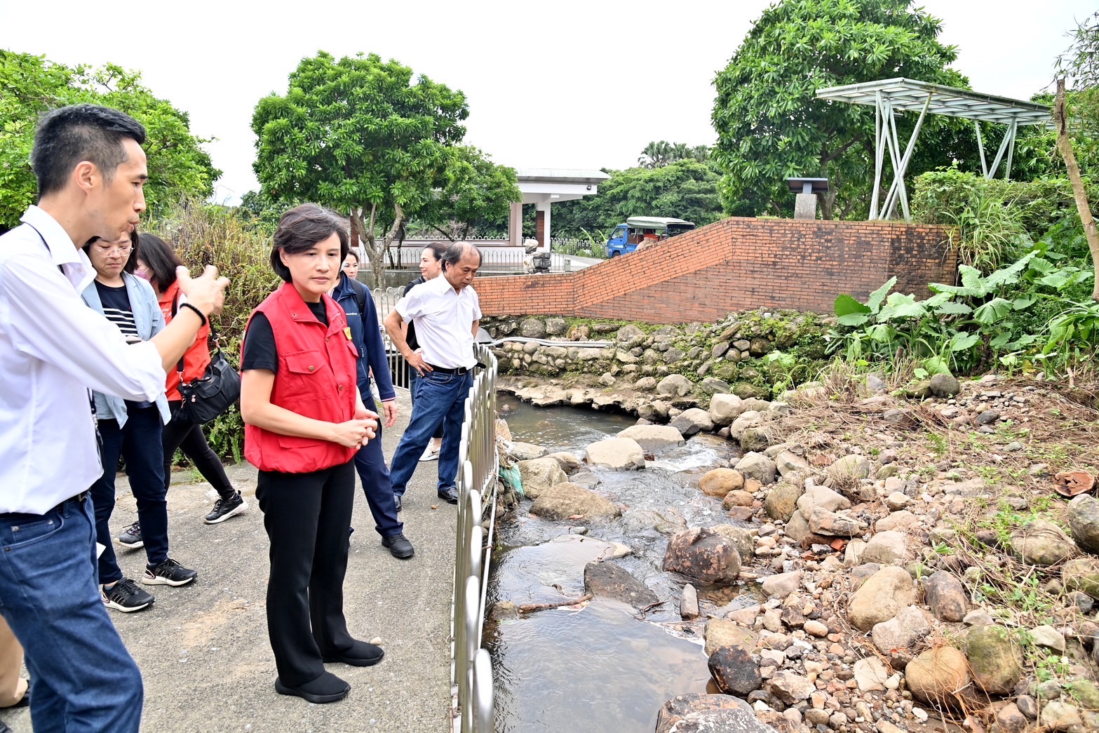鄭副院長進一步指出,由於園區有部分建物為《文化資產保存法》所規範的紀念建築,因此紀念建築本體修復部分,則需依據文資法相關規定,由新北市政府文化局先進行勘查,未來相關修復也可請文化部文化資產局予以協助;此外,因應短延時強降雨的氣候變遷,有關美術館周邊溪流整治部分,她會請行政院公共工程委員會與新北市政府共同合作,並評估是否納入明(114)年度的治水工程預算之中,來強化防災韌性。