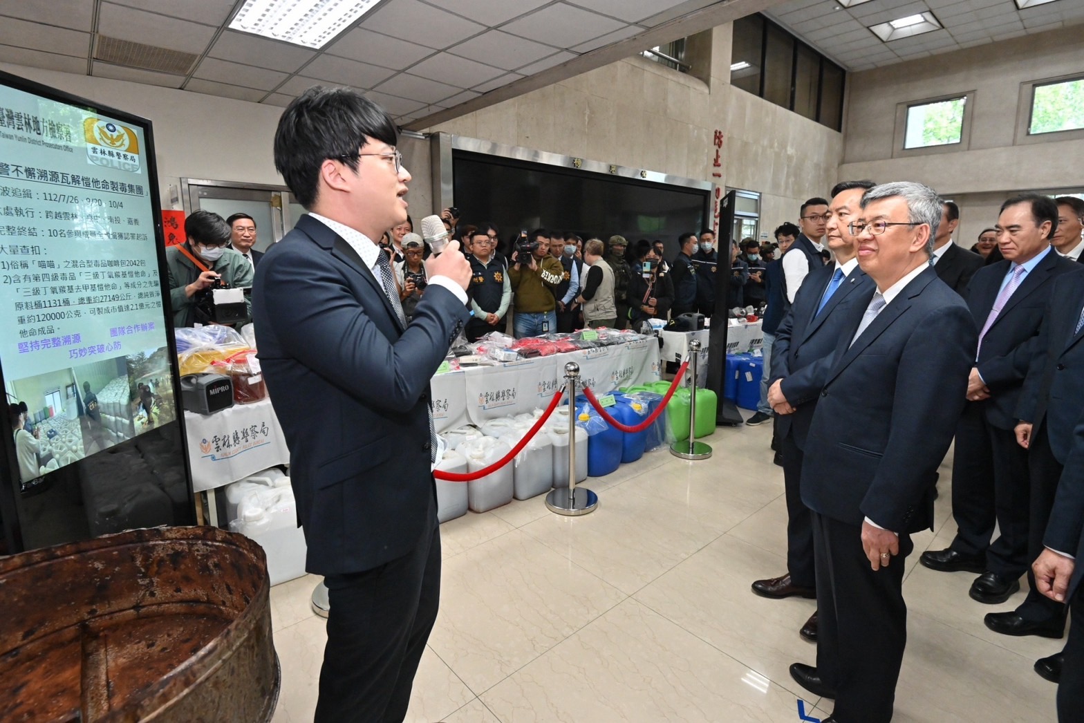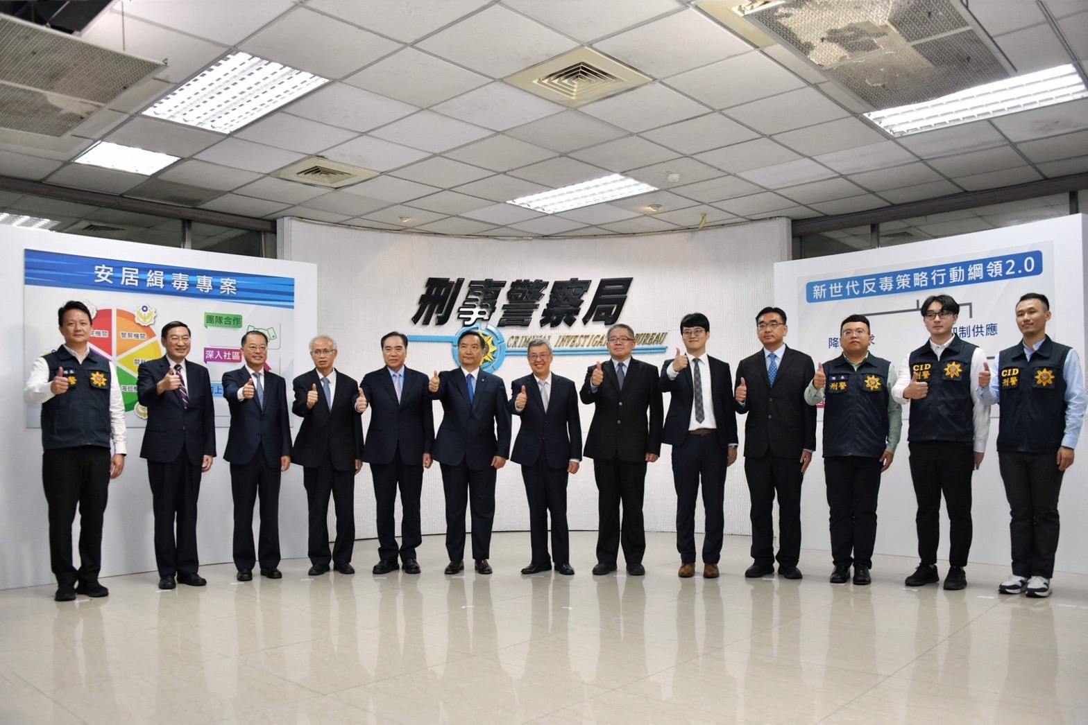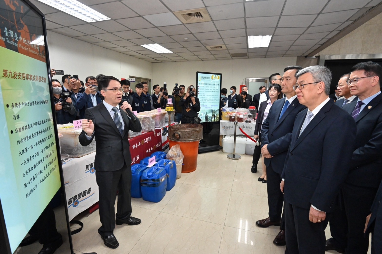 陳院長抵達後,首先聽取臺灣高等檢察署趙燕利檢察官說明「第9波安居緝毒專案成果總彙報」,瞭解本次整體緝毒情形及成效,並依序檢視「貨輪走私史上最大量第二級毒品甲基安非他命毒品案」、「潛伏山區之行動製毒案」 、「製造第三級毒品愷他命工廠案 」、「製造第四級毒品2-溴-4-甲基苯丙酮工廠案」、「泰籍旅客夾藏大量第一級毒品海洛因入境案」、「囤放大量第四級毒品三級丁氧羰基去甲基愷他命案」及「栽種大量大麻工廠案」等7案重大查緝成果;隨後,院長與行政院羅秉成政務委員、法務部蔡清祥部長、最高檢察署邢泰釗檢察總長、臺灣高等檢察署張斗輝檢察長、調查局王俊力局長、內政部吳容輝次長、警政署黃明昭署長、刑事警察局周幼偉局長、憲兵指揮部于大任副指揮官、財政部謝鈴媛次長、關務署彭英偉署長及海洋委員會周美伍副主任委員兼海巡署署長等人一同合影,並分別與各查緝有功單位代表合影留念。