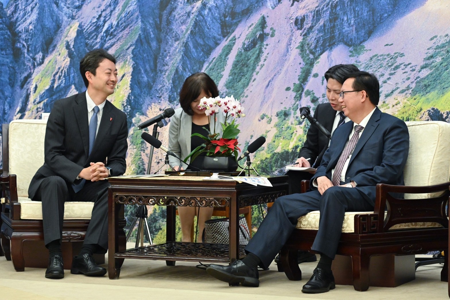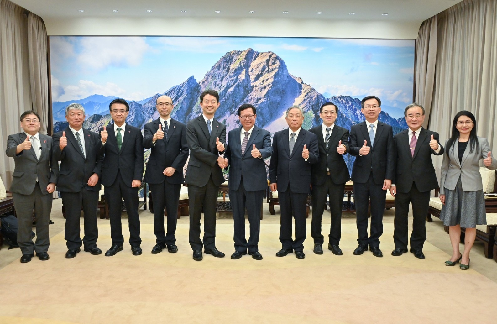 訪賓一行尚包括千葉縣總合企劃部地域創生擔當部長三神彰、商工勞働部地域産業推進・觀光擔當部長石井慶範、農林水産部生産流通戰略擔當部長﨑山一、總合企劃部國際課長木村洋志、國際課副主査西悠宇貴、總務部秘書課主査日下雄司及商工勞働部觀光企劃課觀光事業班長茨木浩一郎等,由外交部次長田中光陪同,前來行政院拜會鄭副院長,交通部民航局局長林國顯、農業部農糧署署長胡忠一及衛生福利部食品藥物及管理署署長吳秀梅也在座。