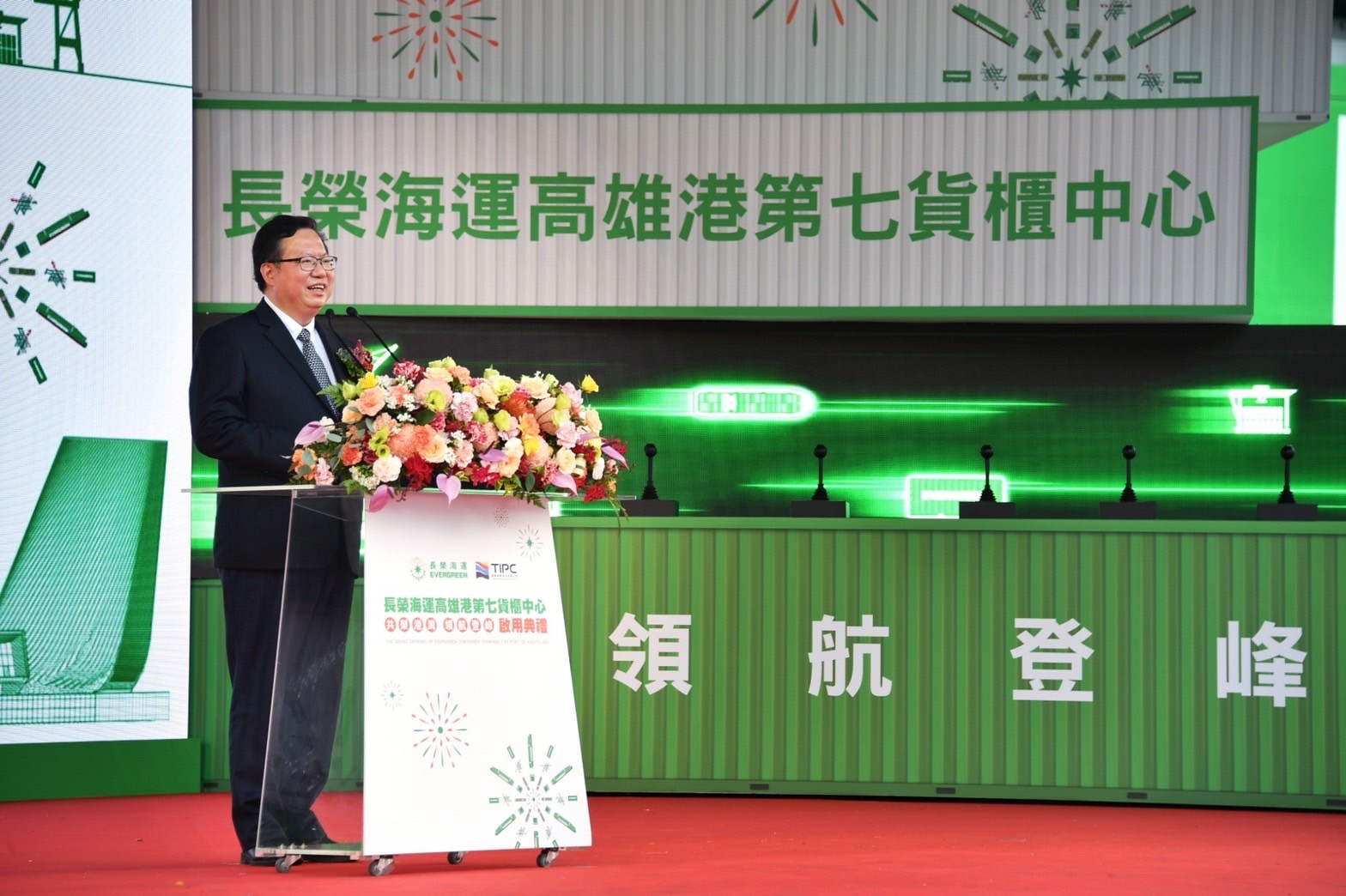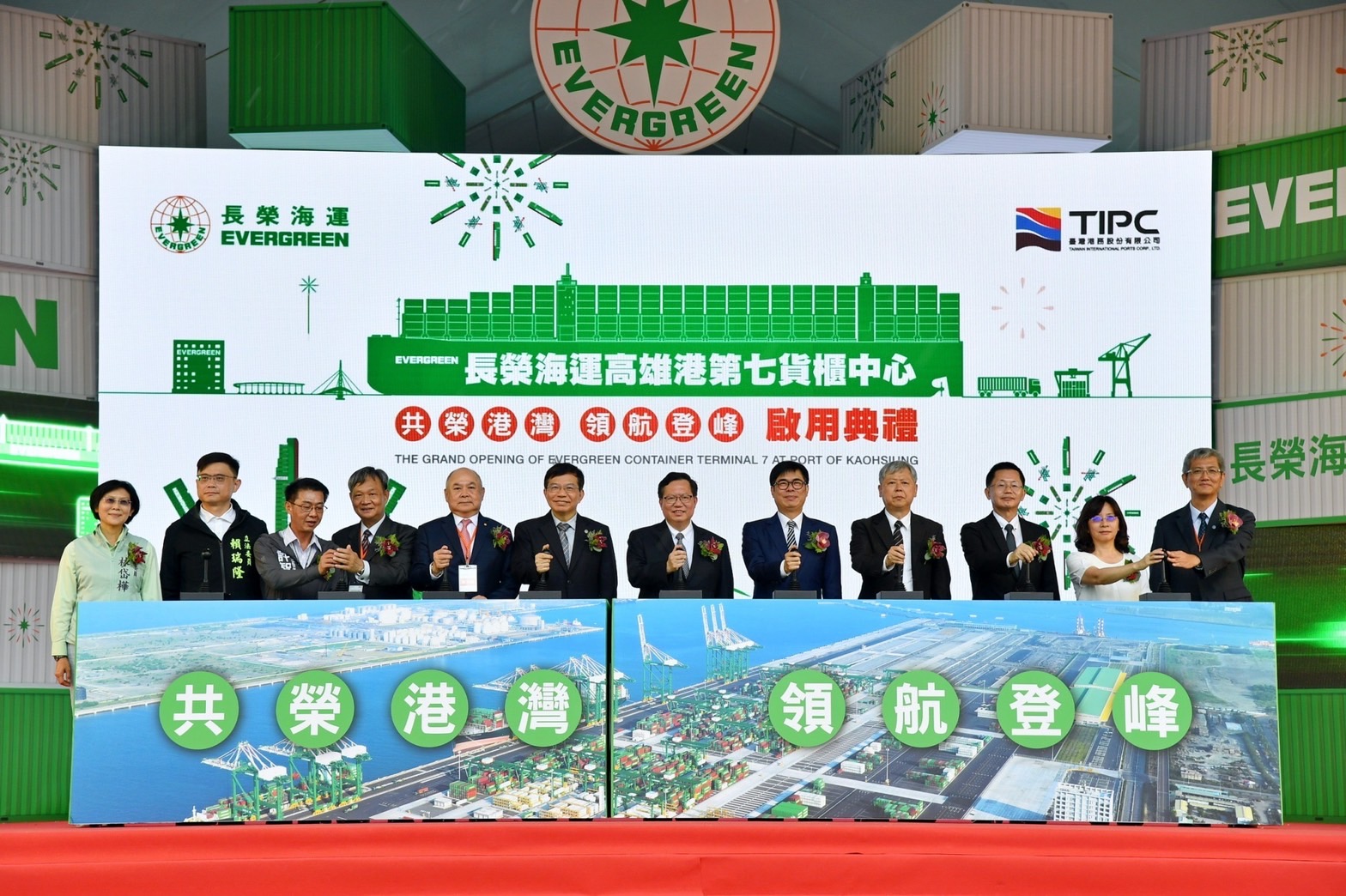 鄭副院長在長榮交響樂團迎賓組曲樂聲中到場,並欣賞〈舞動港灣新紀元〉踢踏舞表演與〈綠色碼頭 智慧領航〉形象影片。啟動儀式由鄭副院長等12位貴賓同時推進控制搖桿,啟動〈長益輪〉、〈長進輪〉、〈長永輪〉等三艘巨輪同時鳴笛、遠端遙控無人橋式機與全自動化門式機動作,並由兩廣祥獅獻上象徵業務長榮興旺的鳳梨與好彩頭後禮成。最後鄭副院長等來賓一起在〈共榮港灣 領航登峰〉的巨型標語前合影後離開會場。今日出席啟用典禮有陳其邁市長、交通部王國材部長、港務公司董事長李賢義以及長榮海運董事長張衍義、許智傑委員、林岱樺委員、賴瑞隆委員等來賓。