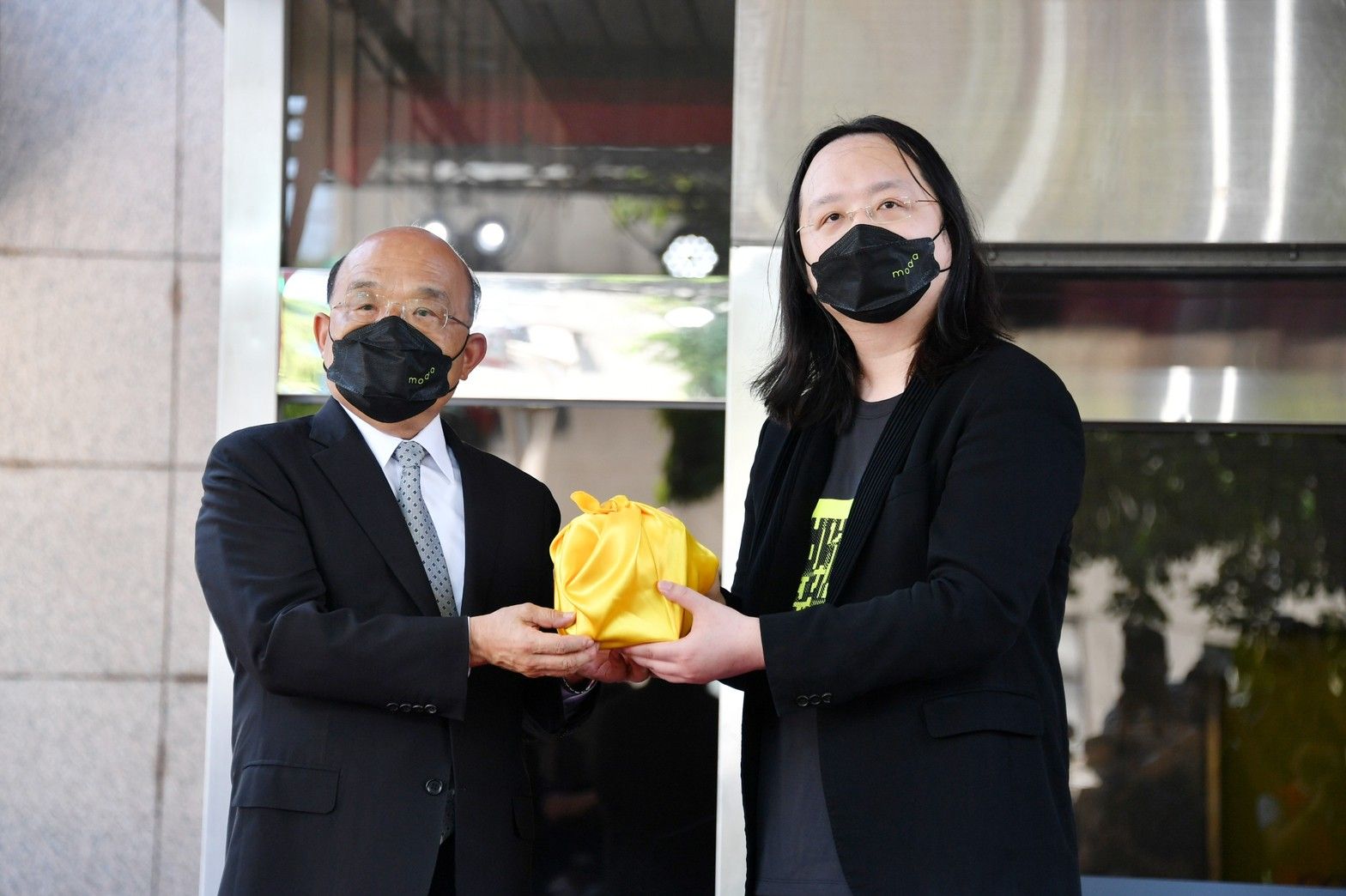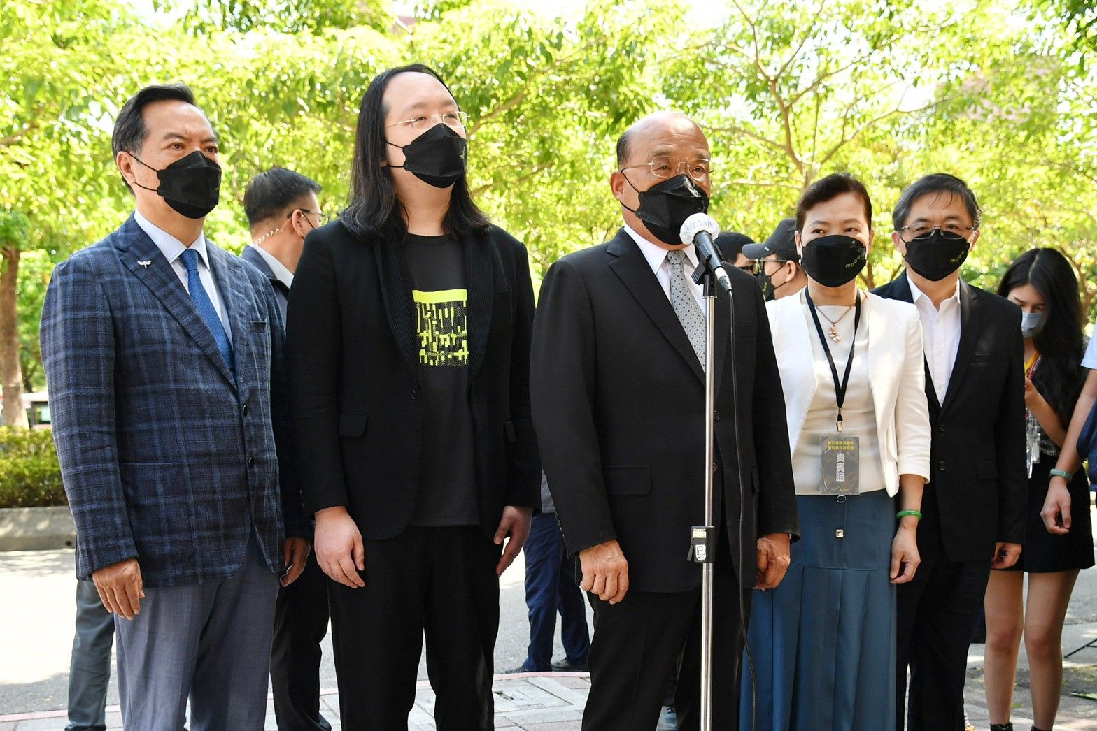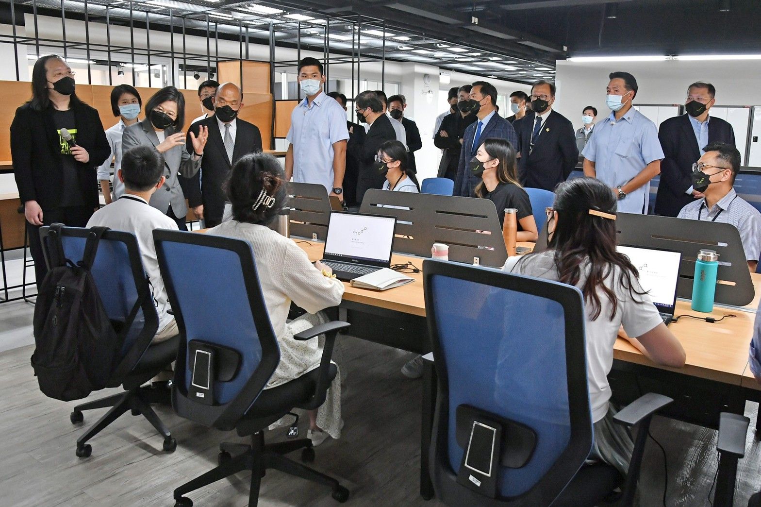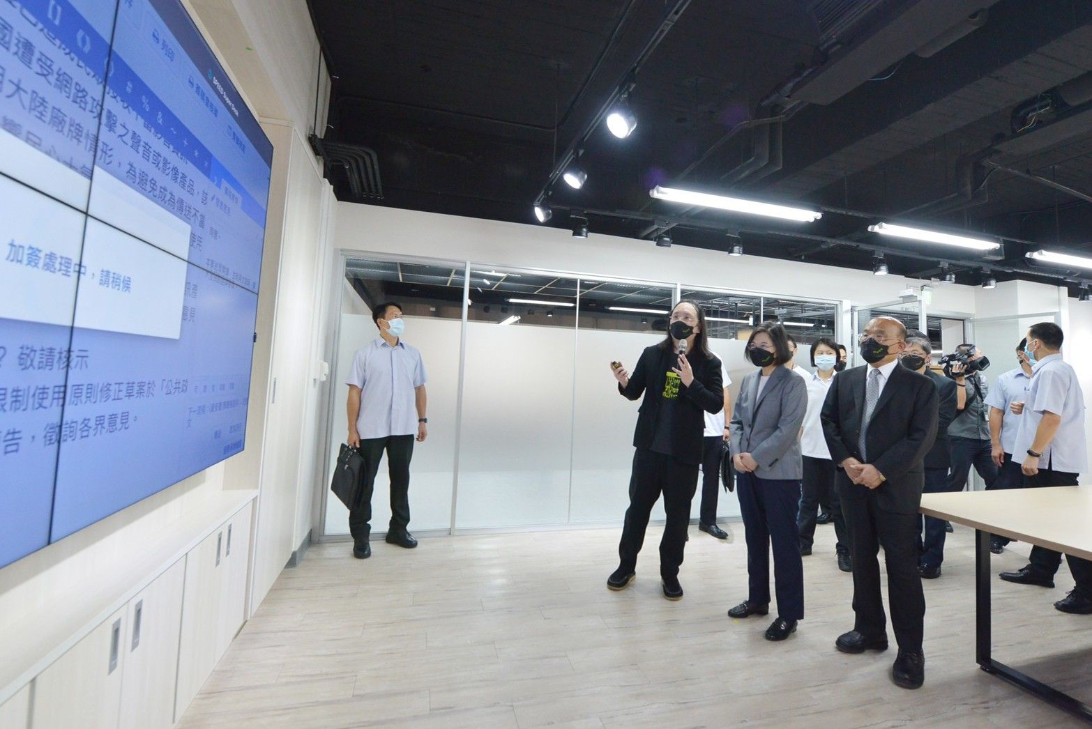 此行,蘇院長先頒授任命令並交予印信給數位發展部首任部長唐鳳,蔡總統及其他貴賓則於臺下見證布達典禮;隨後,蘇院長也與蔡總統及其他貴賓一同完成數位部揭牌儀式並合影留念;接續在唐鳳部長引導下,蘇院長與蔡總統前往數位部辦公室參觀,除觀看電子公文簽核影片,也瞭解該辦公室內部配置規劃,並與數位部同仁問候致意。