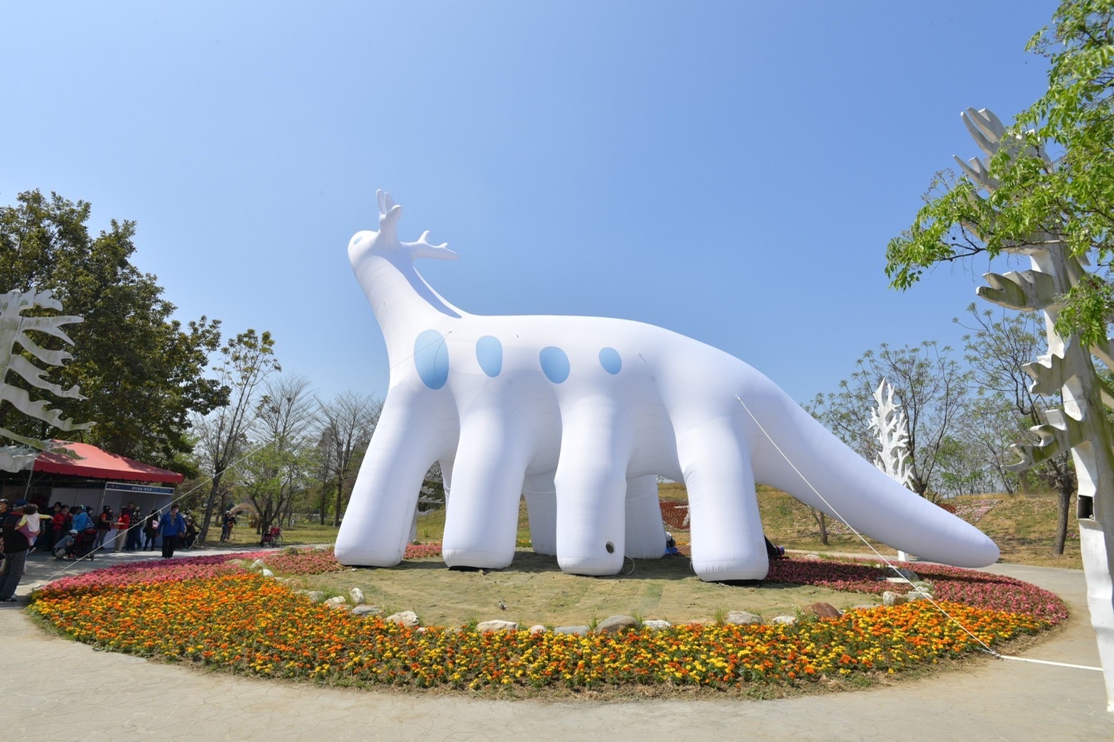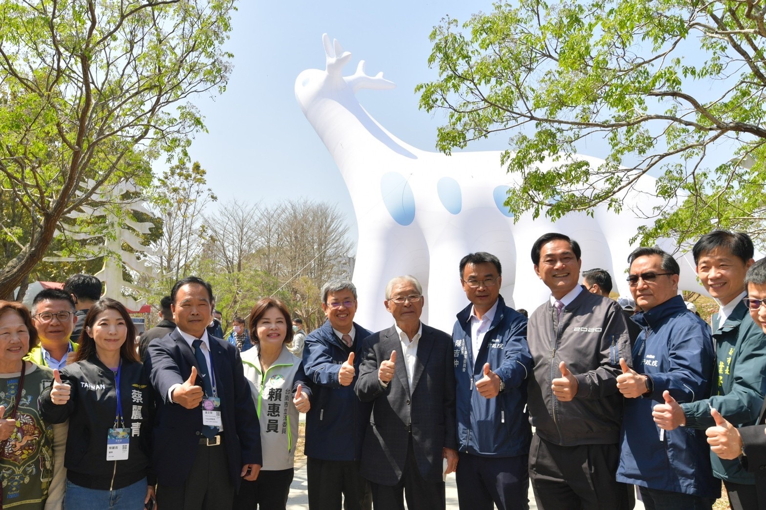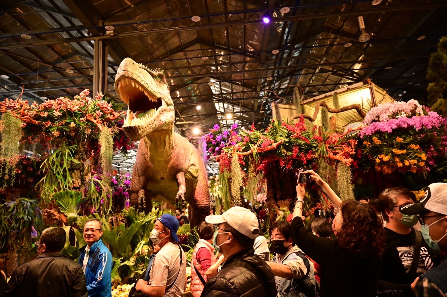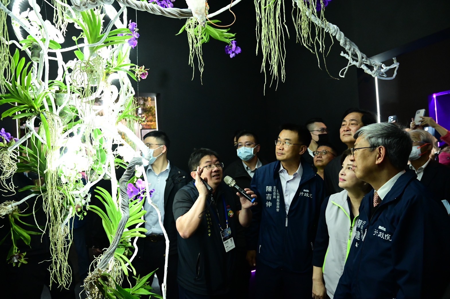 隨後,陳院長前往臺灣蘭花生物科技園區參觀「2023臺灣國際蘭展」,在臺灣蘭花產銷發展協會秘書長曾俊弼及主審陳澄鐘導覽解說下,逐一參觀主題館、競賽館及主題大道等展區,並觀賞蘭–起源、大彗星風蘭、蘭花鏡像、全場總冠軍花「五星上將」、蘭展吉祥物「Orchidsaur」蛇頸龍大型充氣裝置及生態系共生站裝置藝術等作品。