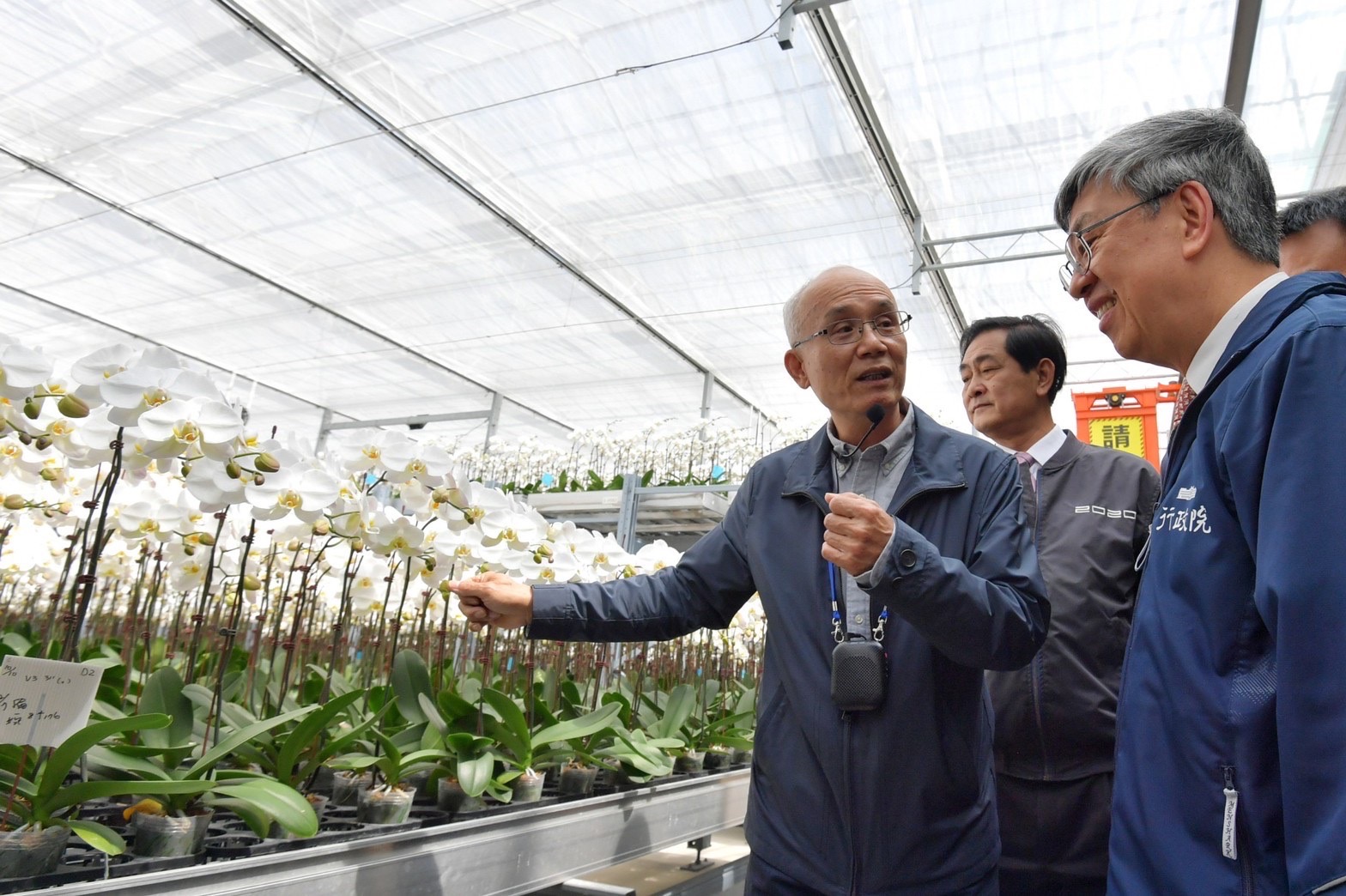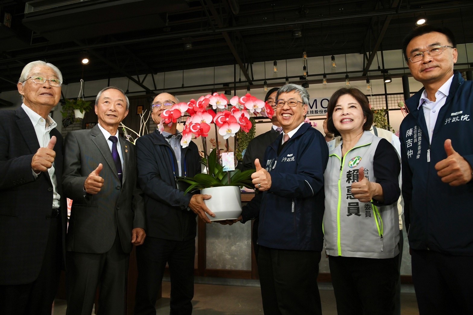 結束參觀後,陳院長也前往參訪世茂農業生技股份有限公司,並聽取創辦人黃崇德總監介紹該公司生產高品質蝴蝶蘭切花與採用奈米噴染蘭花技術,以及導入立體化栽培、全自動倉儲搬運及物聯網環境控制系統等智慧化作業流程。而該公司也開發生產土耳其國旗圖樣蘭花,以義賣捐款方式,表達對土耳其震災的關心。