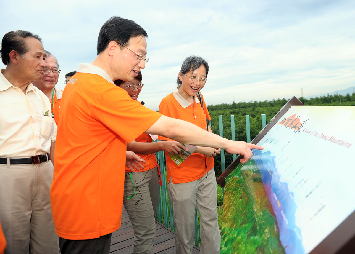 江院長於開園活動致詞後,親自參與植樹儀式,並步行參觀現場農林文創攤位。此外,江院長也參觀園區內的二峰圳地下堰堤集水廊道復刻版與生態池裝置藝術作品,隨後並前往遊客中心屋頂,瀏覽園區生態景緻。