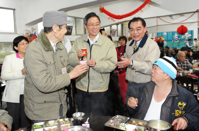 最後張院長與榮民長者一同圍爐共進晚餐。張院長除致贈加菜金及賀歲福袋,高舉酒杯祝福榮民長者新年快樂,並逐桌向榮民長者敬酒,對他們當年勞苦功高的貢獻表達敬意與謝意。