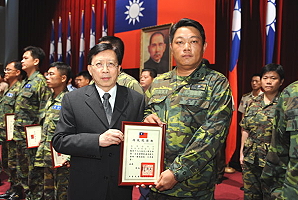 行政院長劉兆玄今(1)日下午在旗山第八軍團泰山營區頒獎表揚協助莫拉克颱風救災及復健工作的國軍官兵,對國軍弟兄全力投入救災行列,協助重建工作的辛勞表示慰勉。