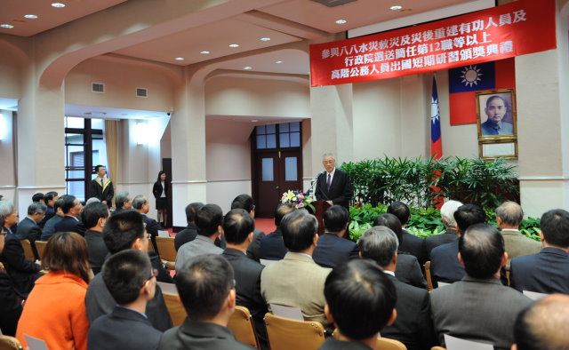 行政院長吳敦義今(3)日出席「參與八八水災救災及災後重建有功人員及行政院選送簡任第12職等以上高階公務人員出國短期研習頒獎典禮」時,感謝受表揚的同仁義勇搶救民眾的生命和財產有功,不僅讓國家和民間的損失降到最低,也使重建工作能夠步步落實,讓受災民眾能夠有安身之處。