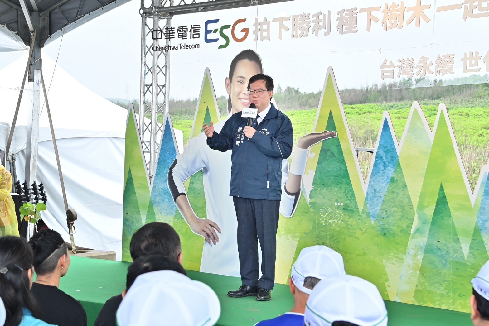 今日活動鄭副院長在全場歡迎鼓掌聲中進場,並與羽球天后戴資穎相鄰而坐交換意見。鄭副院長致詞並參與舞臺大合照後,則聽取林務局說明植樹步驟,隨後與今日共同參與植樹的貴賓:農委會主委陳吉仲、林務局長林華慶、中華電信董事長郭水義與公司主管等人共同種下樹木,最後全體於自己栽植的樹木前開心合影。