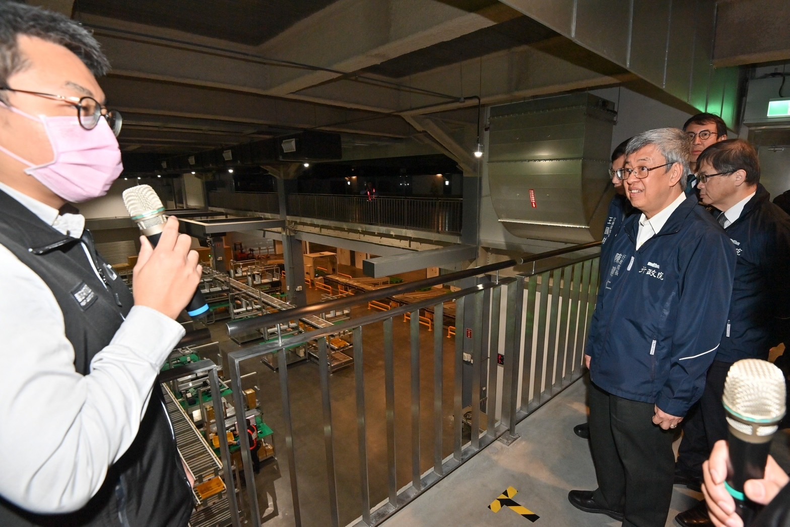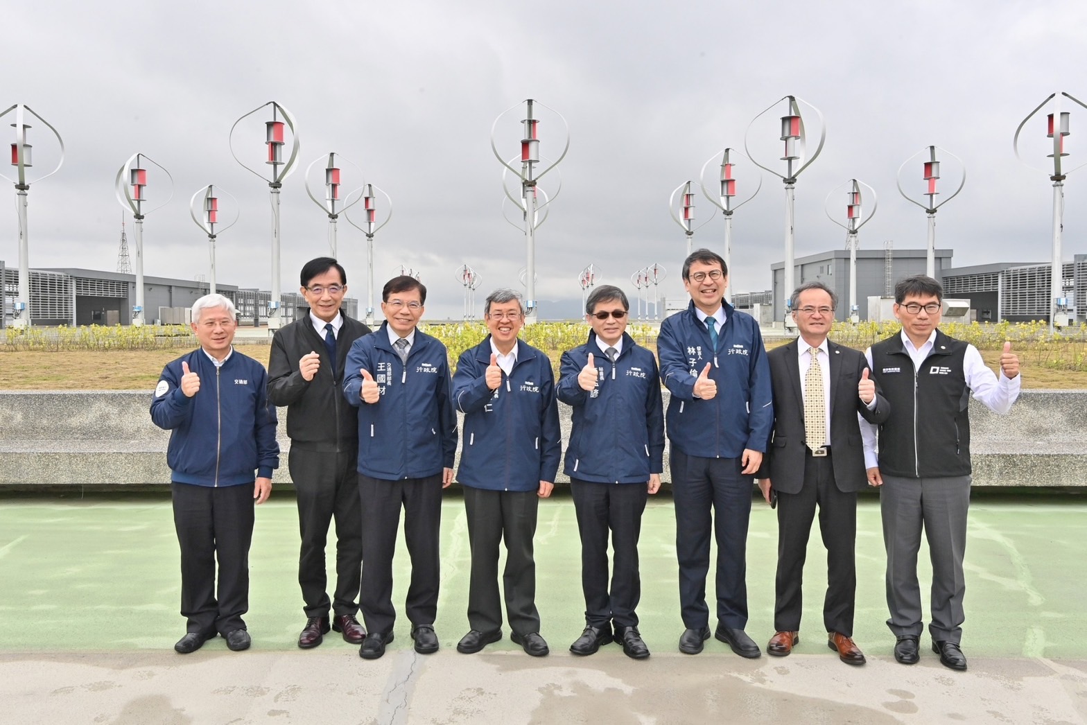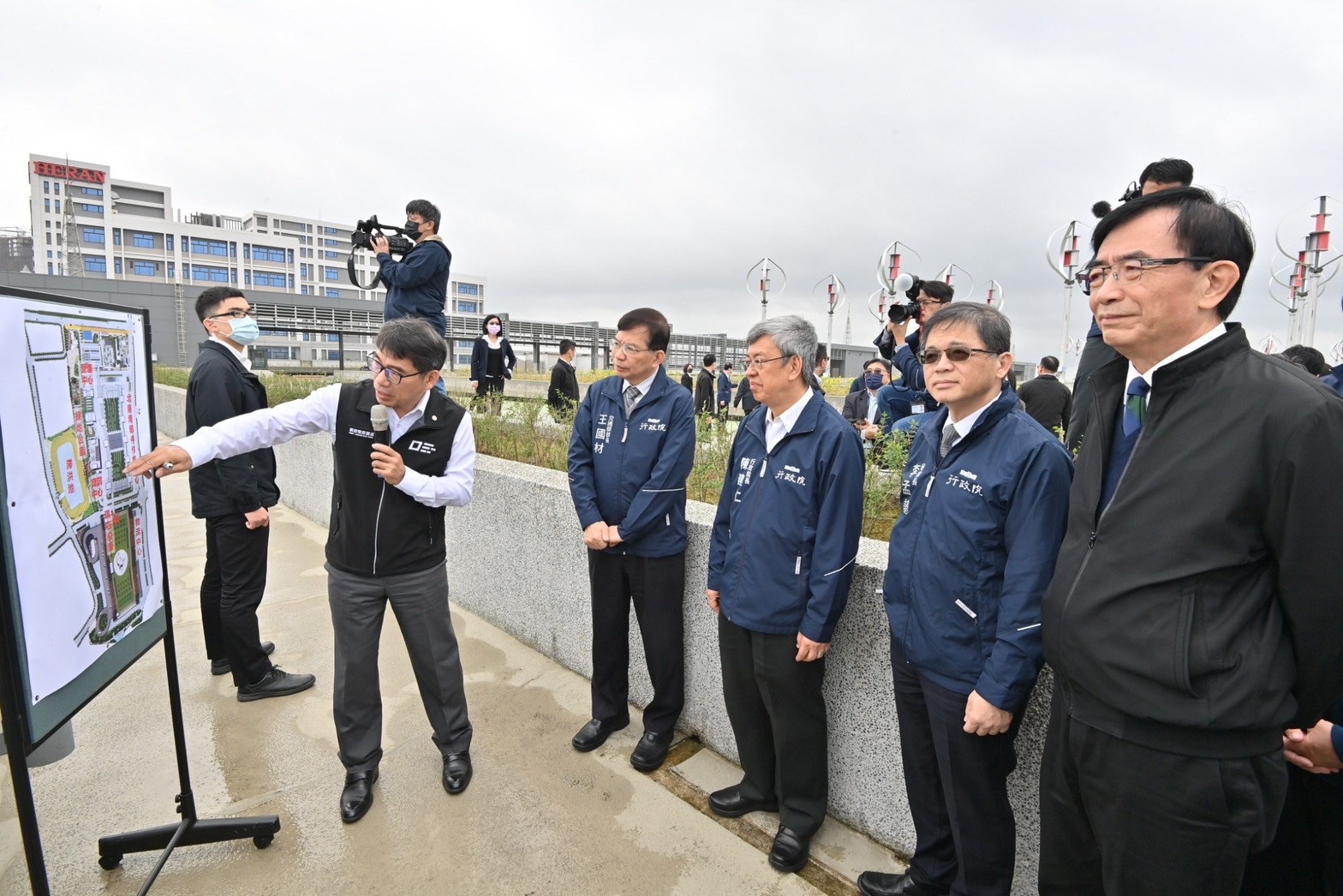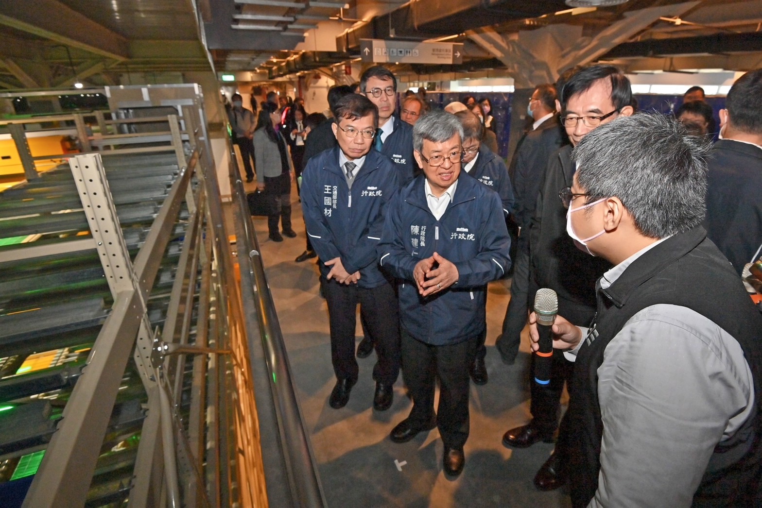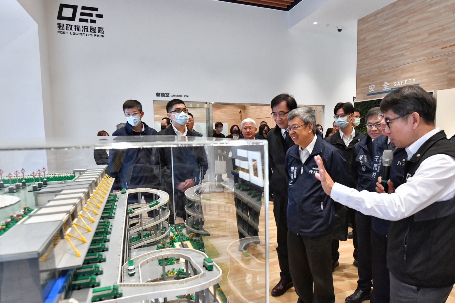 此行,陳院長先聽取中華郵政公司江瑞堂總經理簡報「郵政物流園區簡介及建物營運規劃說明」,並於致詞結束後,現地視察園區整體規劃模型、郵政自營倉儲單元、PChome承租倉儲單元,以及設置在頂樓的風力發電設施。最後,院長偕同行政院李孟諺秘書長、林子倫發言人、交通部王國材部長、中華郵政公司吳宏謀董事長、江總經理等貴賓一同合影留念。