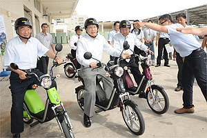 劉院長下午在益通光電並親自試乘該公司最夯的輕型電動機車繞行約二百公尺,對電動機車可以達到時速四十公里幾乎完全靜音的騎乘舒適感留下深刻印象,並肯定節能減碳的成果。