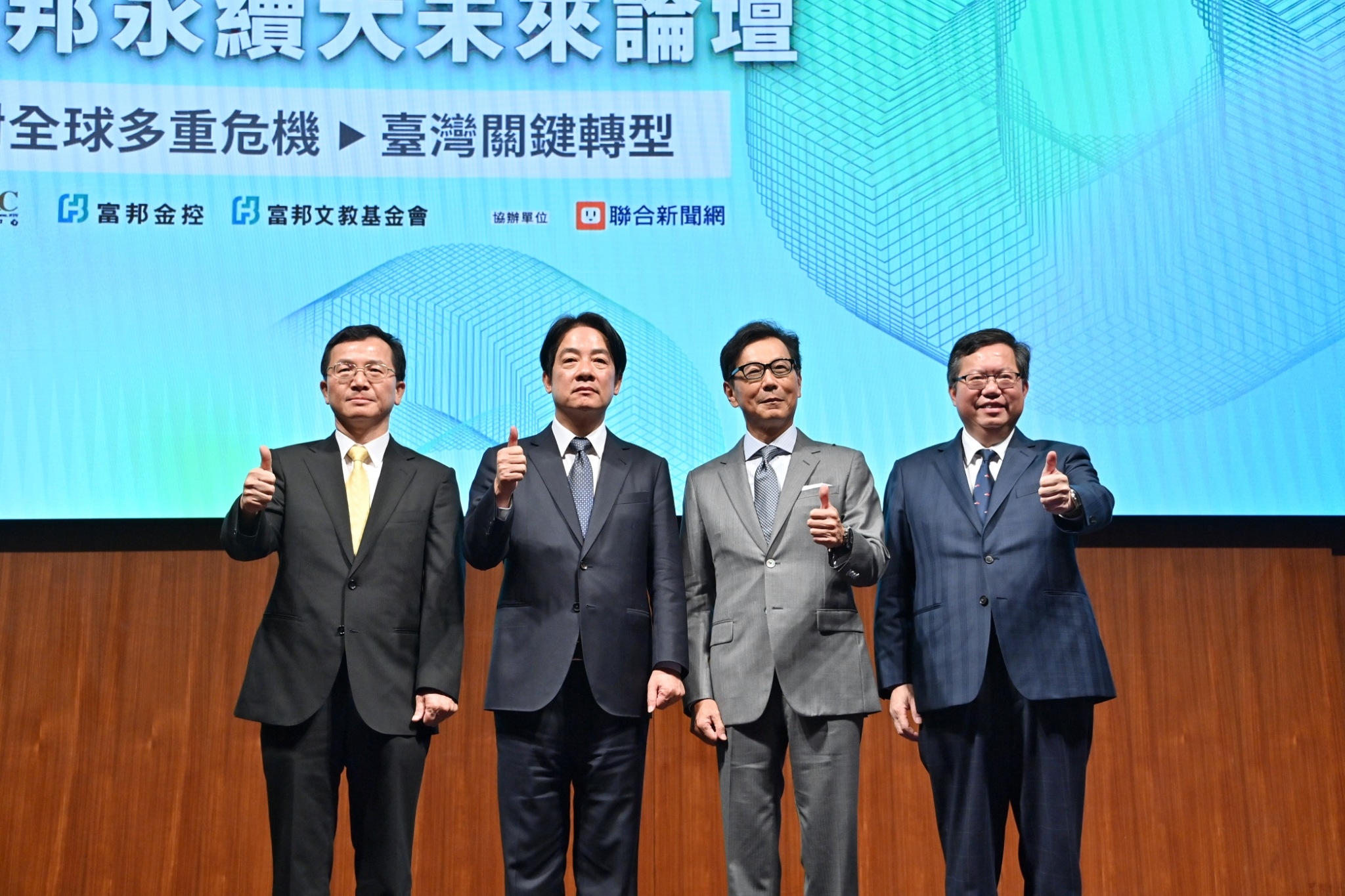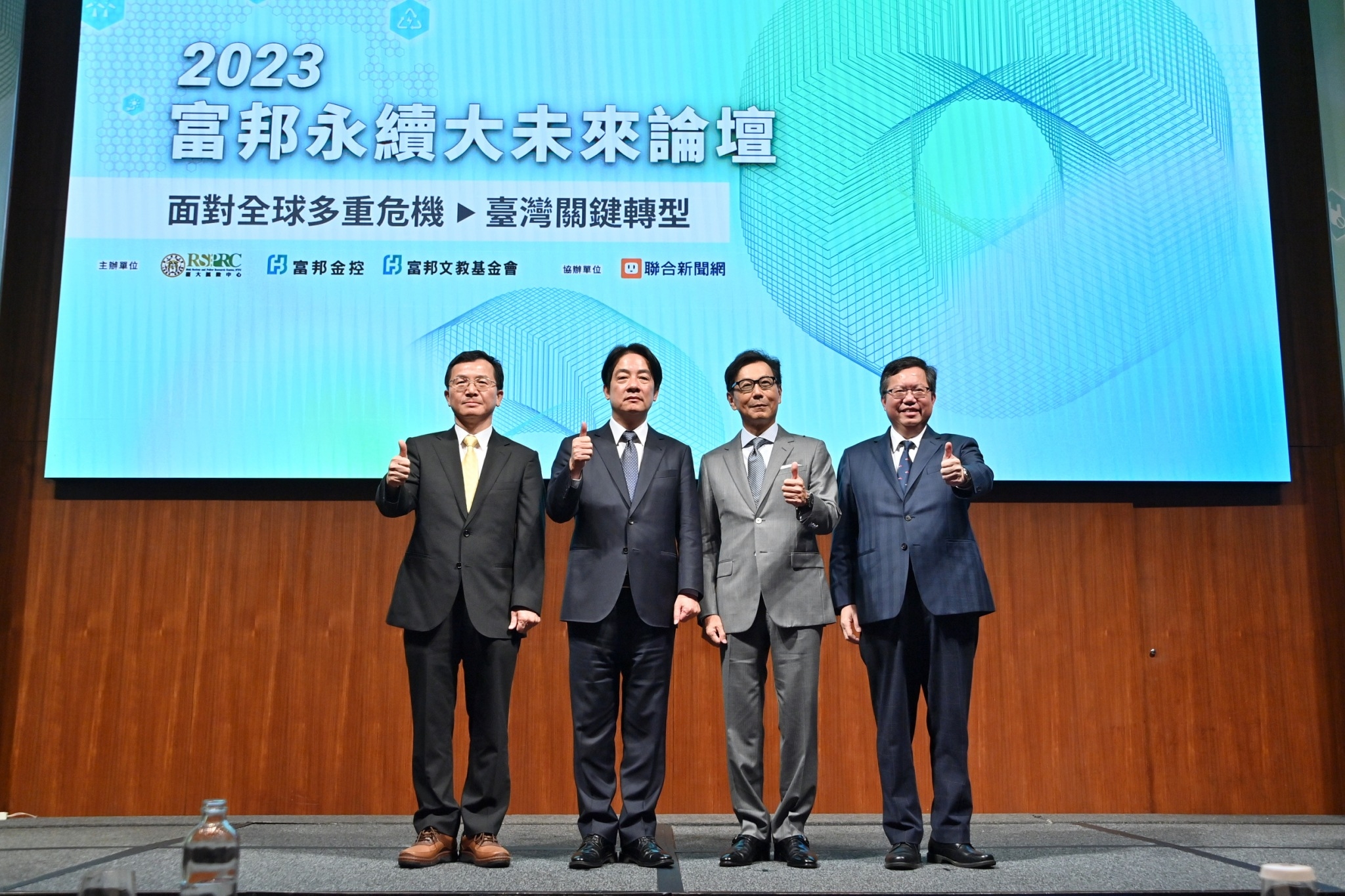 鄭副院長強調,行政院與各部會的態度一致,皆堅定朝淨零轉型的目標邁進,尤其賴清德副總統對此議題有相當深入的研究,從參與論壇、讀書會、訪查相關產業,到專家學者諮詢等,已為臺灣能源、產業政策及科技轉型做好準備並穩固基礎,相信政府能持續帶領臺灣積極達成淨零轉型的目標,打造臺灣成為更具韌性的國家。隨後,鄭副院長與賴副總統、富邦集團蔡明忠董事長、臺灣大學風險社會與政策研究中心周桂田主任等貴賓合影留念,為今日論壇揭開序幕。