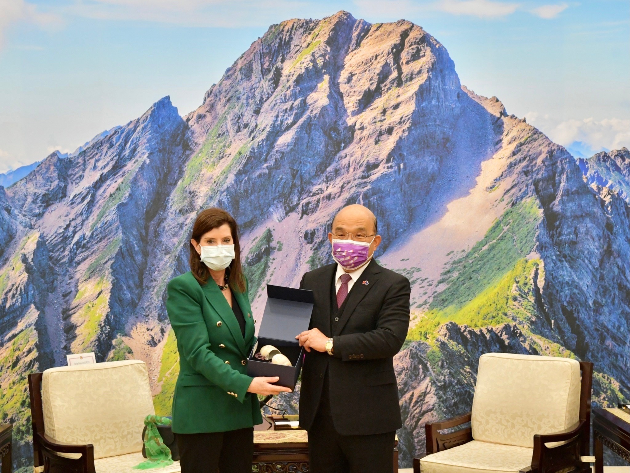 隨後,蘇院長回應訪賓談話表示,對於簽訂雙邊貿易協定一事,他深表認同,希望讓雙邊互利互惠。而面對專制極權、實行共產主義的中國,動輒違背國際貿易規範,以經濟力量干擾其他民主自由國家的貿易行為,強迫必須依循其制定的貿易規則運作,已有許多國家受害,譬如禁止澳洲葡萄酒、龍蝦進口中國,並刻意讓貨物在港口卡關、不加檢驗,導致龍蝦腐壞;而臺灣更是深受其害,近來包括鳳梨、水產品等均遭到禁止輸入。