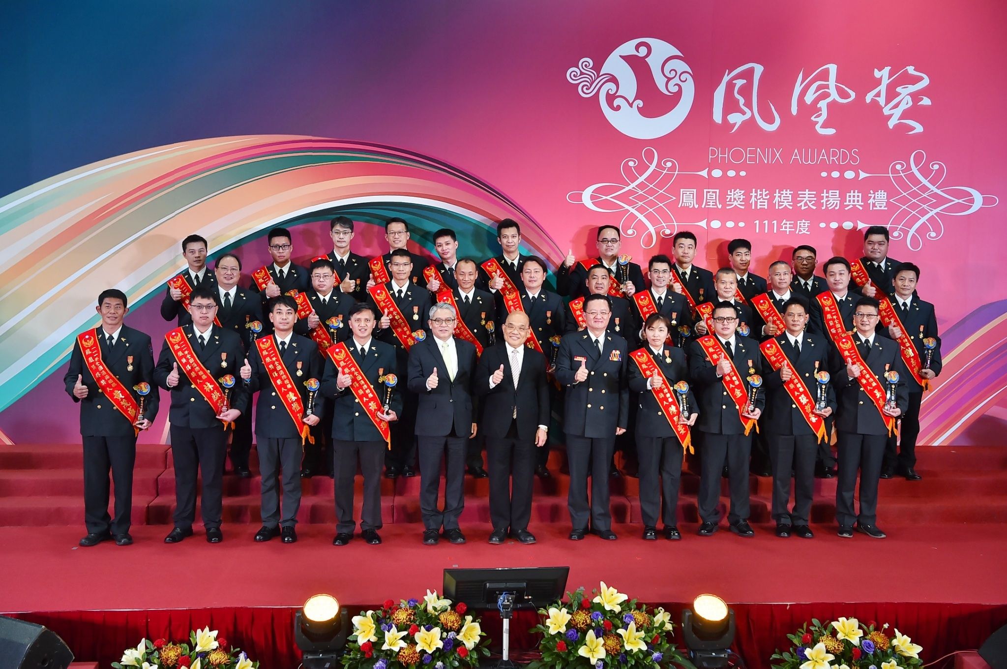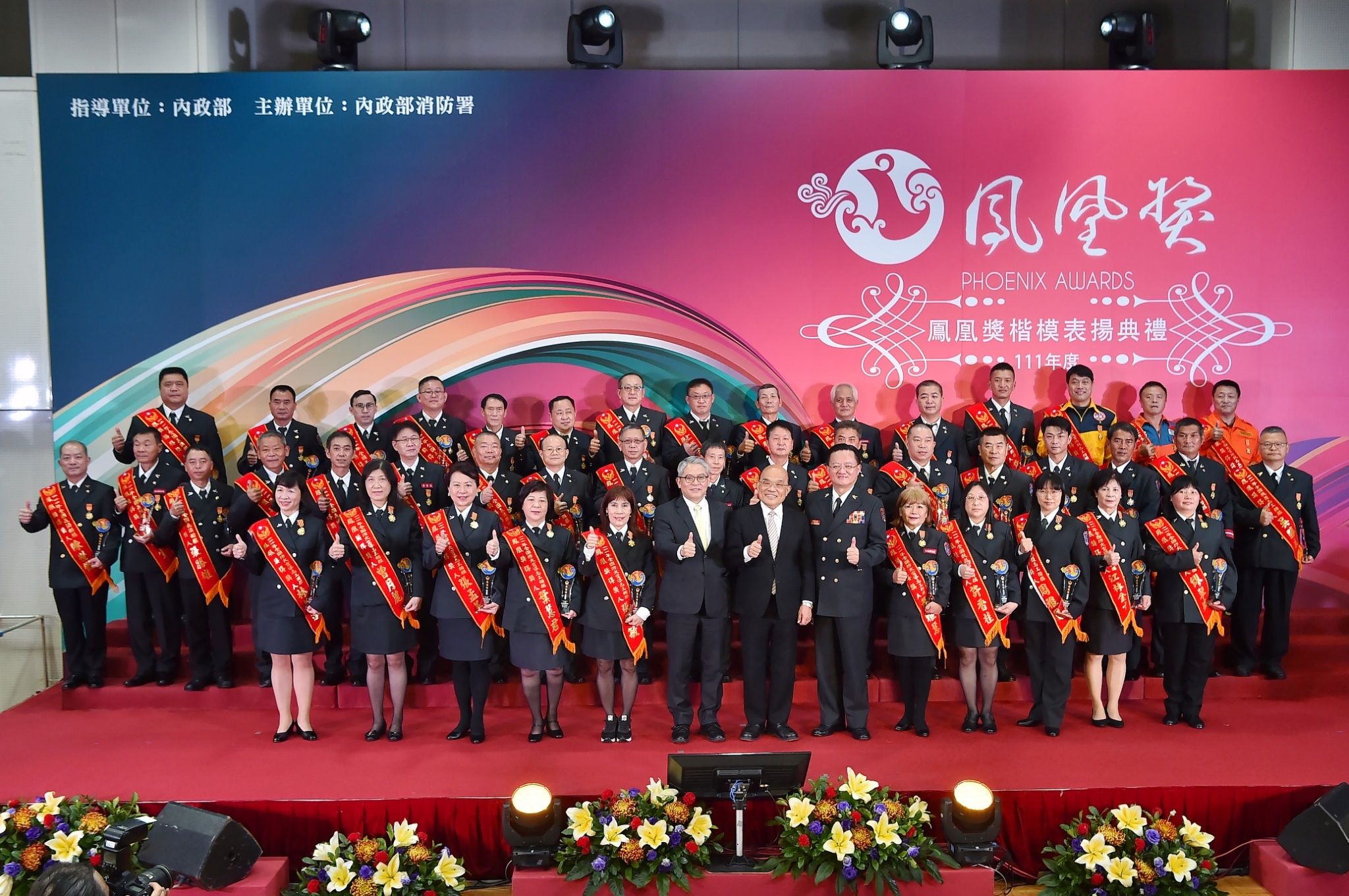 行政院長蘇貞昌今(10)日出席「111年鳳凰獎楷模表揚典禮」時表示,他代表政府親自頒獎,要向全國消防同仁及其家人致上最高謝意,並表達政府對消防工作的重視。而政府也展現最大誠意和能力,從方方面面給予消防同仁支持,包括修改法令、編列預算、提高薪資及津貼、更新車輛、補強機具與通訊設備、提供醫療照護等,讓所有同仁能夠做得更好、更安全。