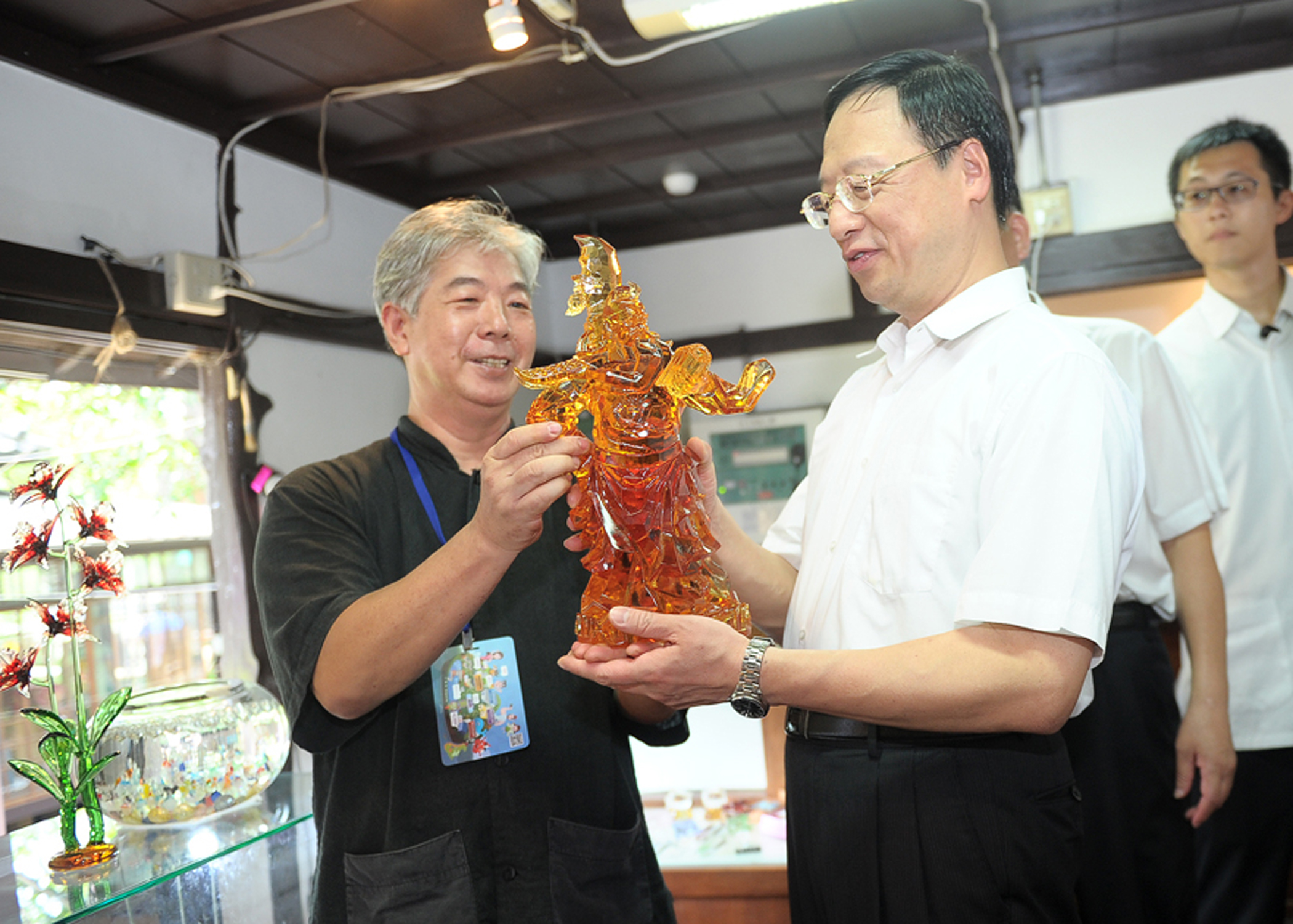 江院長表示,此行所參觀的玻璃工藝品不僅僅只是傳統工藝,更是結合人文、歷史、民俗等面向的作品,比如他所看到的本地植物造型或關公像等工藝品,都是藉由一件件的藝術品,彰顯出在地的文化特色。江院長並希望文化部、經濟部等中央部會,未來在推動文化創意產業政策時,能協助地方政府做得更好。