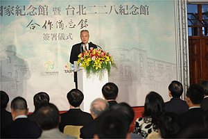 行政院長吳敦義今(26)日出席「二二八國家紀念館與台北二二八紀念館」合作備忘錄簽署儀式時,期許二二八國家紀念館在民國100年2月28日完成之後,和台北市的二二八紀念館有適當的分工,並成為撫慰二二八家屬心靈以及精神昇華的中心。
