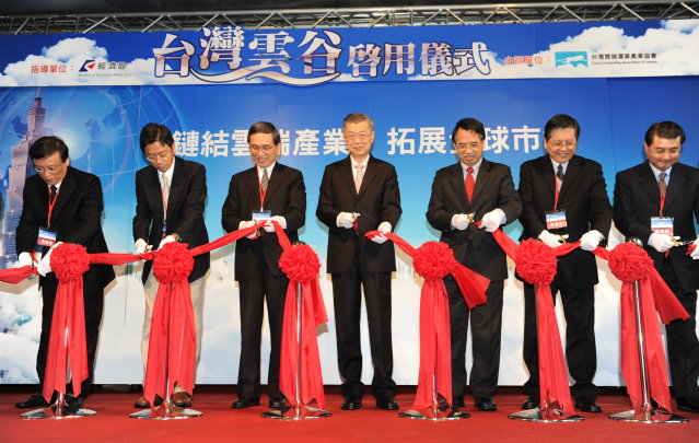 隨後,陳院長與行政院政務委員張善政、經濟部長施顏祥、研考會副主委宋餘俠、財政部次長徐仁輝與台灣雲端運算產業協會理事長呂學錦等人,共同為「台灣雲谷」展示中心的啟用剪綵,並與參展代表參觀台灣雲谷展示中心。