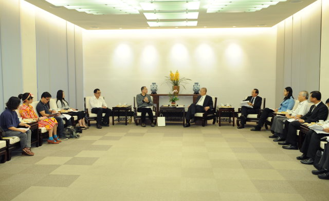 院長今日特地率同工程會主委范良銹及青輔會主委王昱婷等閣員,主動約見完成「海市蜃樓-台灣閒置公共設施抽樣踏查」一書的台北藝術大學教授姚瑞中及其學生,向他們請教拍攝過程的所見所聞,並用心聆聽他們對台灣閒置公共設施的意見。