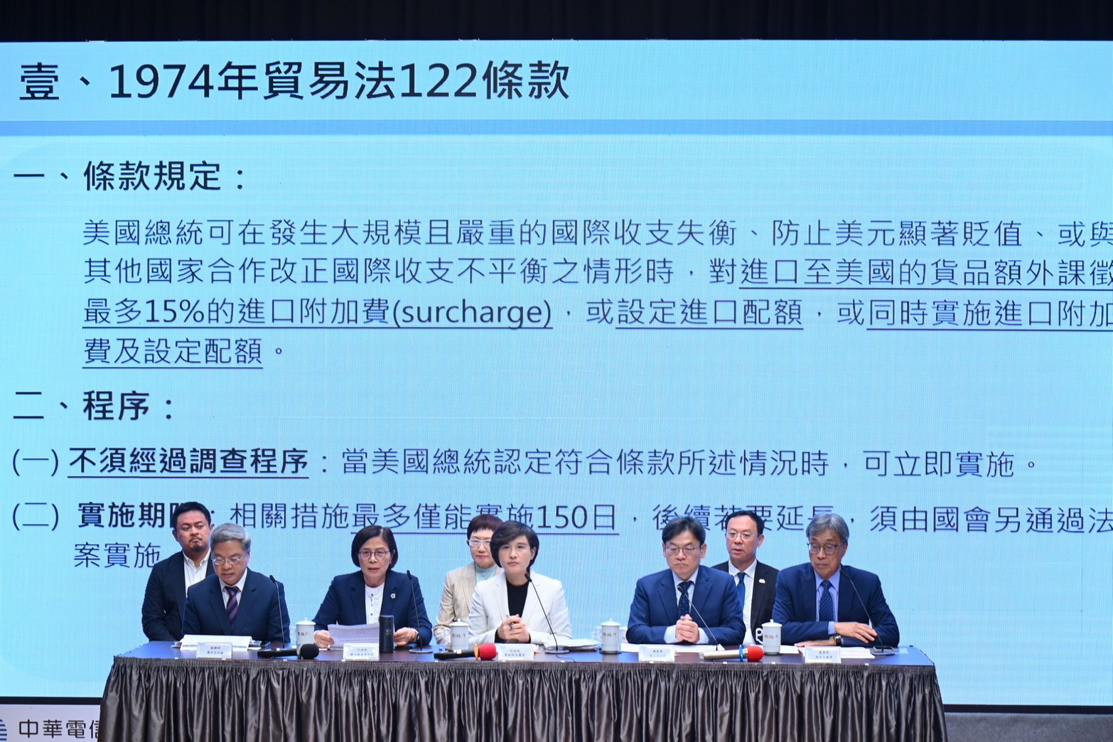 針對美方課徵對等關稅的法源依據,因判決而失效問題,鄭副院長表示,川普政府已立即公布新的行政命令,改採《1974年貿易法》122條款,在既有MFN稅率上加徵10%的附加費(暫時性稅率),「122條款」也載明此附加費為期150天,但必要時若經國會同意可以再延長。這項新的行政命令預先公布的時間,從美東時間今天凌晨12時,也就是臺灣時間今天下午1點開始對全球生效。不過,白宮公布的行政命令雖載明10%暫時性稅率,但不到24小時就提高至15%,因此目前政府是以「15%」來進行影響評估。同時,美國貿易代表葛里爾(Jamieson Greer)大使也隨即對外發表聲明,除了「122條款」之外,美方可能會依據《1974年貿易法》301條款對各國啟動貿易調查,未來將依據調查結果來決定是否對各國加徵關稅。