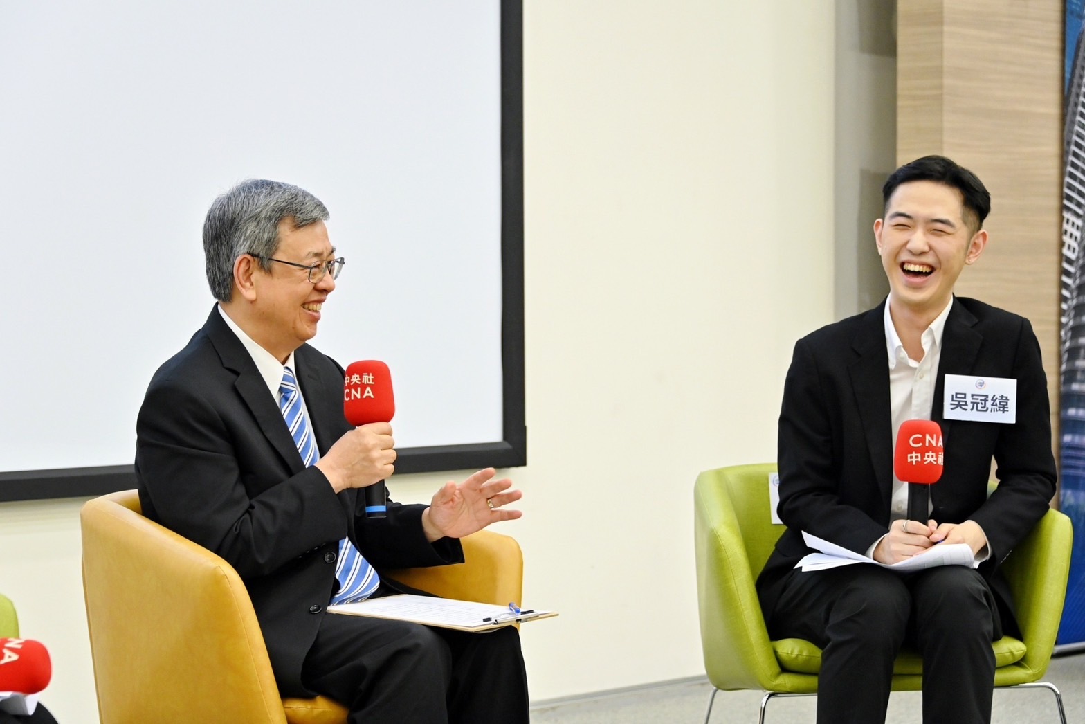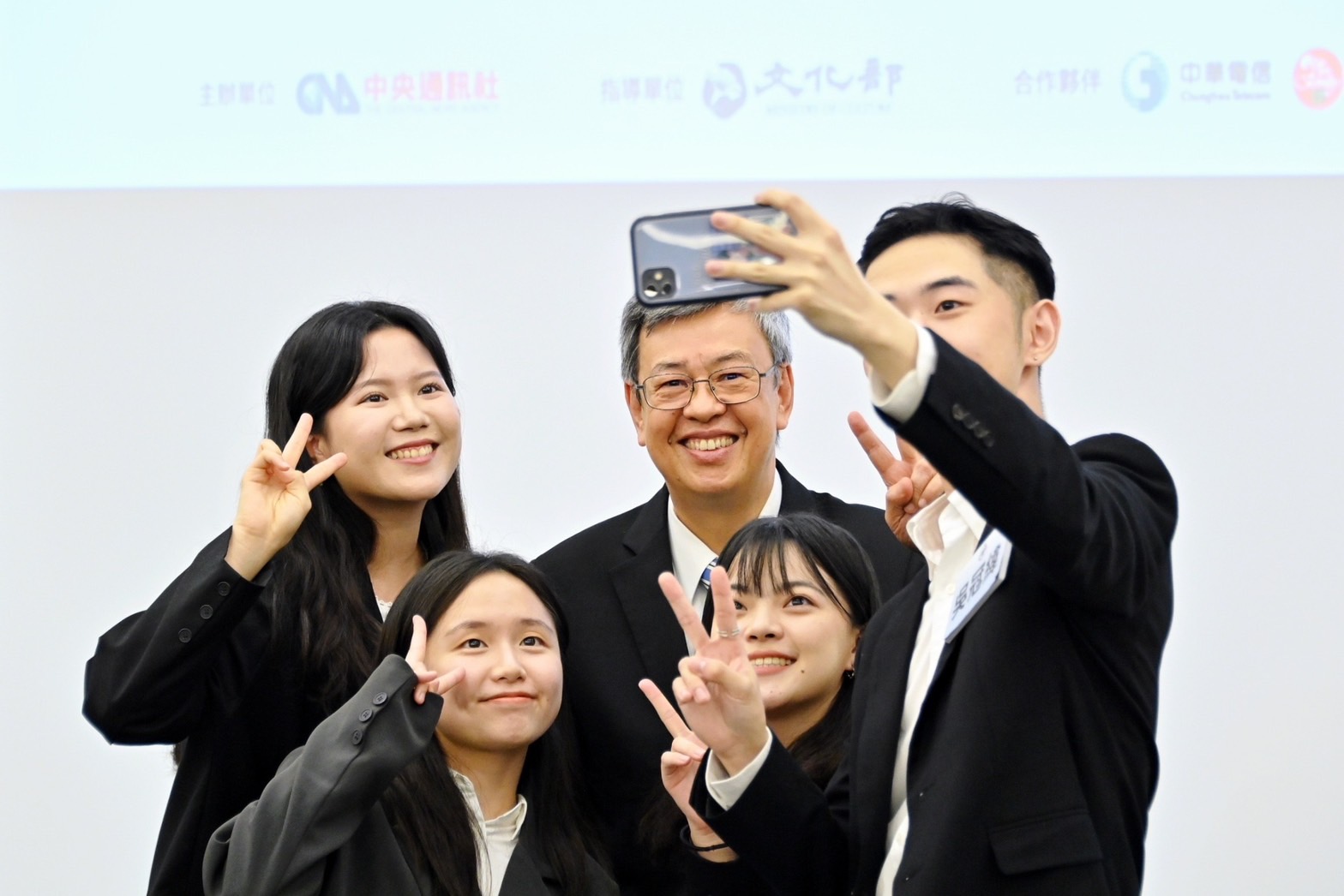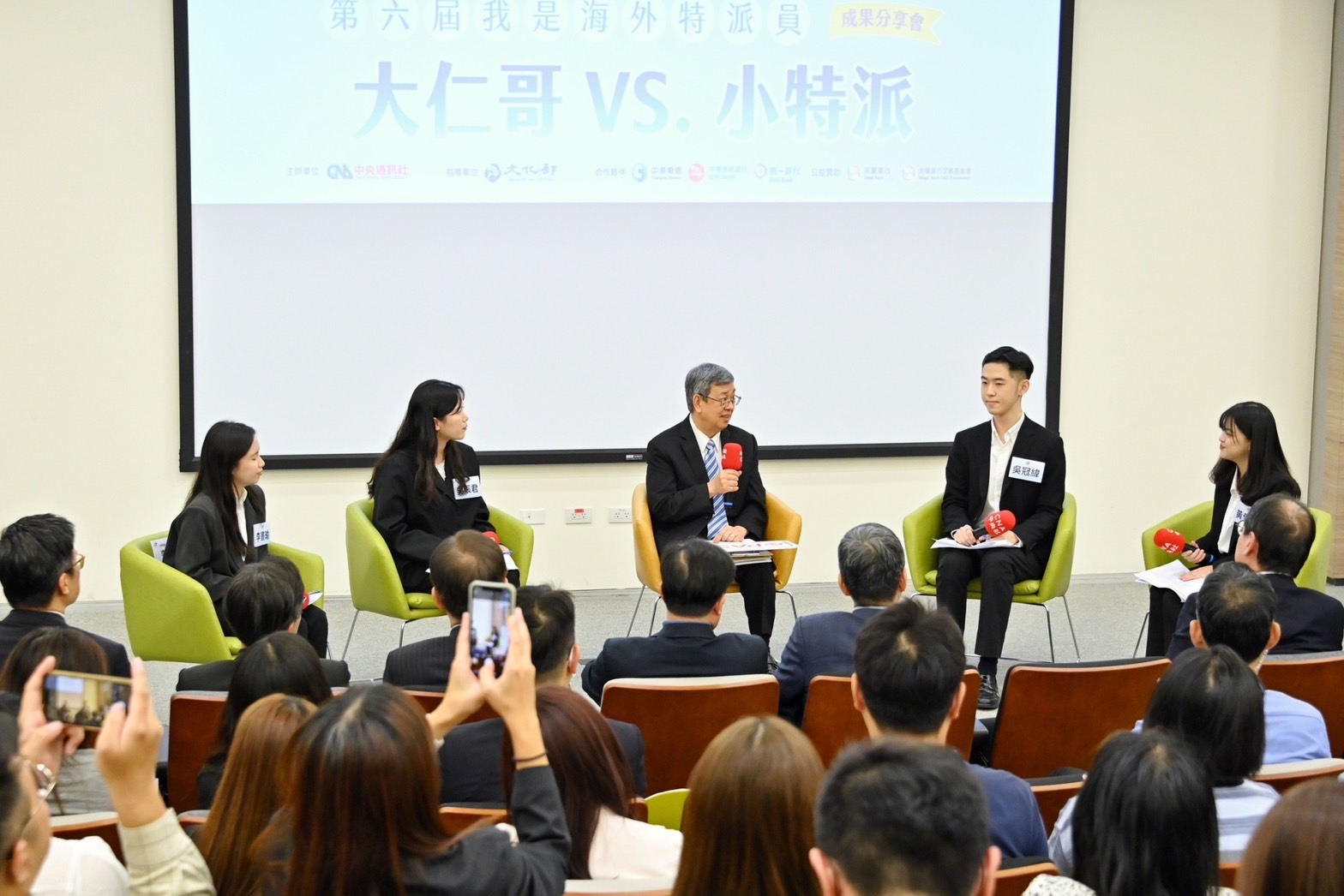 此行,陳院長到場入座後,手持「邁向國際」手板與行政院林子倫發言人、文化部徐宜君次長、中央社李永得董事長、曾嬿卿社長等貴賓合影留念,並觀賞「小特派海外奇幻旅程」成果影片。