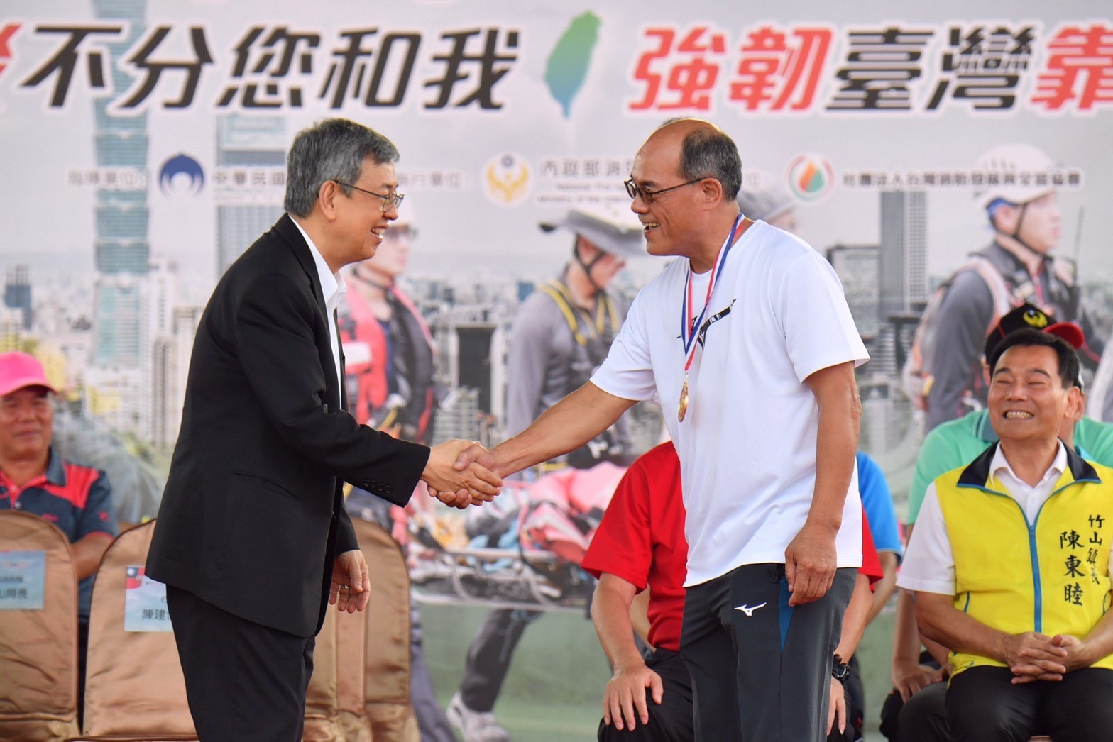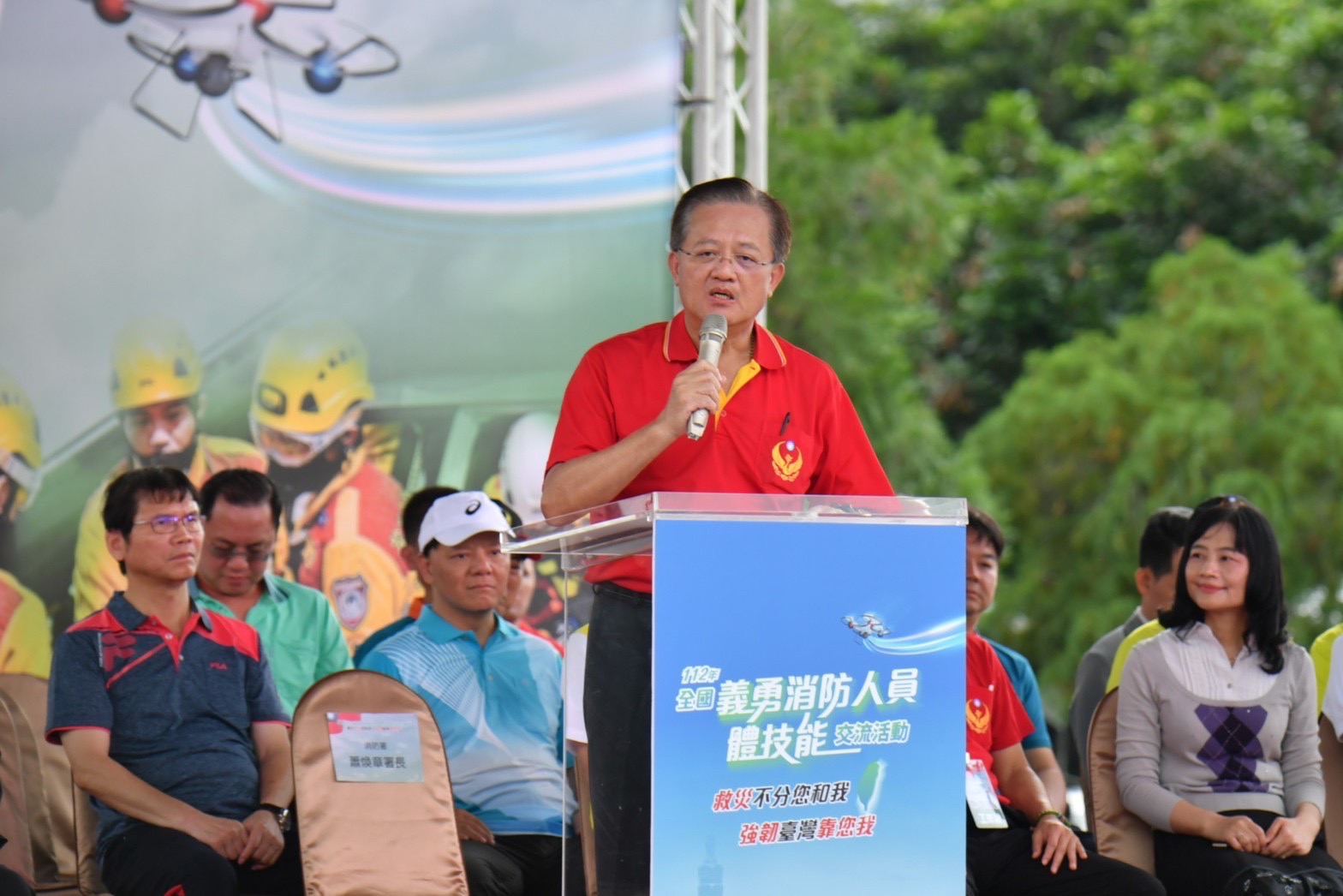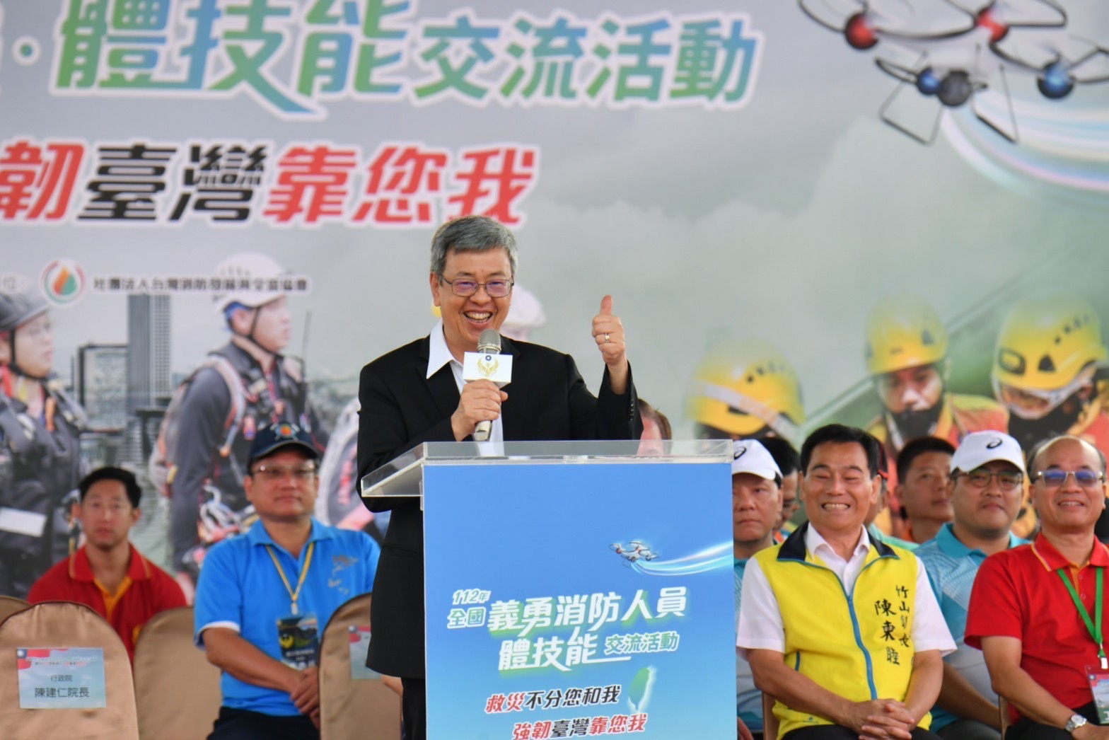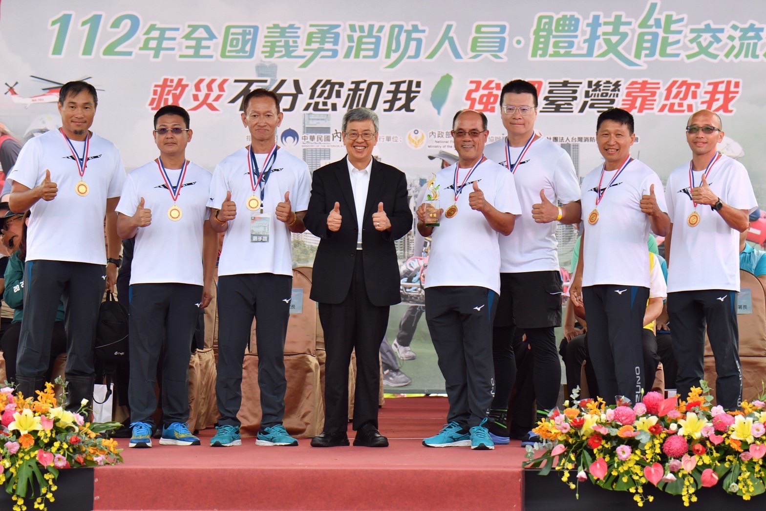 陳院長指出,今日參加全國義消人員體技能交流活動的義消兄弟姐妹們,都是各縣市的體技能菁英,大家團結一心、奮勇向前的努力精神,令他相當感動,每一位都是他心目中的總冠軍。院長表示,不論地震、颱風、土石流、火災、山搜、水域救援等,皆能看見義消及消防同仁英勇救災的身影,讓民眾能夠安心,身家安全也獲得保障,甚至在國際發生重大災害時,義消及消防特搜人員亦總是第一時間趕赴馳援,讓全世界看見臺灣的貢獻。他要代表政府向所有在第一線冒險犯難,進行救災救難工作,展現大愛、無私奉獻的所有義消及消防人員,表達最高的敬意與謝意。