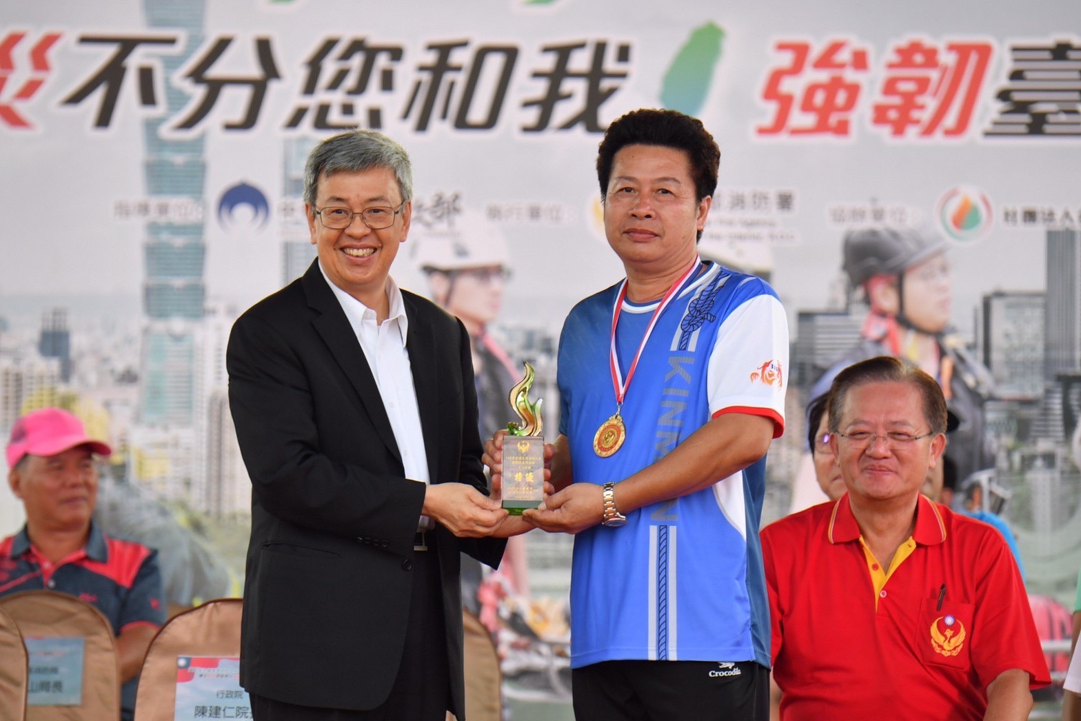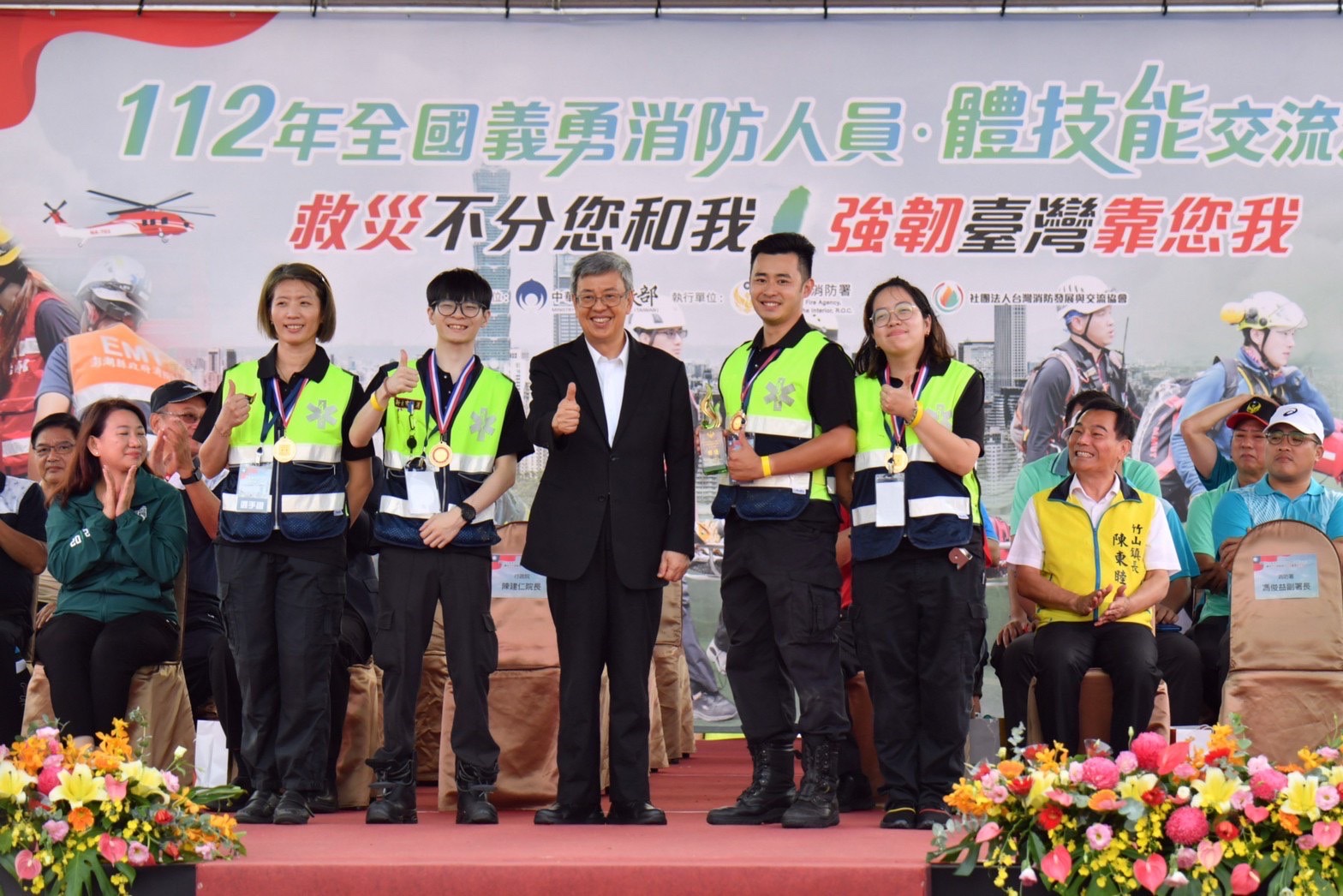 致詞結束後,陳院長逐一頒發「火災搶救」、「車禍救援」、「救護技術」、「無人機運用」及「繩索救援」特優獎項獎座予16組、107位獲獎義勇消防人員;隨後,院長與行政院林子倫發言人、內政部消防署蕭煥章署長、羅美玲立法委員、蔡培慧立法委員、台灣消防發展與交流協會蔡世寅秘書長、南投縣竹山鎮陳東睦鎮長等貴賓與全國126隊義消人員參賽隊伍大合影,場面熱絡。