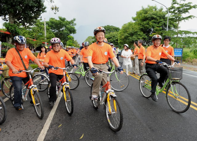 行政院長江宜樺今(9)日出席臺東鹿野鄉單車逍遙遊暨自行車道整體路網宣傳活動記者會及自行車體驗活動,和年輕學子一起騎乘自行車。江院長鼓勵所有年輕人在成年之前進行環島單車之旅,用騎單車的方式認識臺灣這片土地,和各地民眾交流互動。