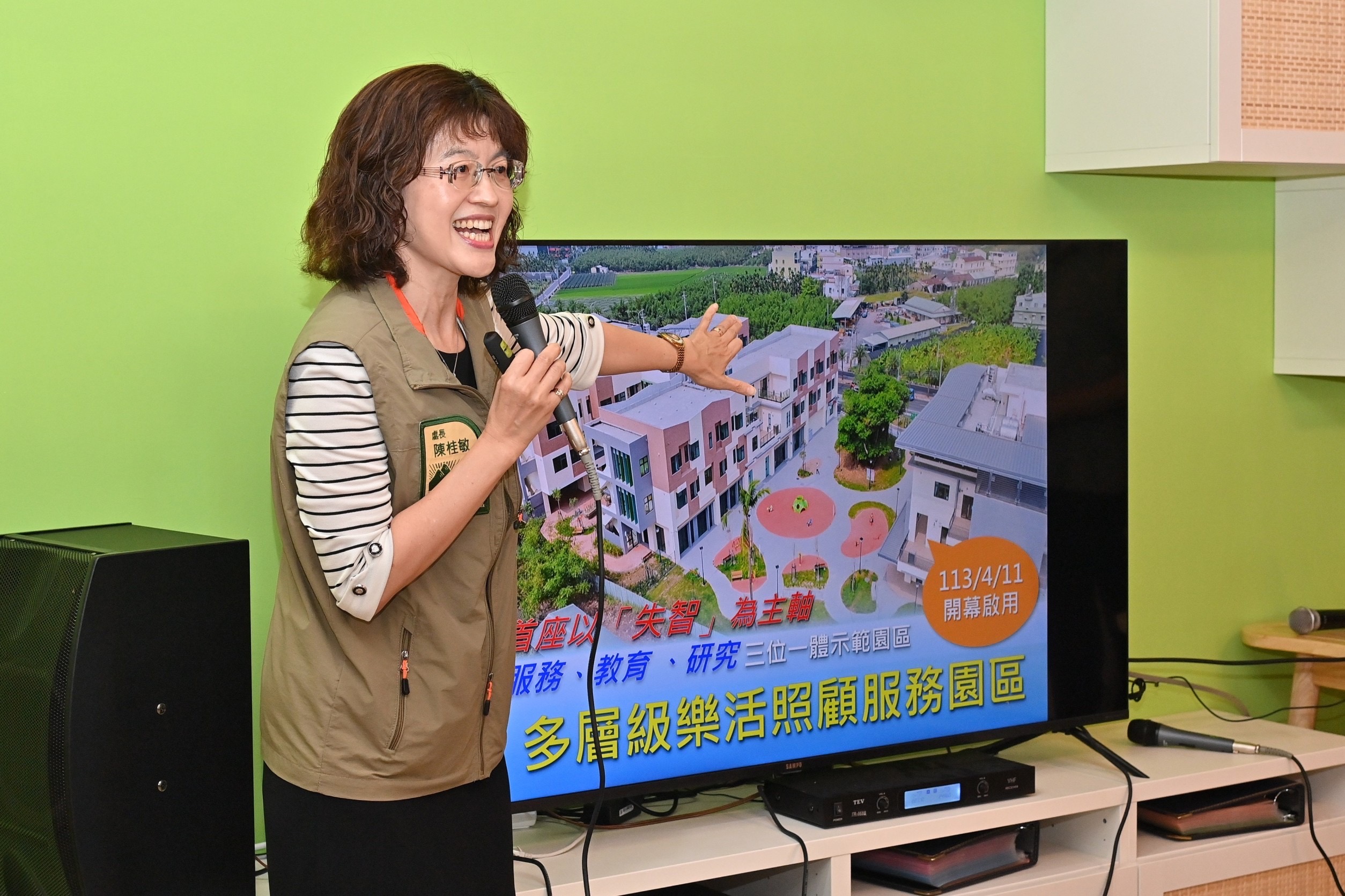 此行,卓院長到場後,首先聽取屏東縣政府長期照護處陳桂敏處長說明「多層級樂活照顧服務園區簡介」簡報,瞭解全國首座結合服務、教育、研究三位一體服務,以照顧失智者為主軸的示範園區營運現況。陳處長於簡報時表示,多層級樂活照顧服務園區工程經費總計約4億1,500萬元,衛生福利部補助1億5,460萬元,屏東縣公彩基金補助5,000萬元與縣府自籌2億1,027萬元,在多方協助下,讓縣政府得以推動屏東縣第一處具複合式照護及社區共融的服務園區。陳處長進一步指出,園區預計在開放營運後住宿收案數陸續將達到第1年25人、第2年60人、第3年76人,並規劃提供開放床位數10%配合公費或短期緊急安置,以及提供70%開放床位數予設籍屏東的縣民優先使用。