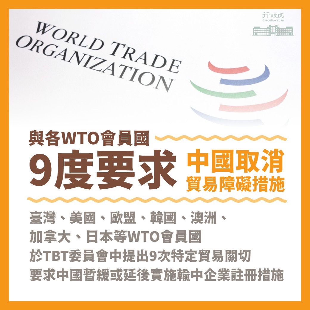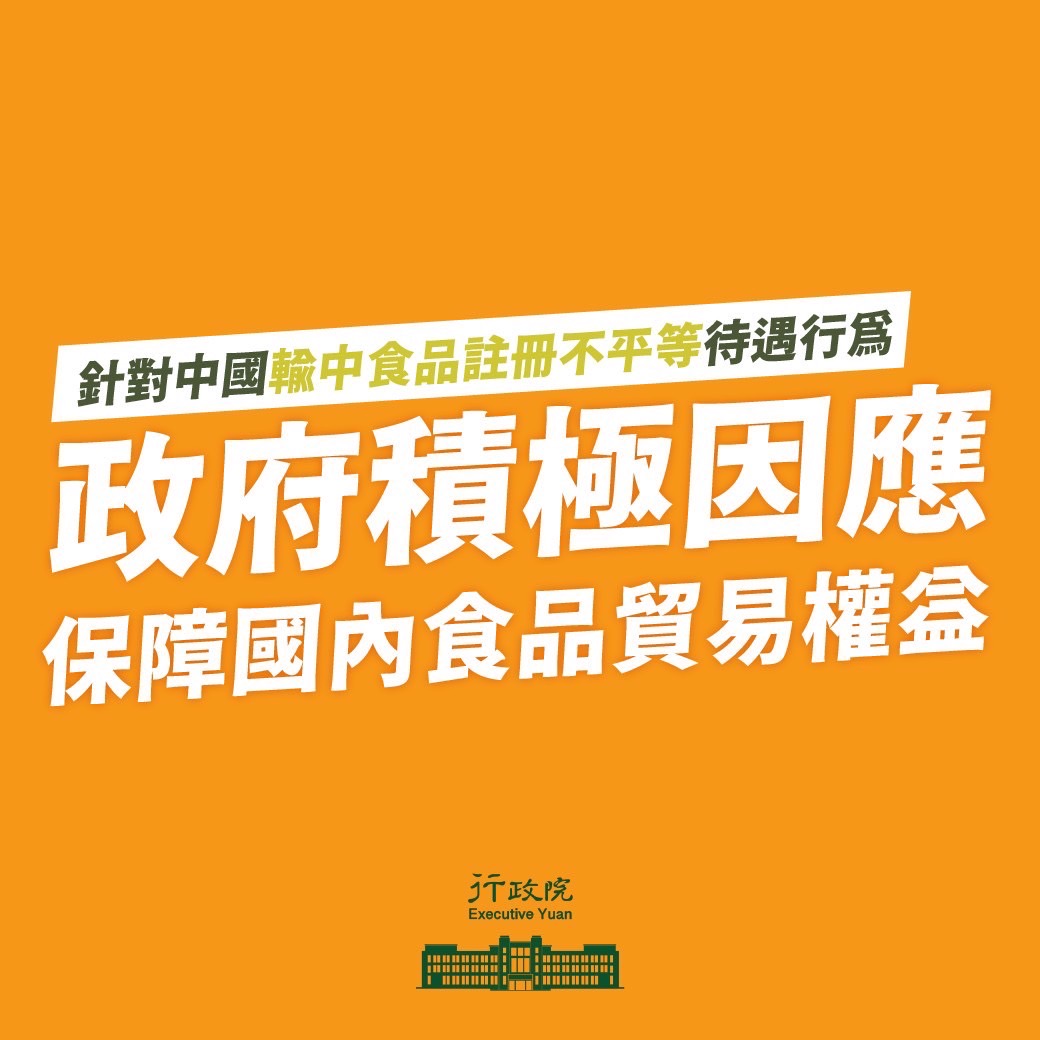 針對中國海關總署網站近來將我國部份食品企業標註暫停進口,行政院發言人羅秉成今(10)日表示,中國自2019年11月提出《進口食品境外生產註冊管理規定草案》,我國與各國咸認該規定實為貿易障礙。自2020年2月技術性貿易障礙(TBT)委員會第80次例會至今(2022)年11月第88次例會為止,我國與美國、歐盟、日本等WTO會員已9次提出特定貿易關切,共同訴求中國暫緩或延後實施規定。