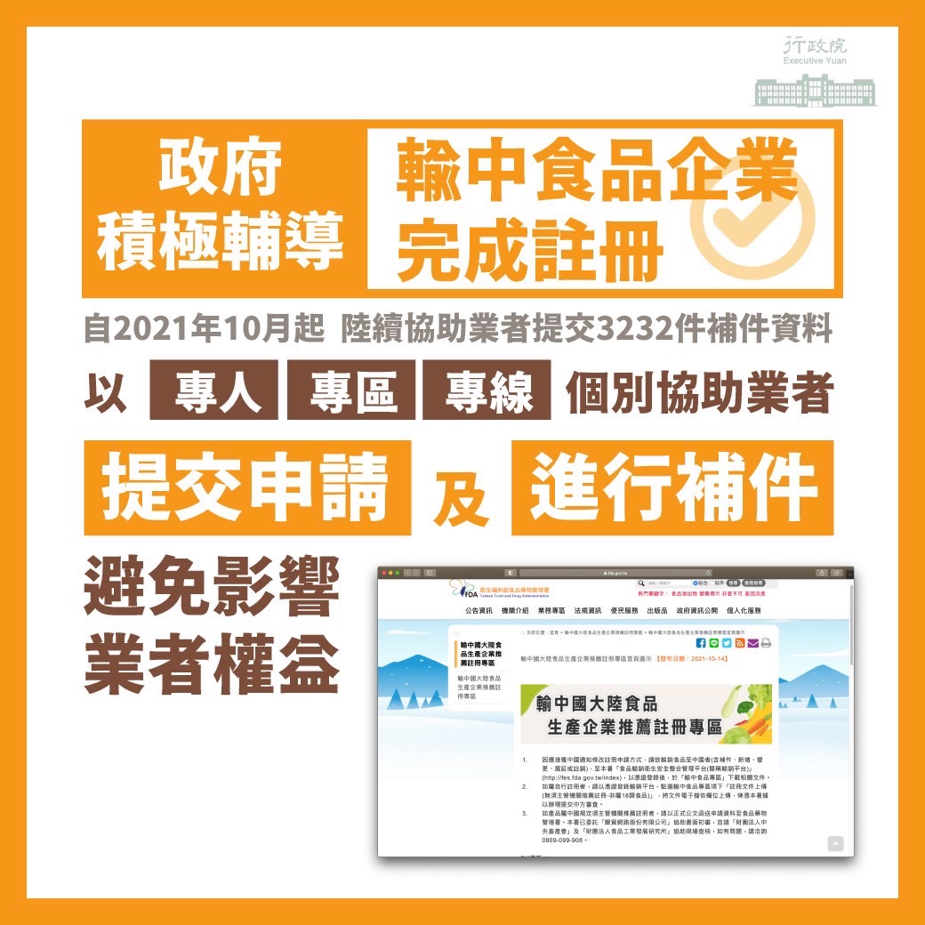 羅秉成指出,衛福部、經濟部、財政部及農委會等相關部會,已積極輔導業者進行註冊申請,透過專區(食藥署官網的輸中專區,提供註冊作業流程及常見QA)、專線(設置電話諮詢專線0809-099-908)、專人(業者註冊文件由專人透過兩岸窗口遞交)等方式,協助個別業者提交註冊申請及進行補件,更委託具食品專業背景之機構進行業者實地查核及輔導,以避免影響業者權益與輸中食品貿易。自2021年10月起,陸續協助業者提交3232件的補件資料,目前合格註冊792件,2409件被中國視為不合格且未告知理由,其他31件自行註銷。
