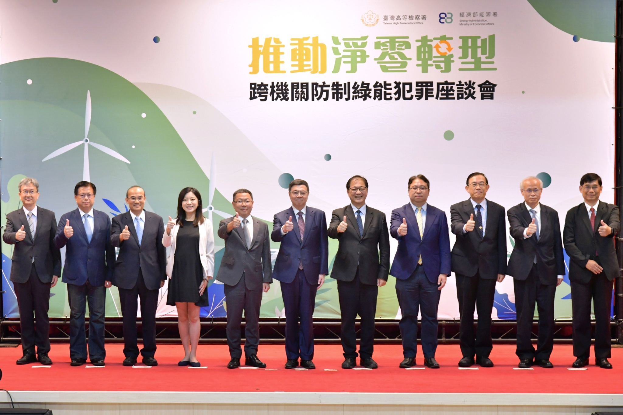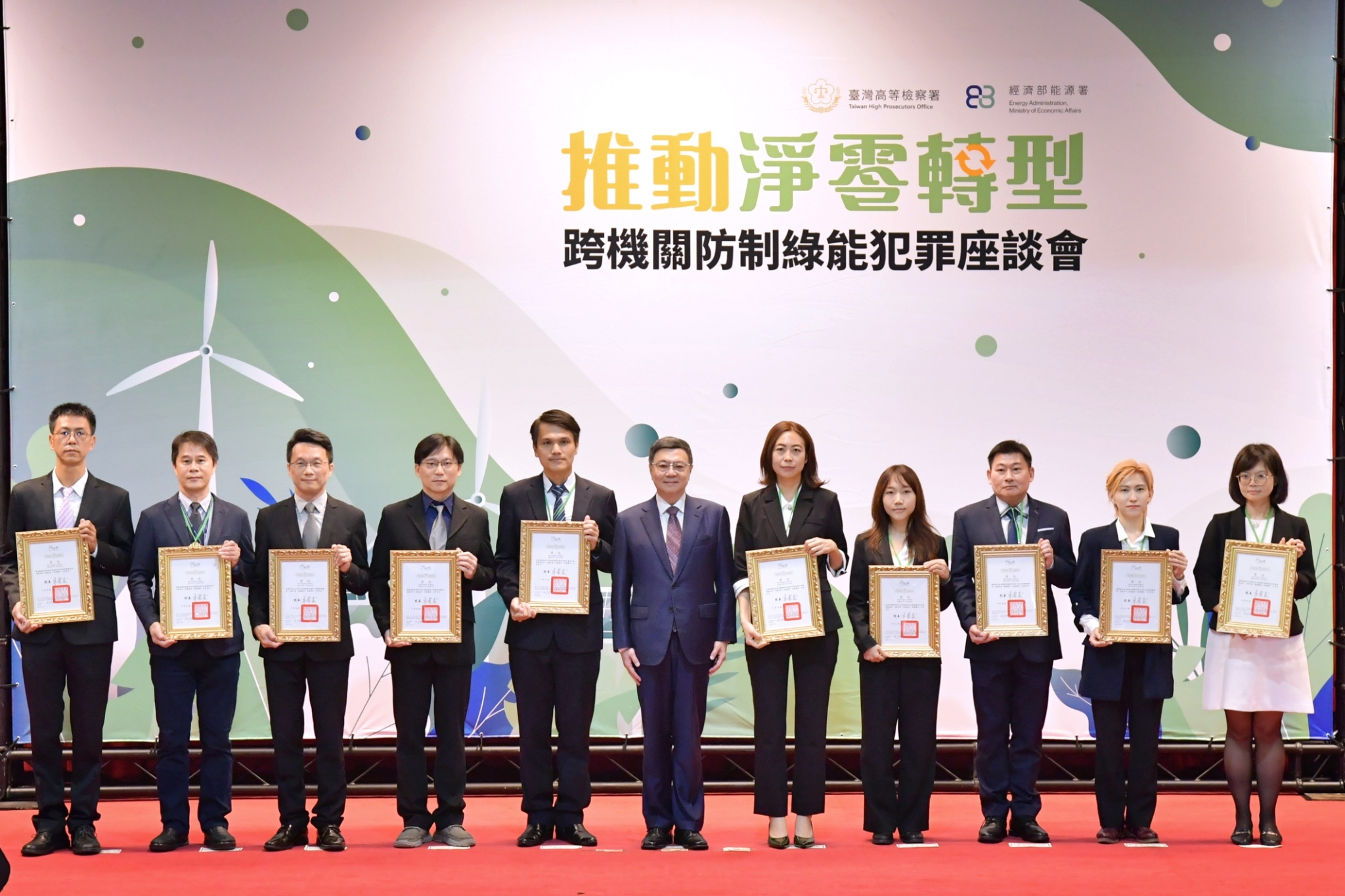 隨後,卓院長逐一頒發獎狀予10位偵辦、防制綠能犯罪及推動能源轉型有功人士,並與行政院林明昕政務委員、謝子涵副發言人、法務部鄭銘謙部長、黃世杰次長、最高檢察署邢泰釗檢察總長、臺灣高等檢察署張斗輝檢察長、廉政署沈鳳樑副署長、農業部黃昭欽次長、經濟部連錦漳次長、能源署李君禮副署長、台灣電力公司王耀庭總經理等貴賓合影留念。