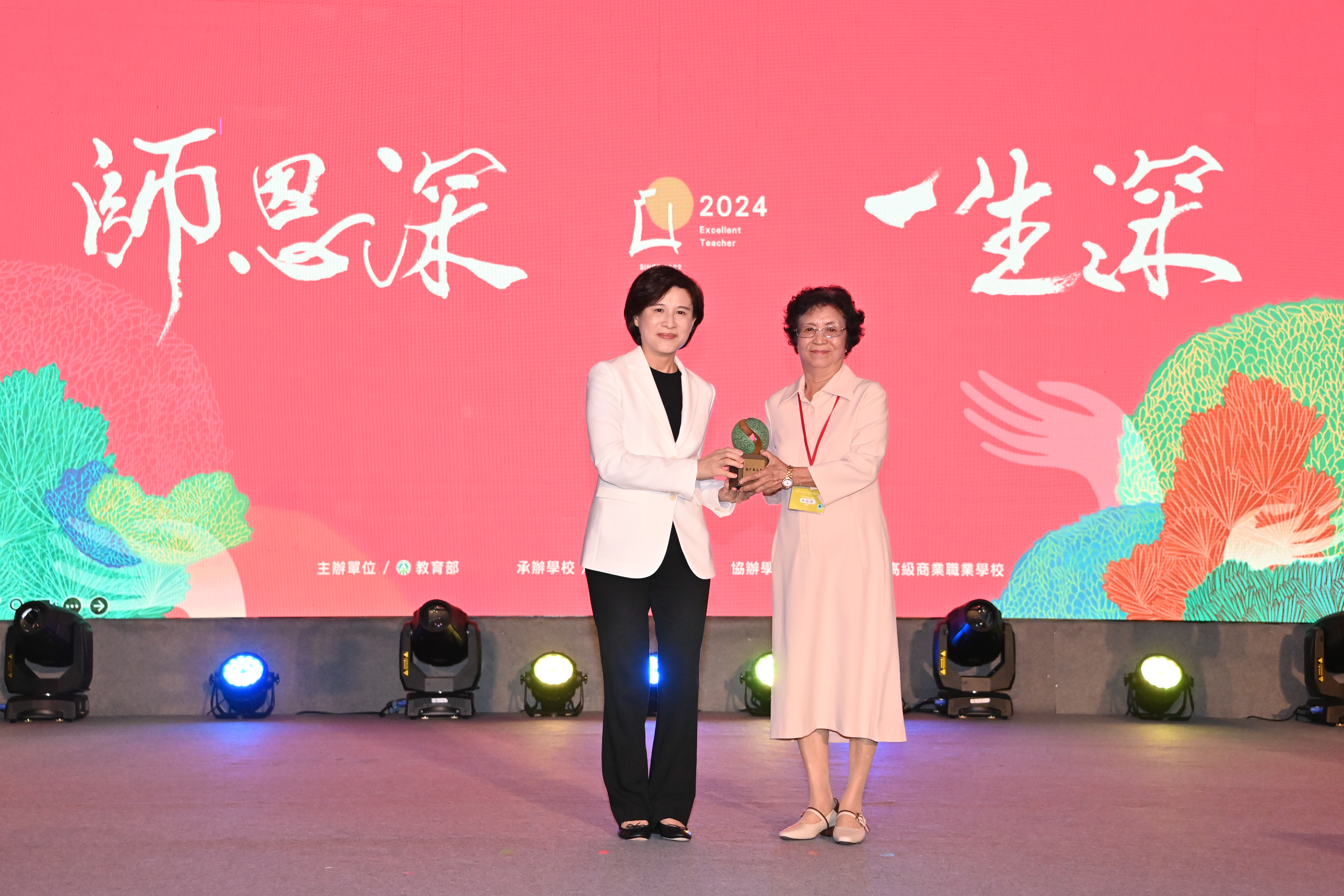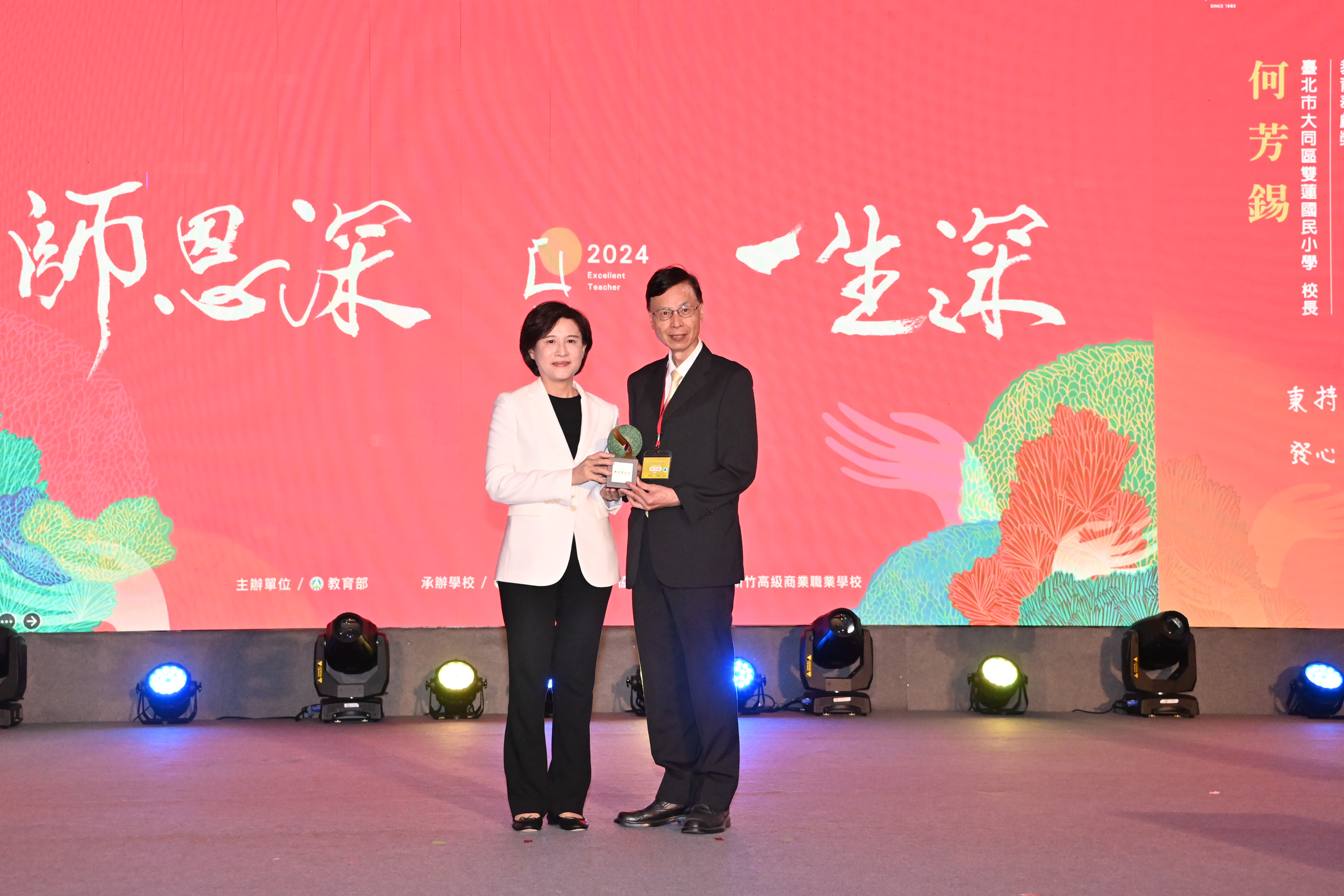 此行,鄭副院長到場後,首先欣賞台中少兒阿卡人聲樂團表演,並在致詞結束後,逐一頒發教育奉獻獎獎座予20位獲獎者,並合影留念;隨後,鄭副院長與教育部鄭英耀部長陪同賴清德總統分別與「教育奉獻獎」、「資深優良教師」及「師鐸獎」得主及其寶眷合影留念,並與所有獲獎教師共進午宴。